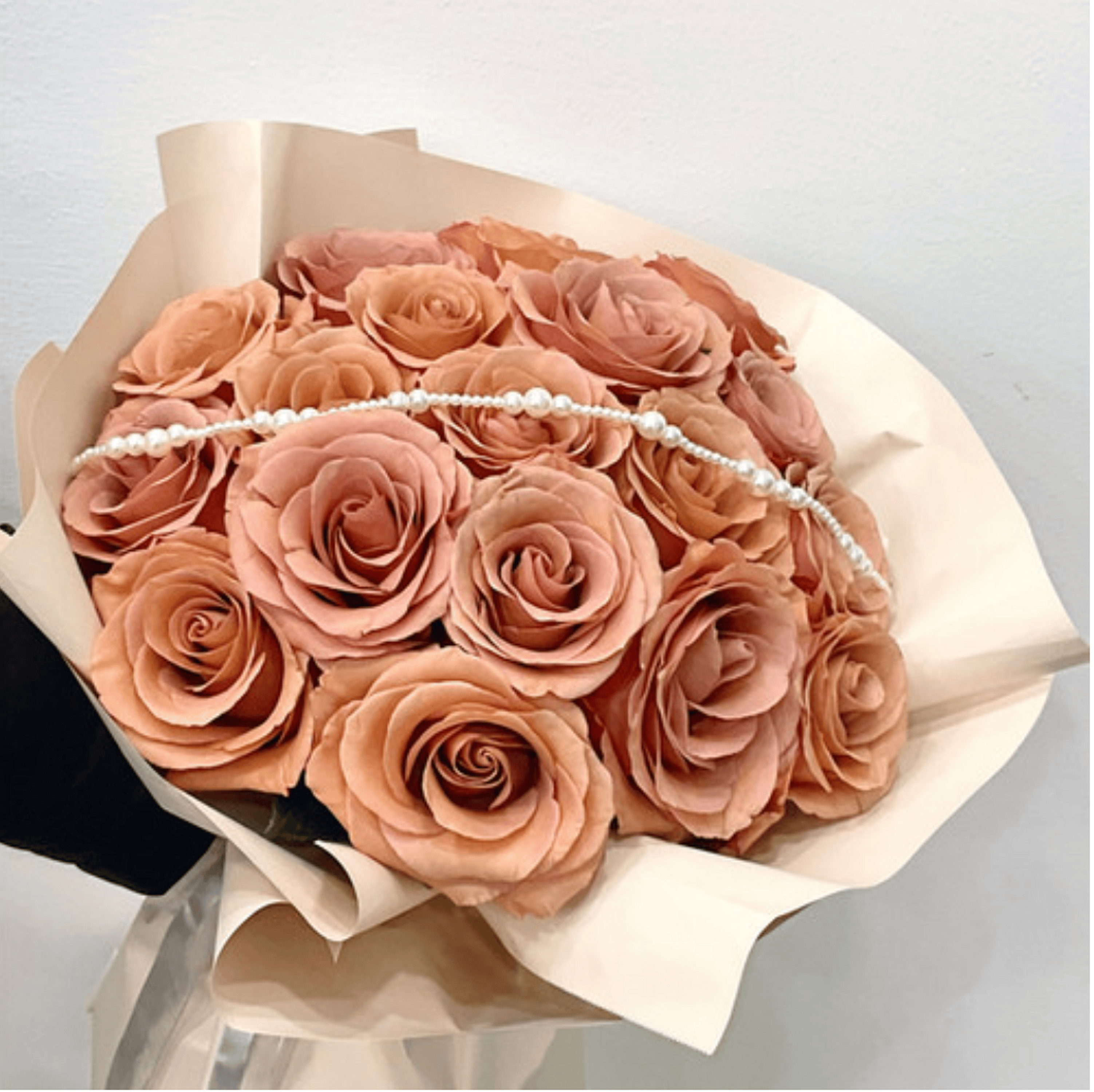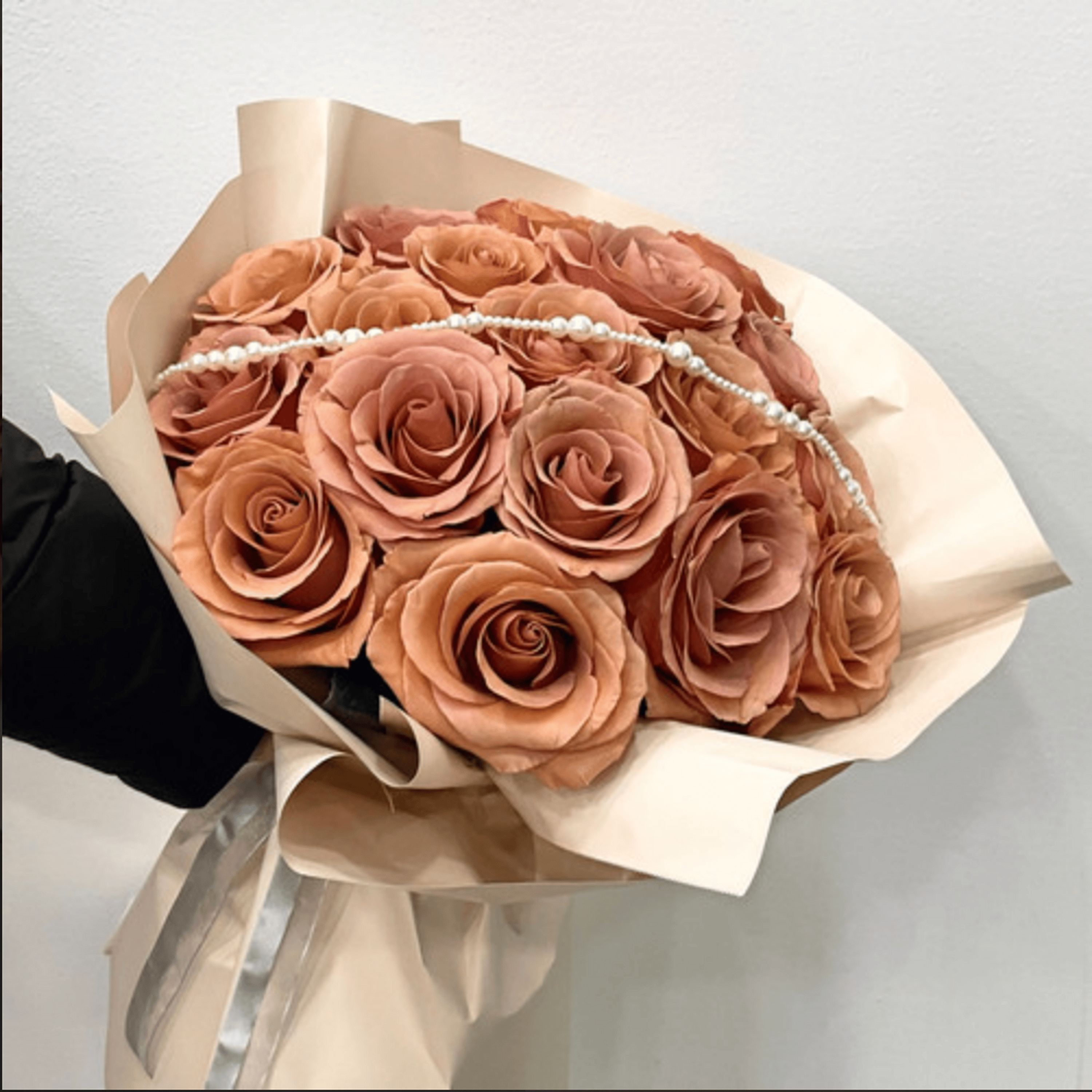 Elegant and moder, this stunning bouquet features twelve premium toffee roses in warm caramel tones, artfully wrapped in soft neutral paper. Their unique color adds a sophisticated twist to the classic roses. Perfect for anniversaries, celebrations, or simply to say "I love you" with style.