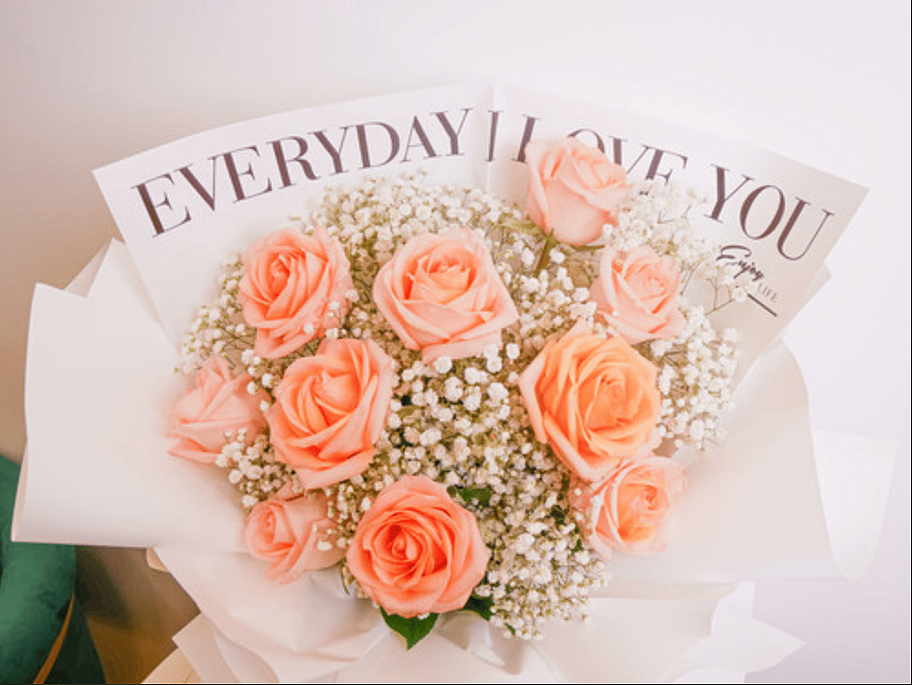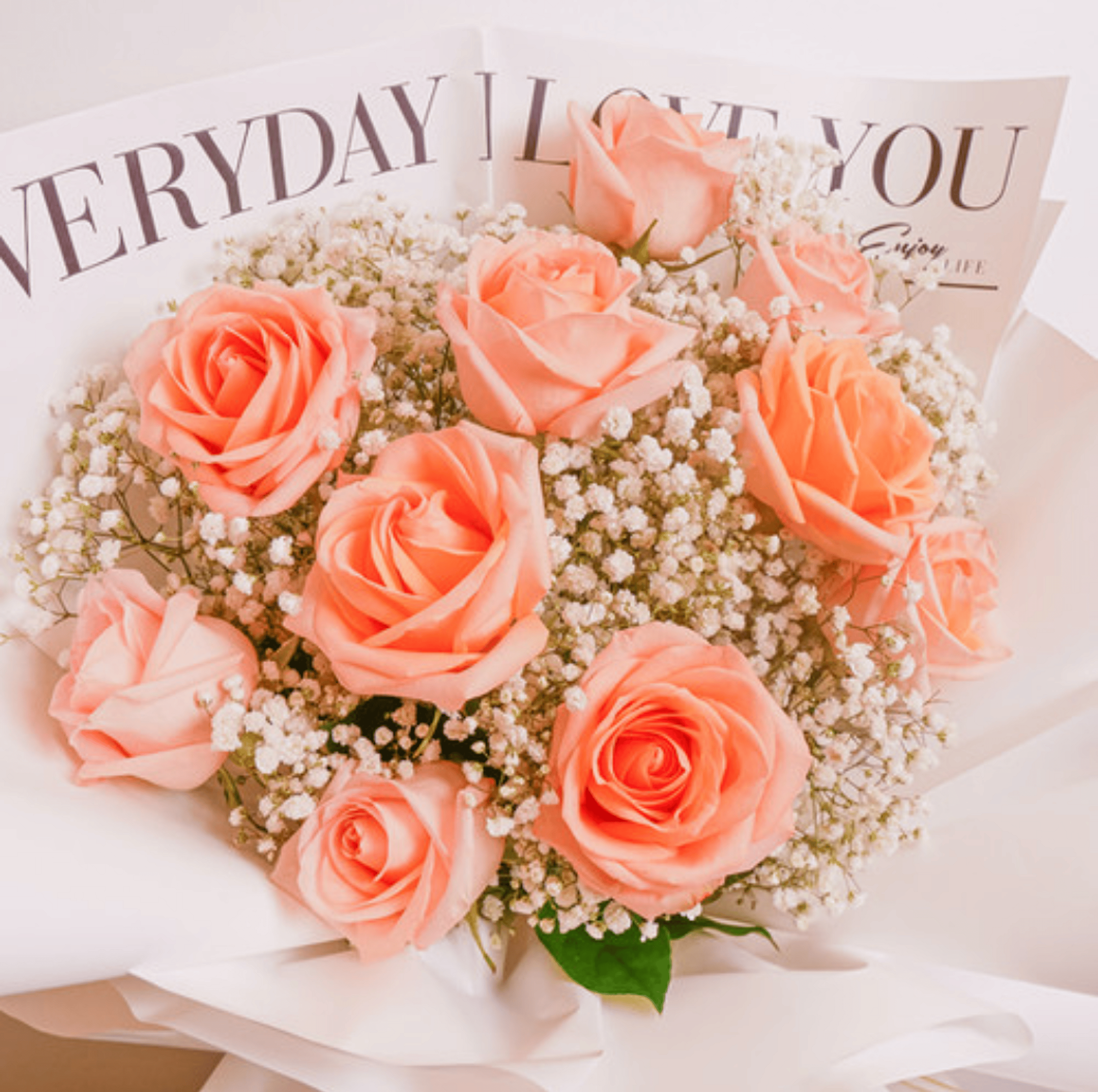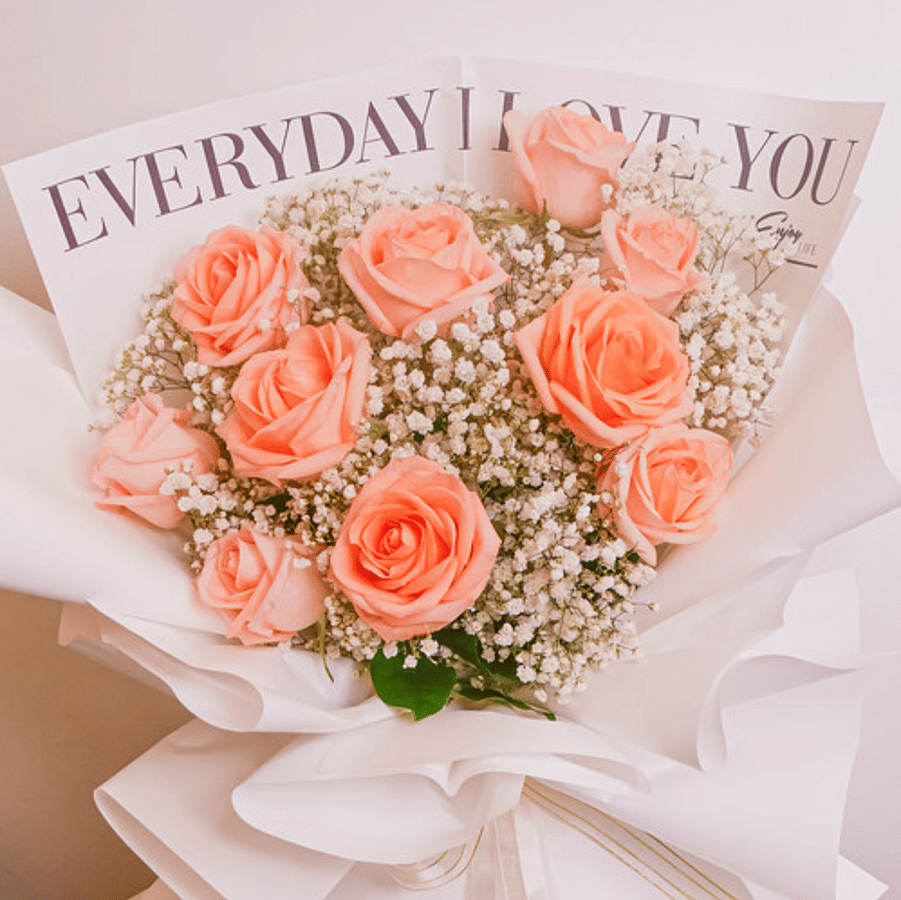 A delicate bouquet of peach-pink roses accented with baby's breath, wrapped in elegant white and cream paper. Radiating charm and romance, this arrangement is ideal for anniversaries, prom, or graduation. A beautiful way to celebrate love and special milestones!