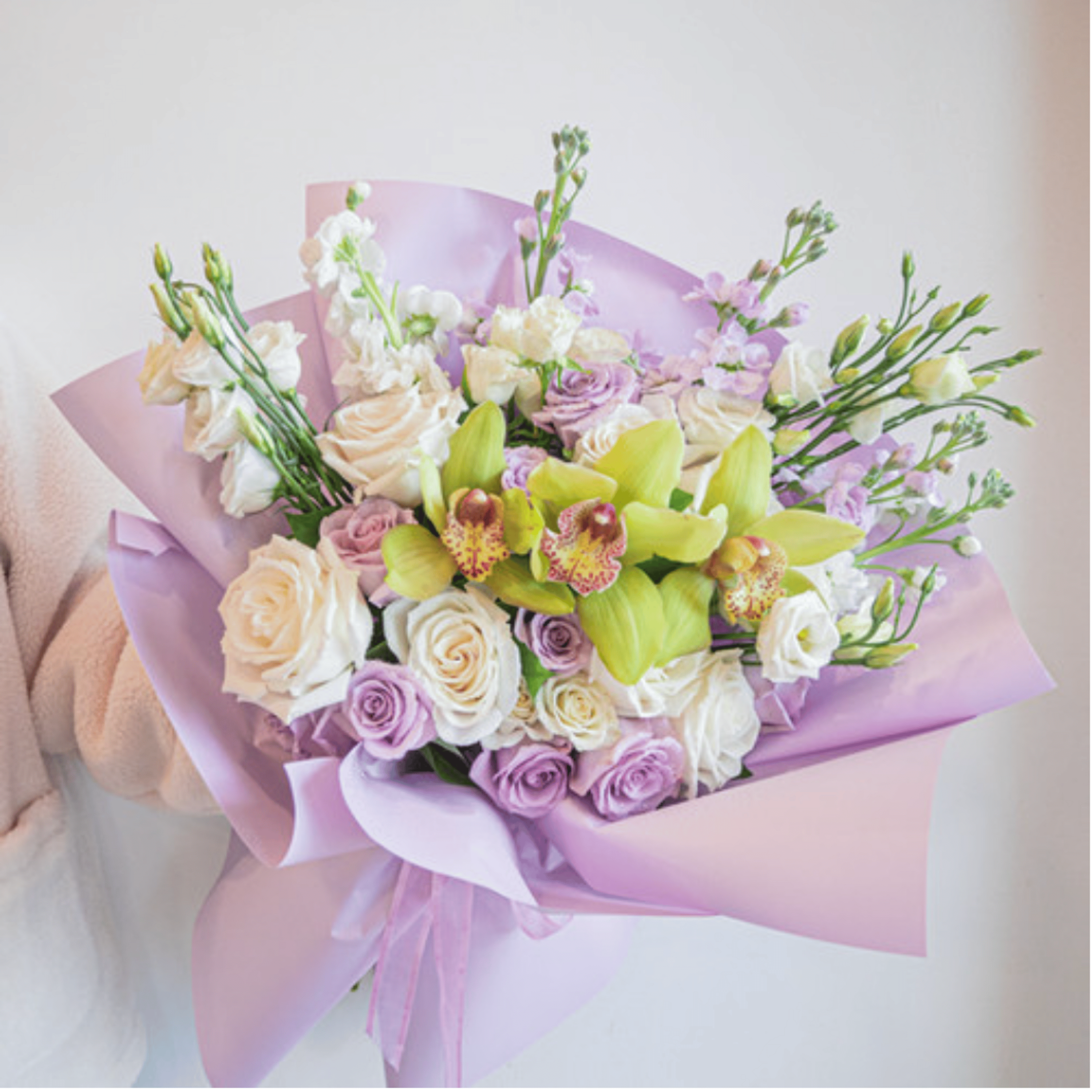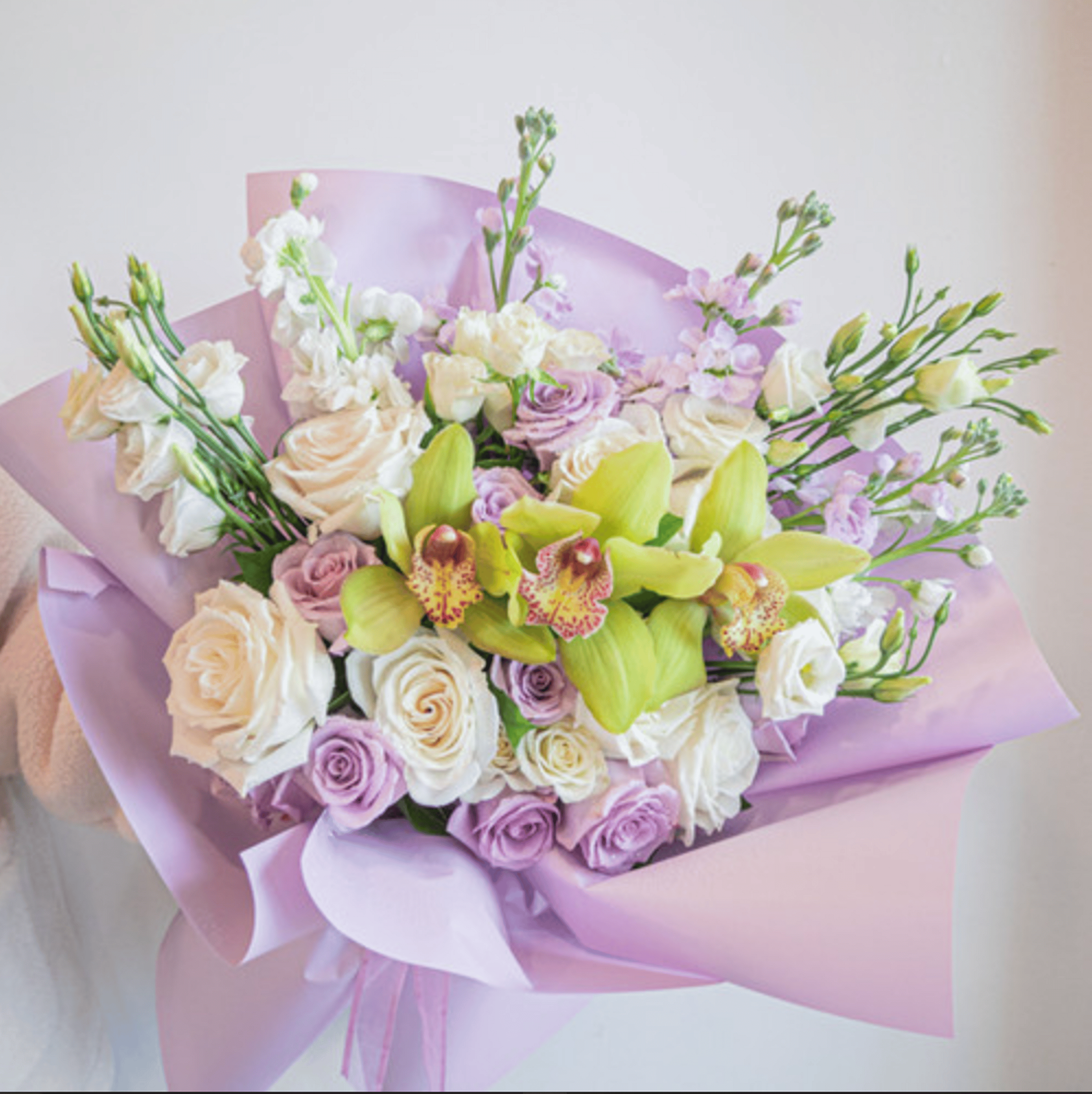 An elegant blend of soft lavender and ivory roses paired with vibrant green cymbidium for a touch of modern luxury. Wrapped in pastel lavender paper, this bouquet is both sophisticated and refreshing- perfect for birthdays, anniversaries, or to celebrate life's special moments in style.