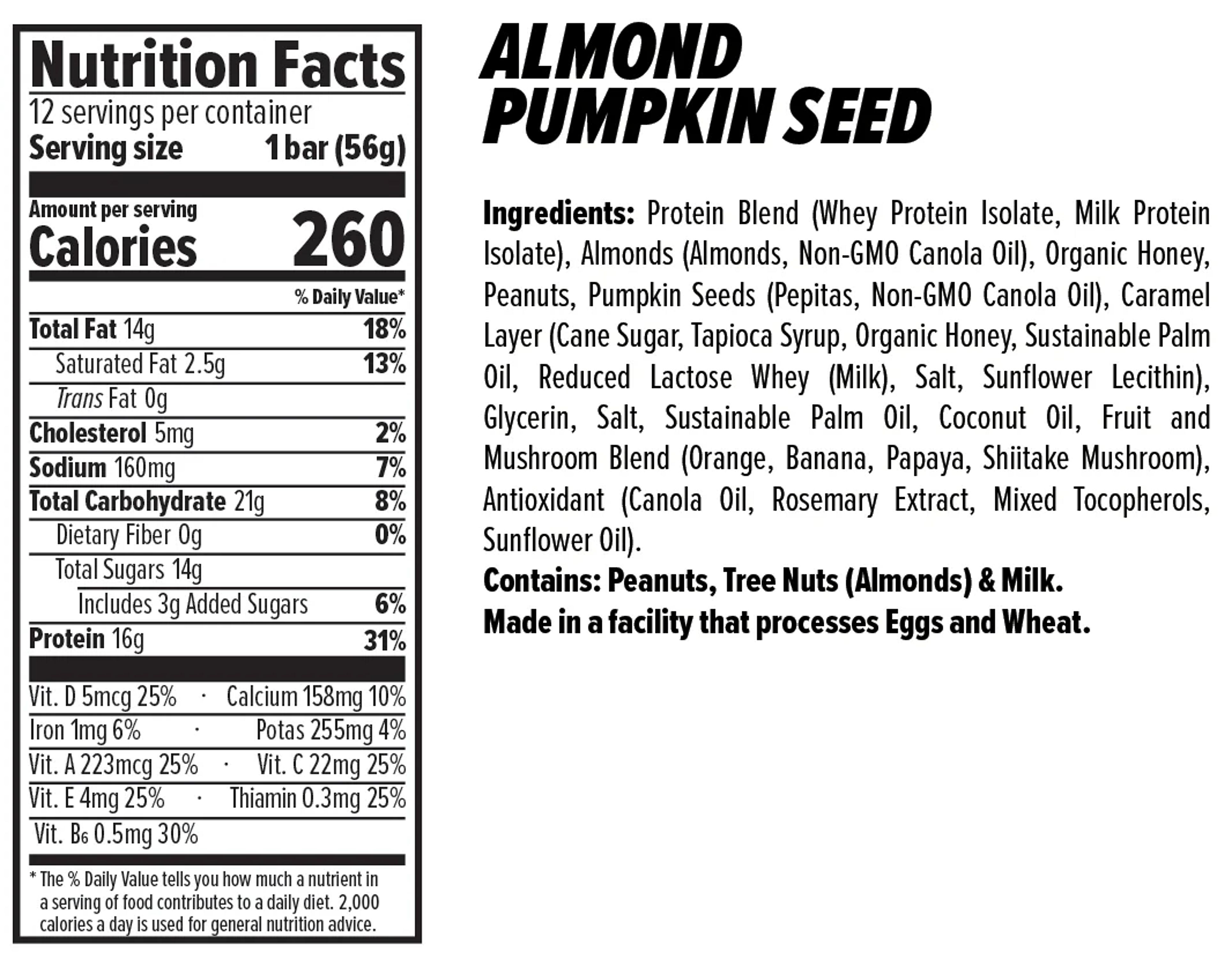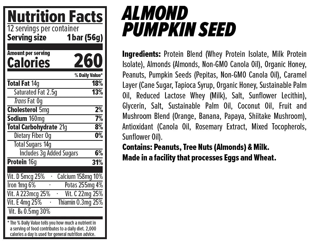 Recover with the right balance of sweet and salty with the Almond Pumpkin Nut + Seed Bar. Perfectly sweetened with honey and satisfyingly filling with the crunch of roasted almonds and pumpkin seeds.