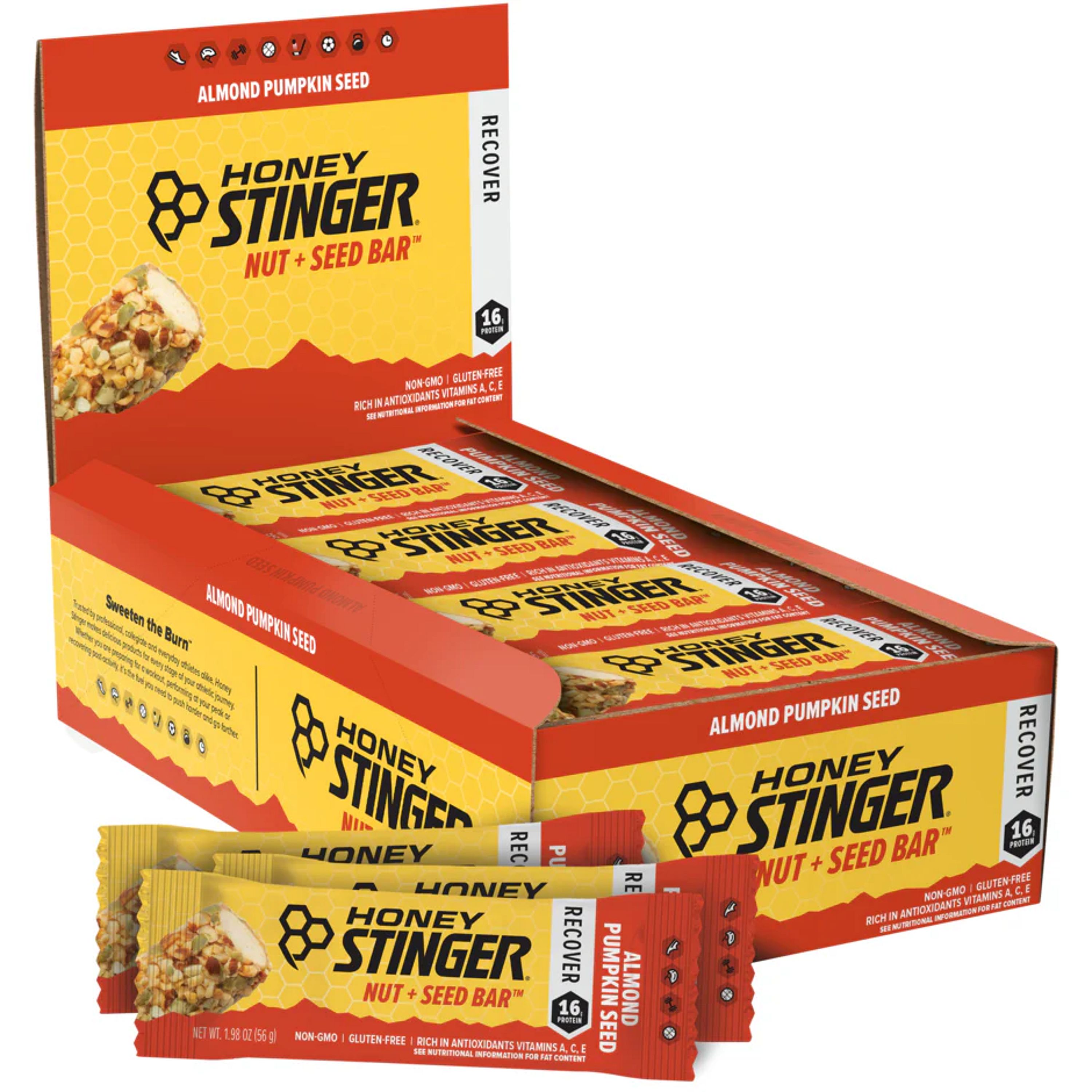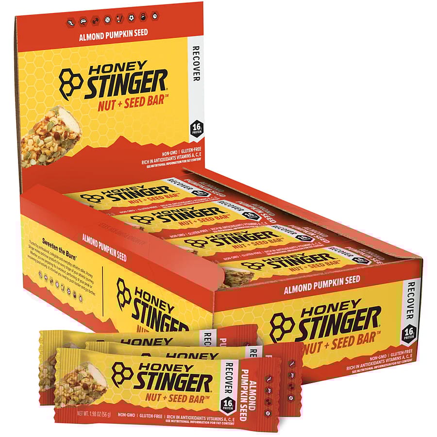 Recover with Honey Stinger Nut + Seed Bars! Creamy nut butter covered in caramel and rolled in crunchy nuts and seeds, the Nut + Seed Bar contains 16g protein packed with nutritious antioxidants, delicious honey, and savory nut flavor for a rewarding post-workout recharge.