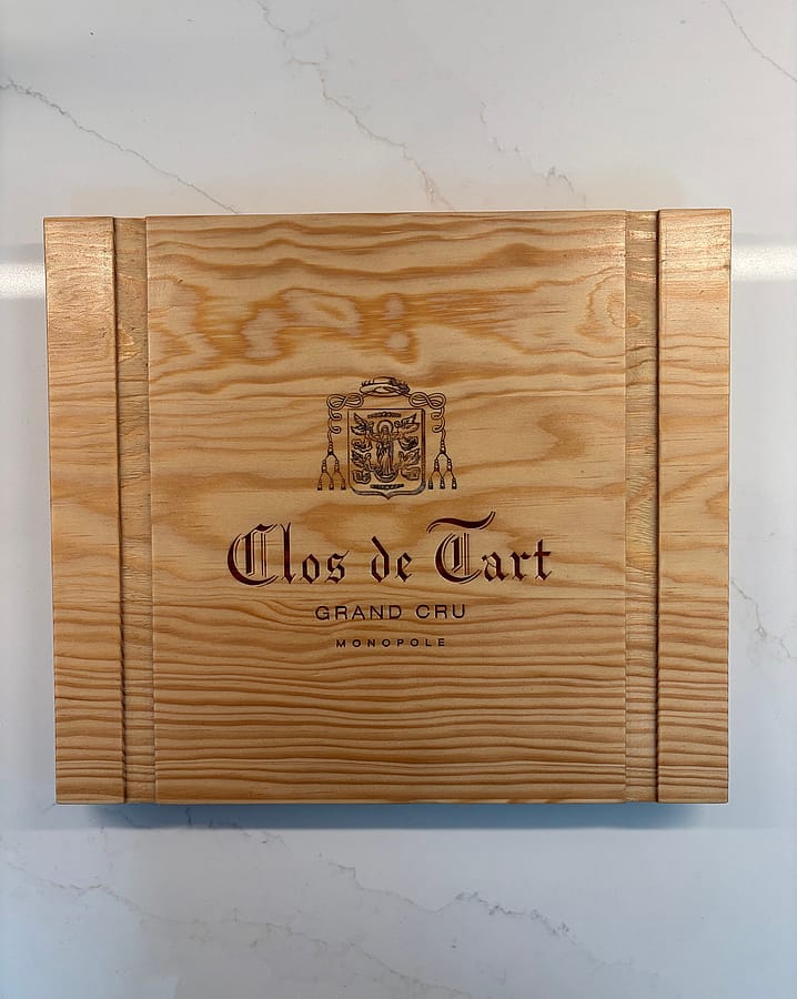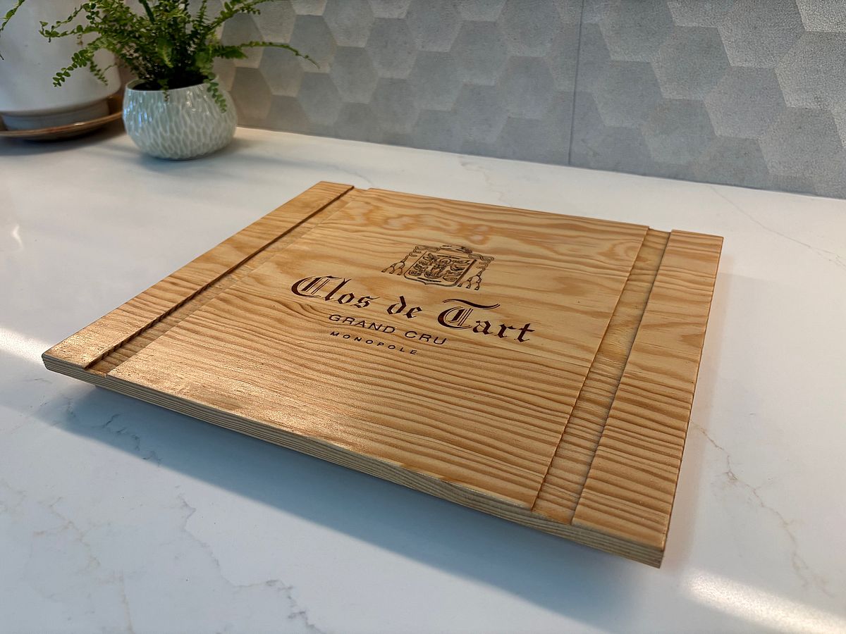 This serving board is from producer Clos de Tart from Burgundy France. Clos de Tart is a Grand Cru and produces some of the best pinot noir in France. A perfect board for a wedge of brie, crackers and some picholine olives. The board measures 13w x 11d x 1h. Knife work is not recommended due to the soft nature of the wood.