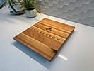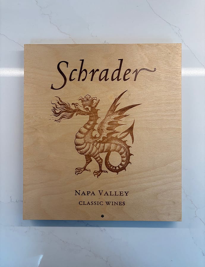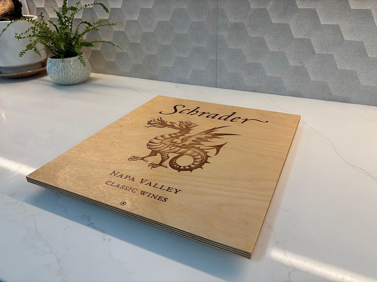 Schrader is a cult wine producer from Napa Valley. The dragon logo on this board is 'Old Sparky' which is a wine that is a blend from Schrader's best barrels. A perfect gift for the entertainer or wino. It is a perfect serving board for your charcuterie. The dimensions are 12.5w x 14d x 1h. Knife work is not recommended due to the soft nature of the wood.