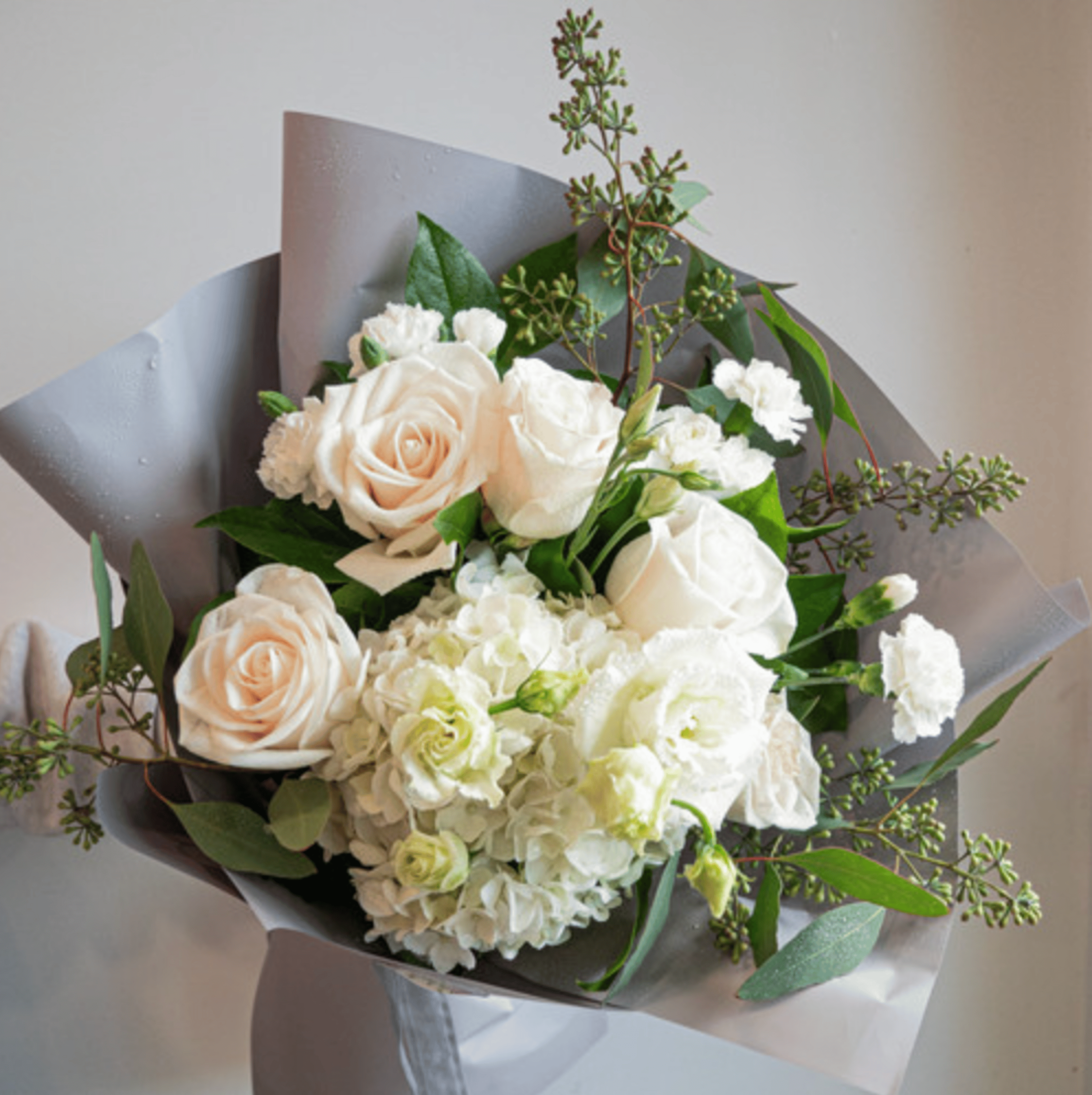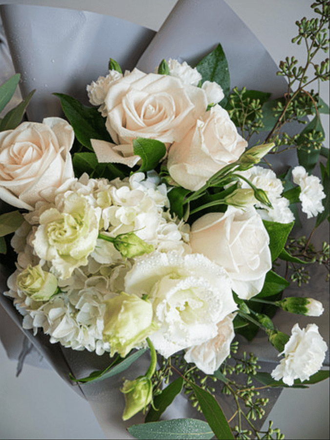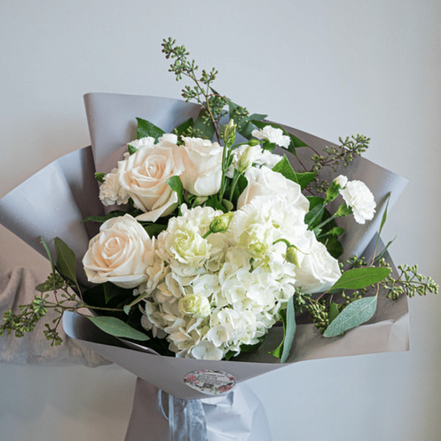 A timeless arrangement of white roses, hydrangeas, and delicate fillers that exude grace and sophistication. Wrapped in soft neutral tones, this bouquet is perfect for weddings, anniversaries, sympathy gestures, or to bring a touch of serene beauty to any occasion.