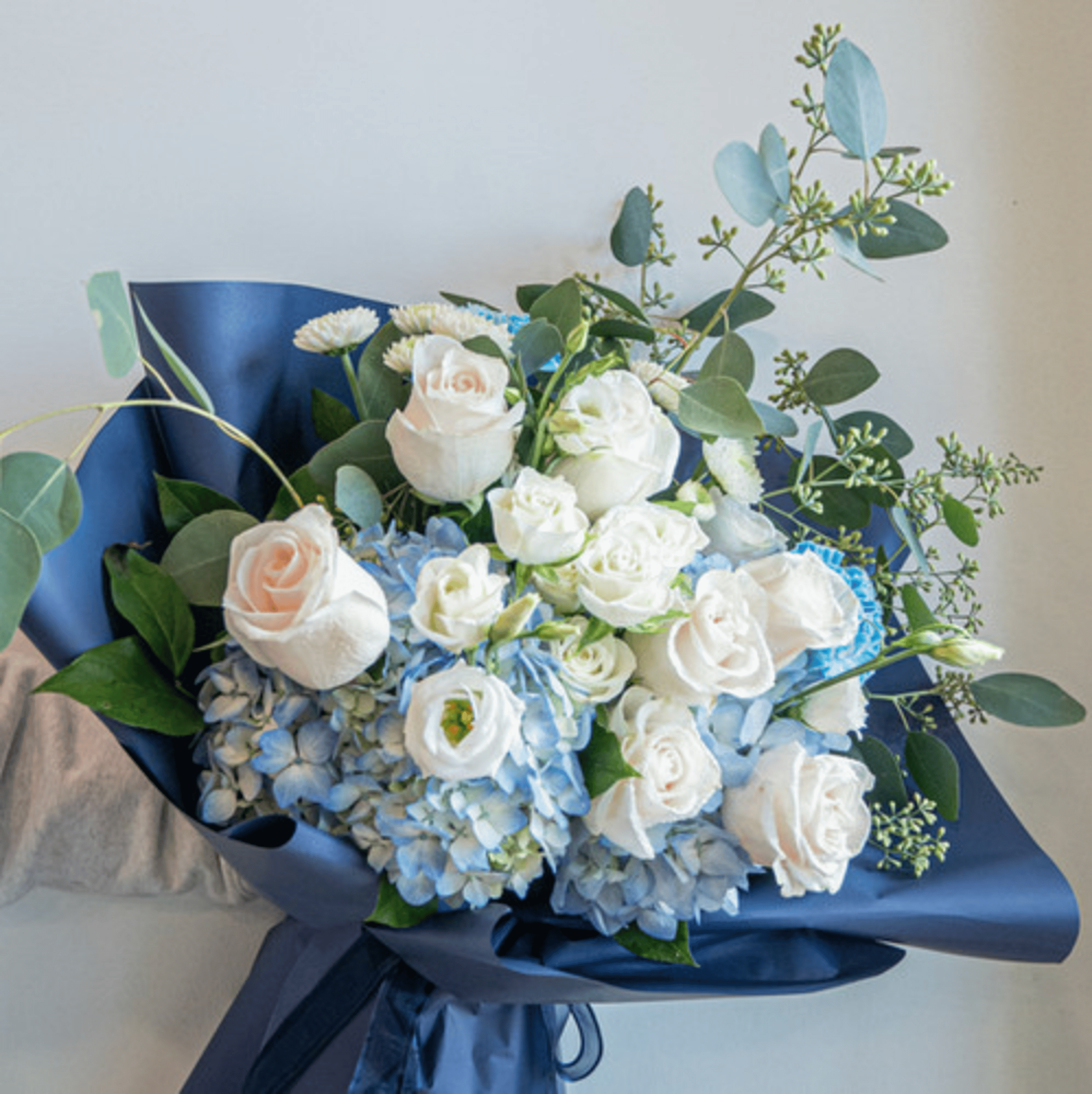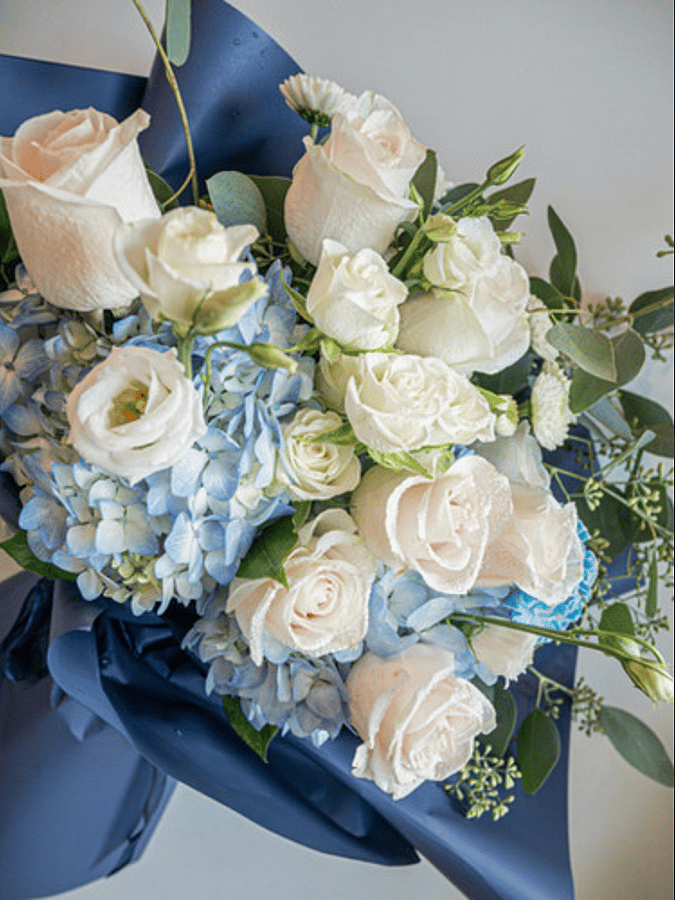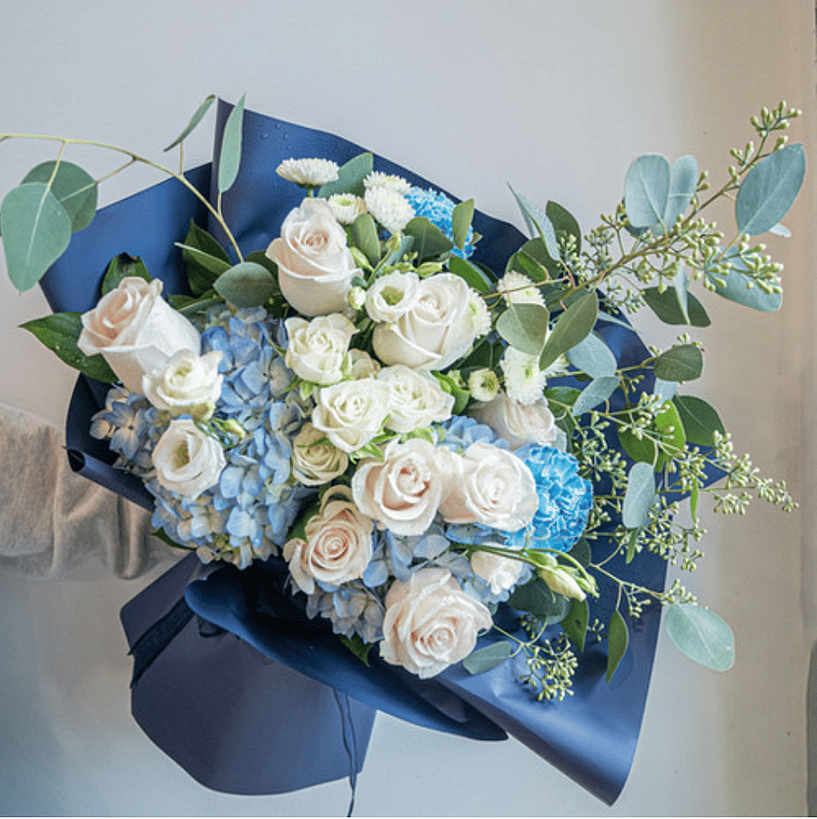 A graceful combination of soft white roses, blue hydrangeas, and lush greenery beautifully wrapped in deep navy paper. This serene arrangement exudes sophistication and calm making it perfect for anniversaries, graduations, Mother's Day, or to celebrate life's meaningful moments with elegance.