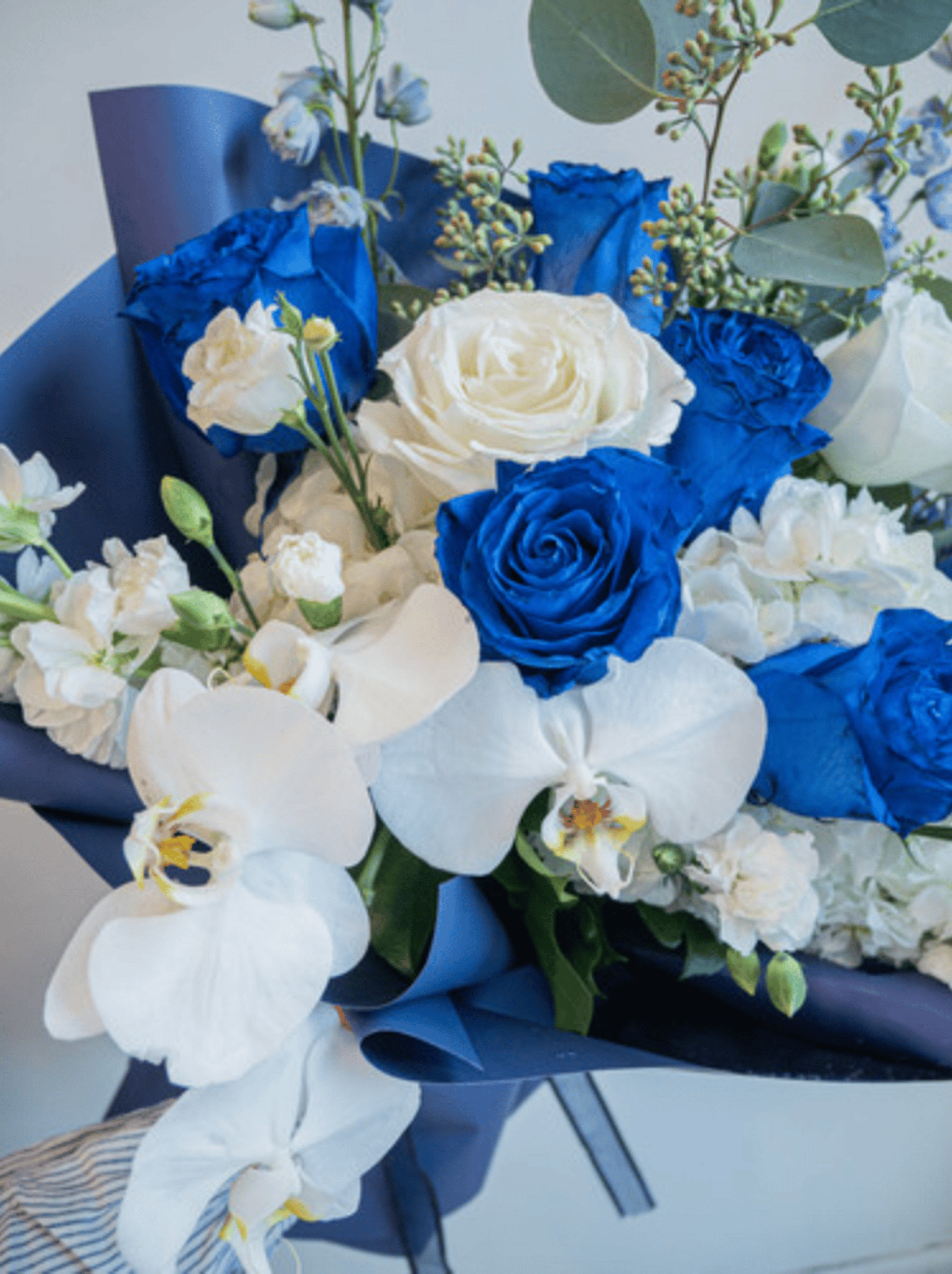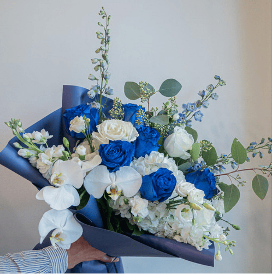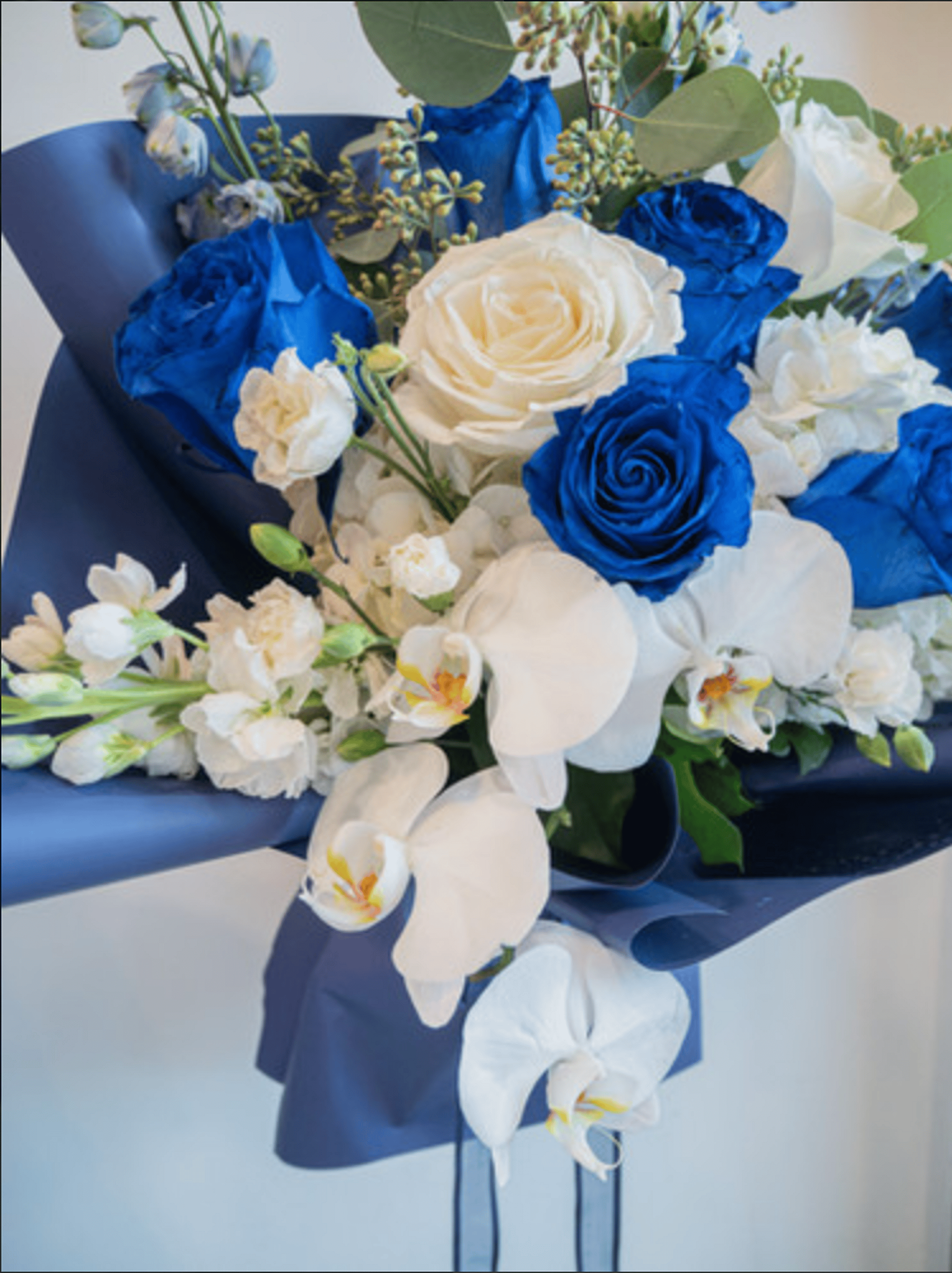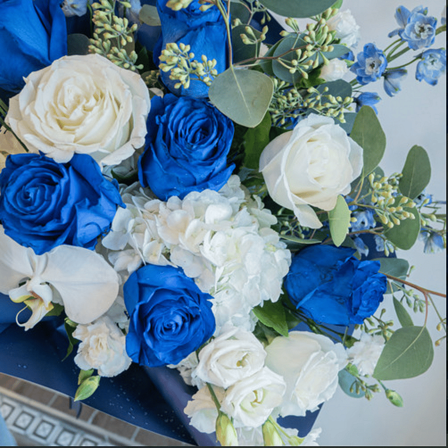 A striking bouquet that blends the beauty of deep blue and pure white blooms for a bold yet elegant statement. Featuring roses, orchids, and lush greenery, this arrangement is artfully wrapped in sleek navy paper for a modern, sophisticated finish. Perfect for special celebrations, corporate gifting, or to express admiration and appreciation with timeless style.