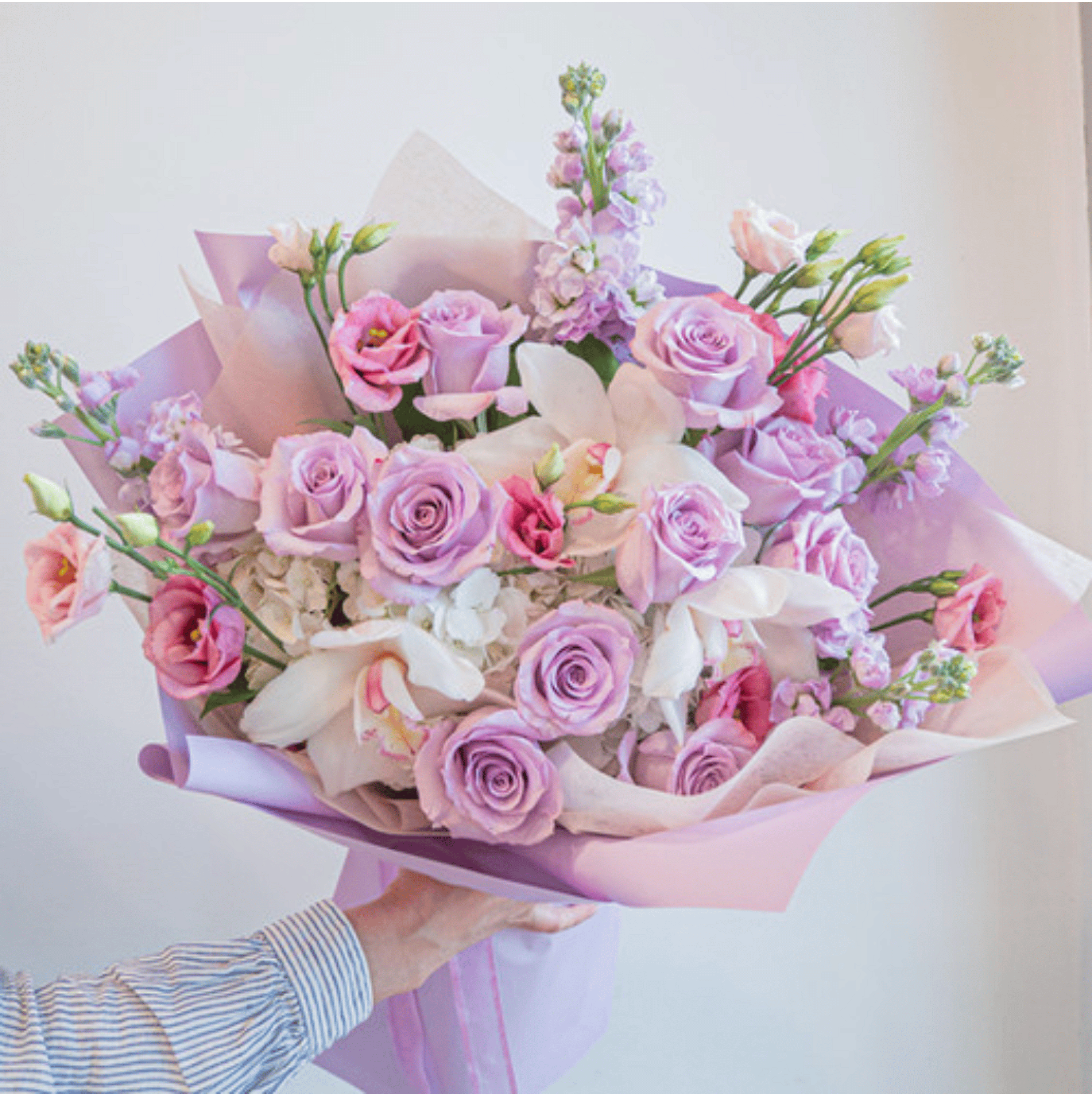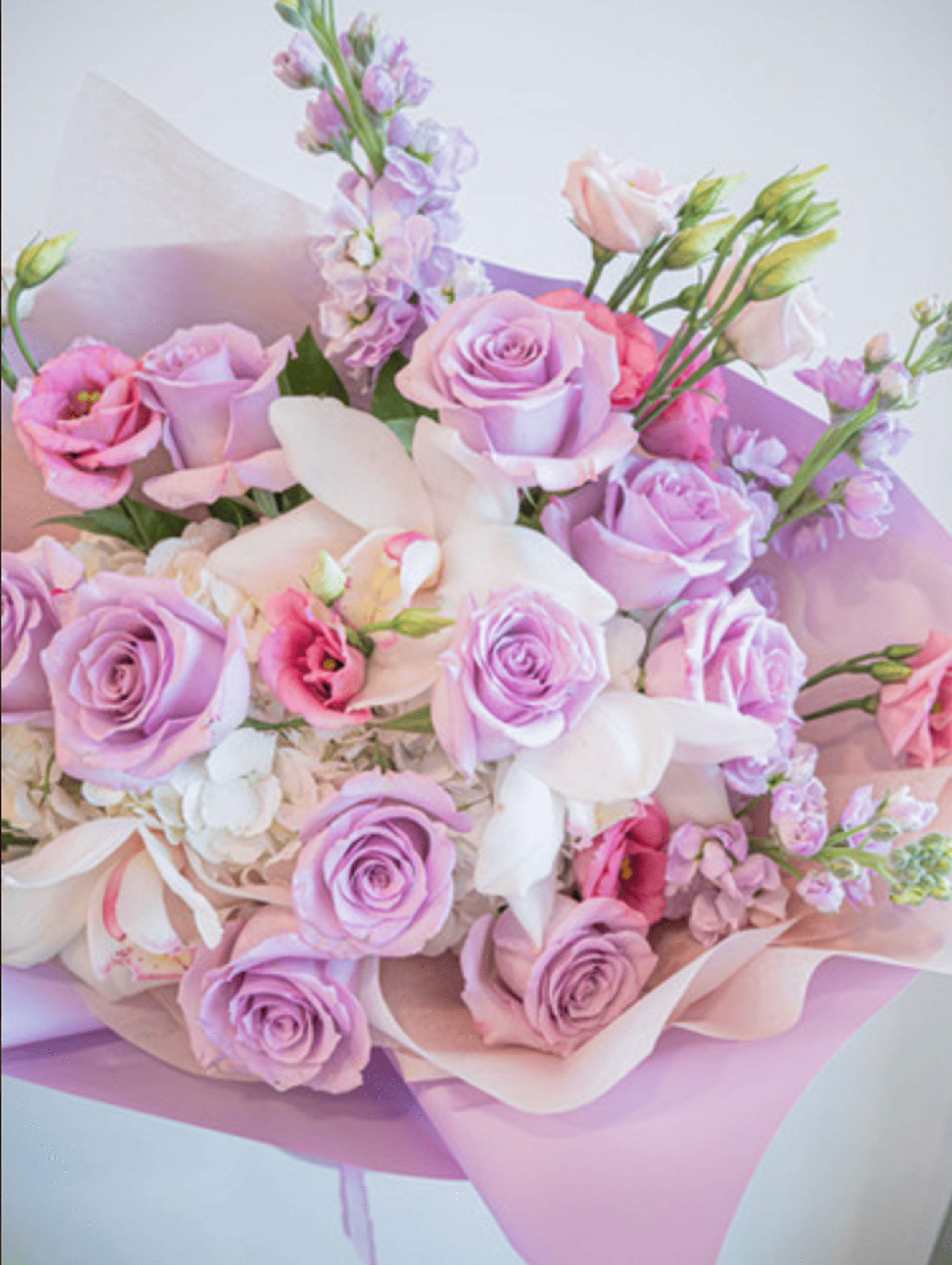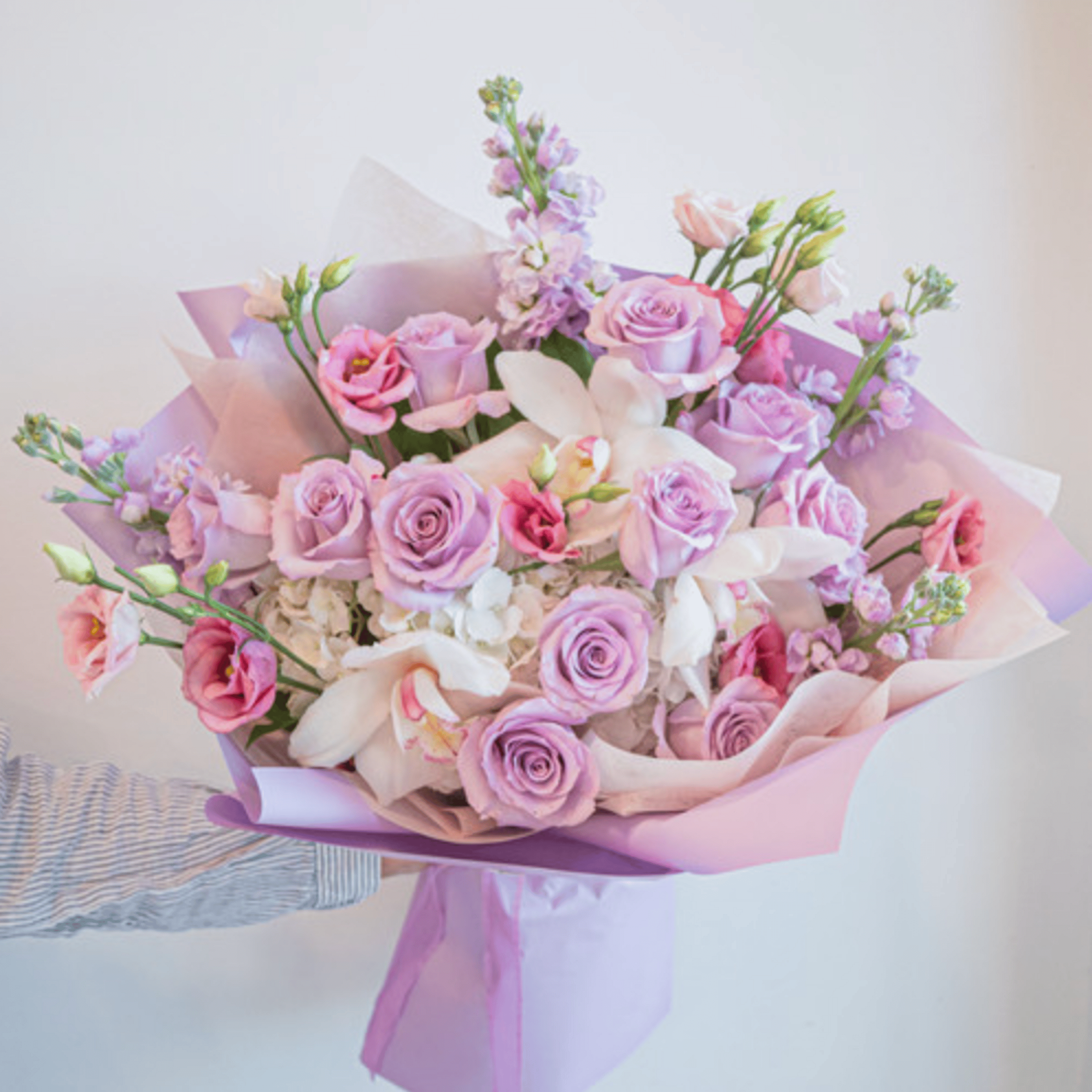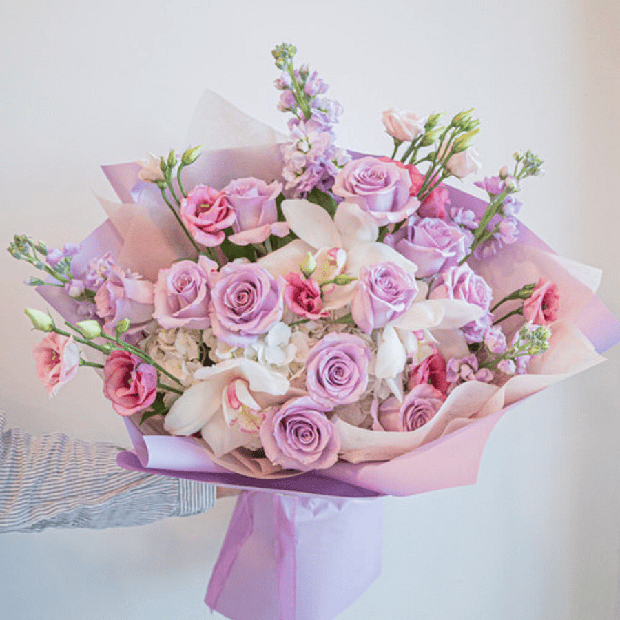 A romantic blend of soft lavender, blush pink, and creamy white blooms artfully arranged to create an elegant, feminine touch. Featuring roses, lisianthus, and seasonal accents wrapped in delicate pink paper, this bouquet is perfect for prom, birthdays, anniversaries, or simply to brighten someone's day.