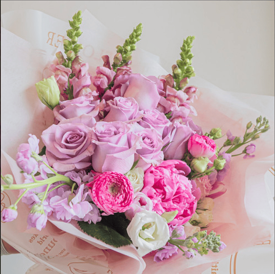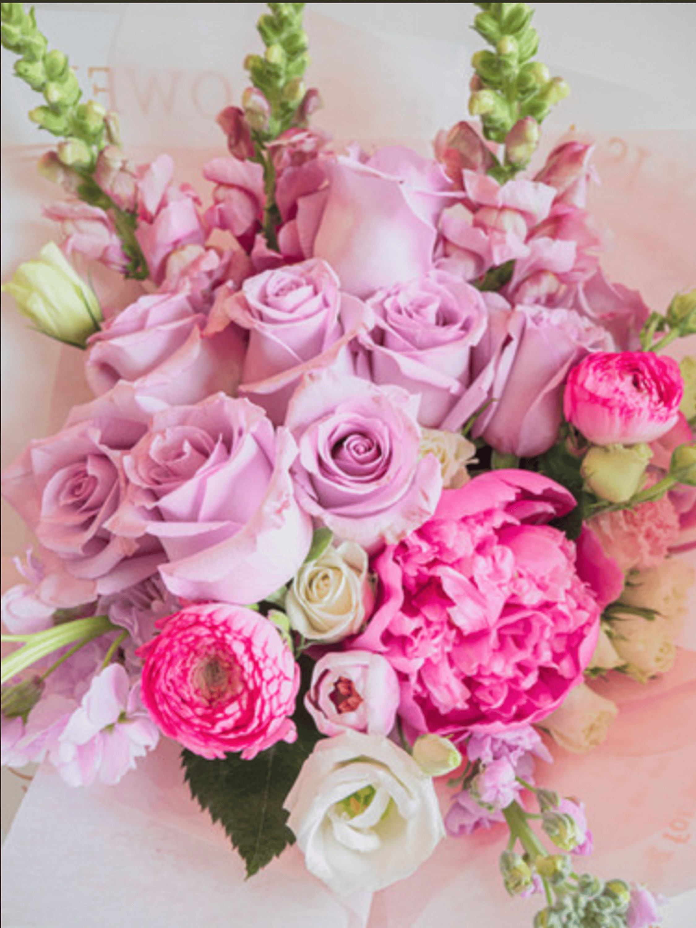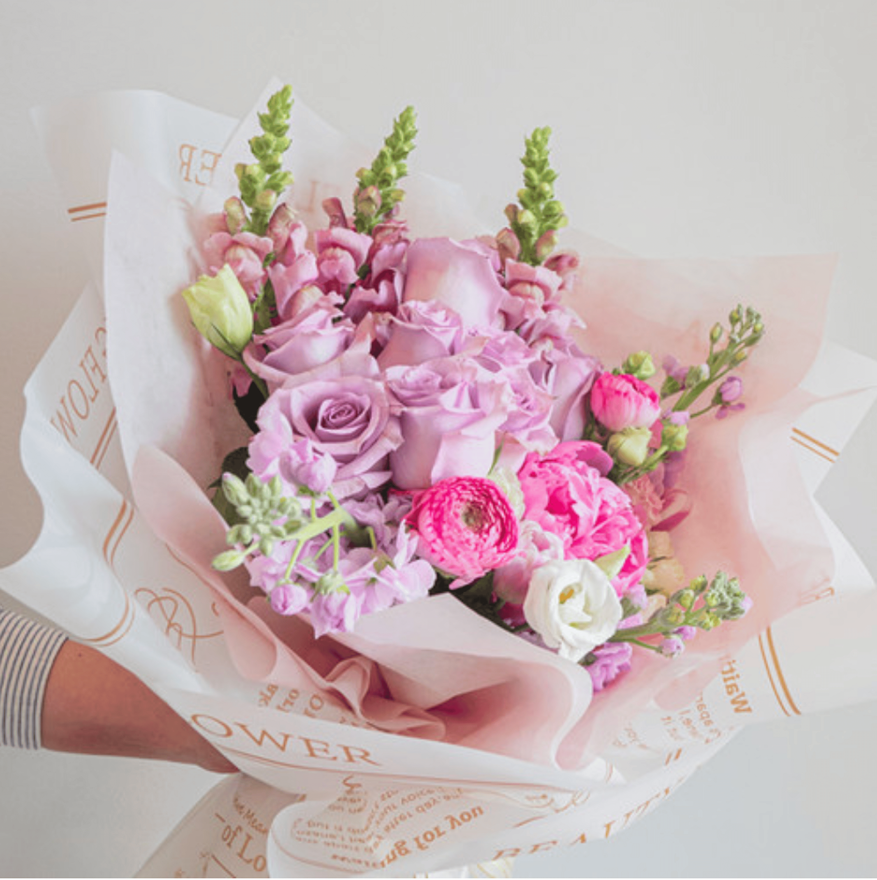 A soft and romantic bouquet featuring shades of pink, mauve, and cream. This arrangement combines roses, lisianthus, ranunculus, and delicate stock, creating a lush feminine look that's perfect for any occasion. Beautifully wrapped in blush paper for an elegant presentation - ideal for birthdays, prom, and Mother's Day.