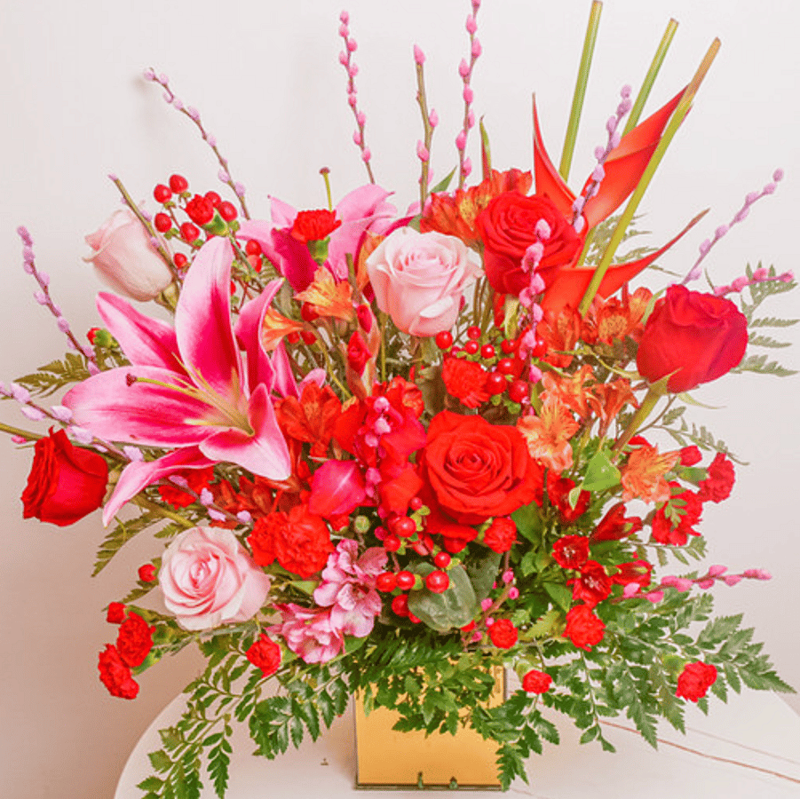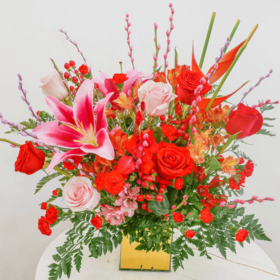 A breathtaking blend of pink lilies, roses, and vibrant red blooms arranged in a modern gold vase. This lush design combines elegance and passion, making it the perfect choice for anniversaries, romantic gestures, or simply brightening someone's day with a touch of luxury.