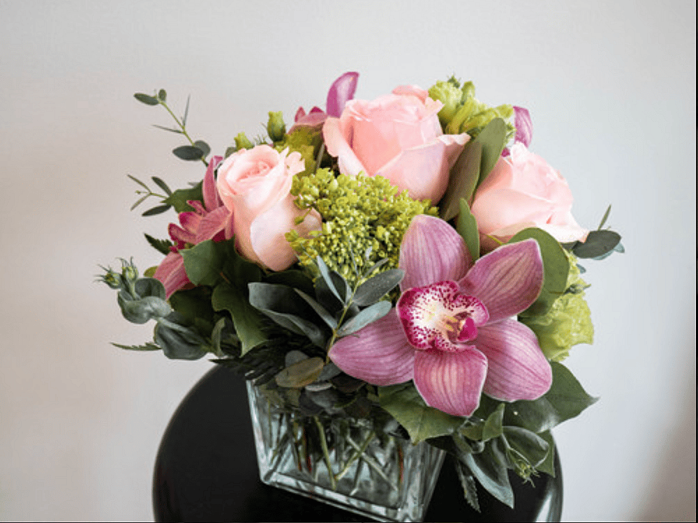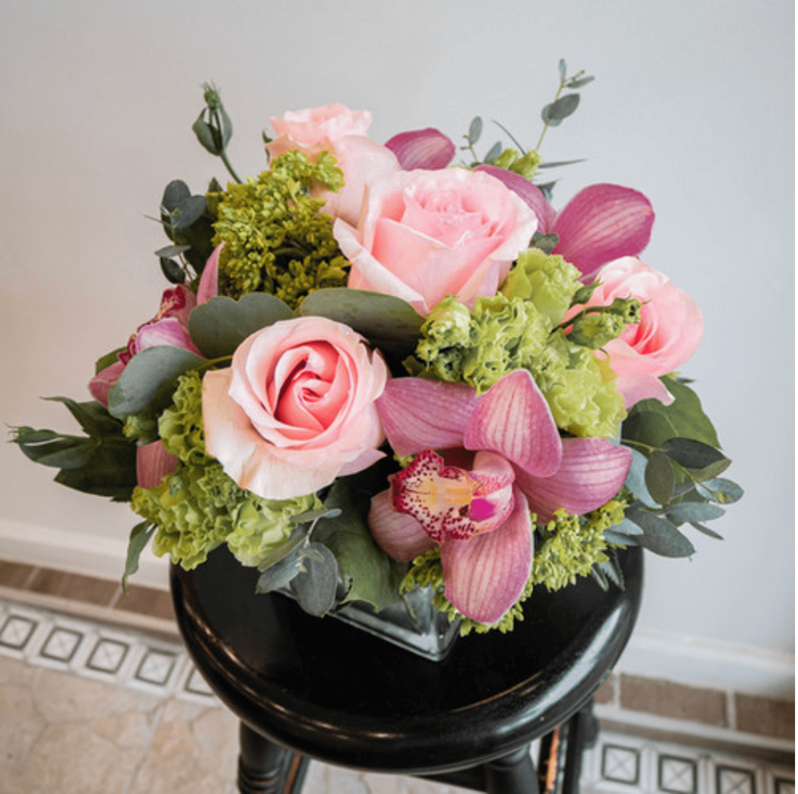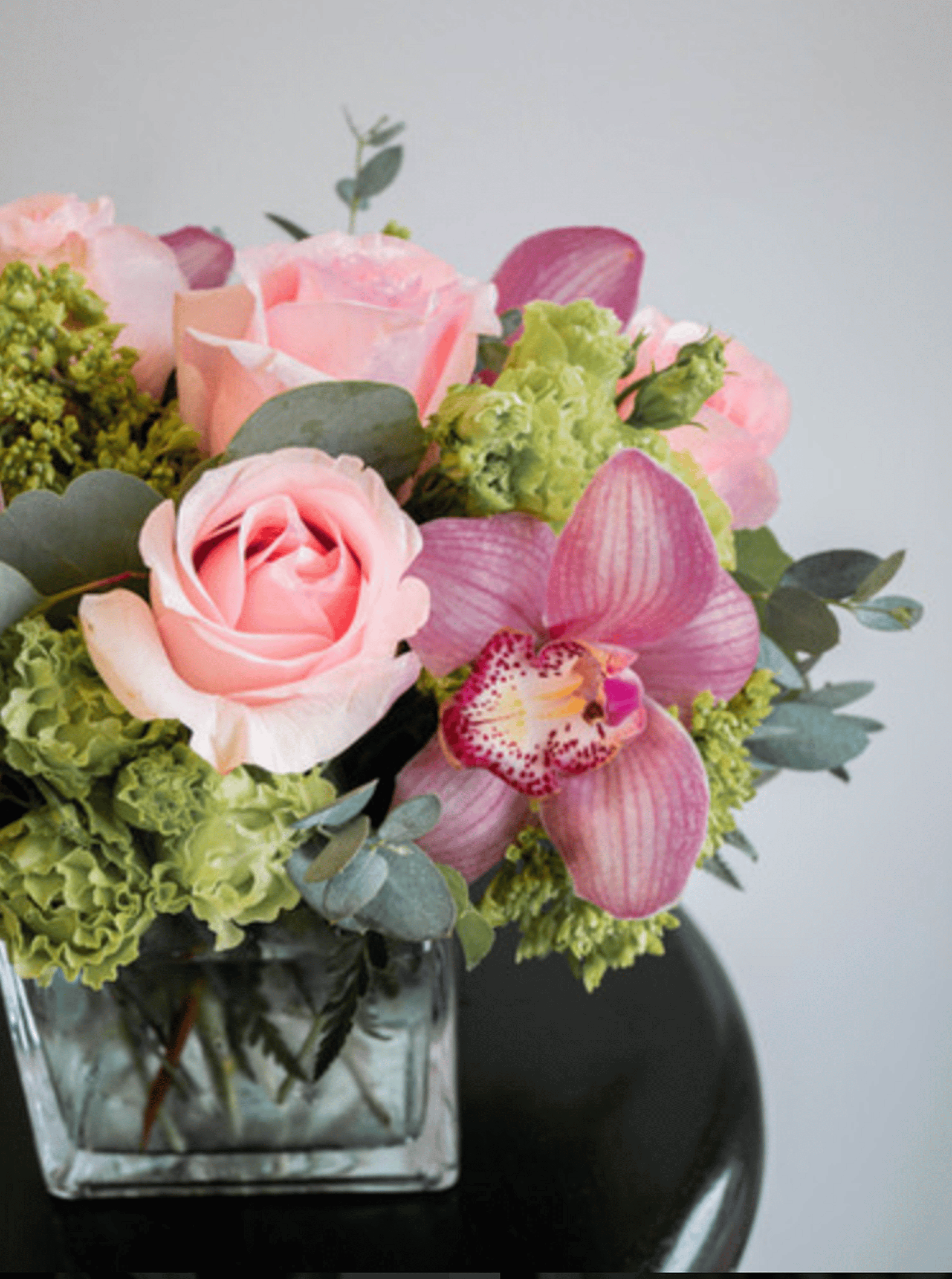 Celebrate their special day with this joyful mix of soft pink roses, vibrant green blooms, and elegant orchids. Designed in a modern vase, this arrangement radiates charm and happiness - the perfect way to make any birthday feel extra beautiful.