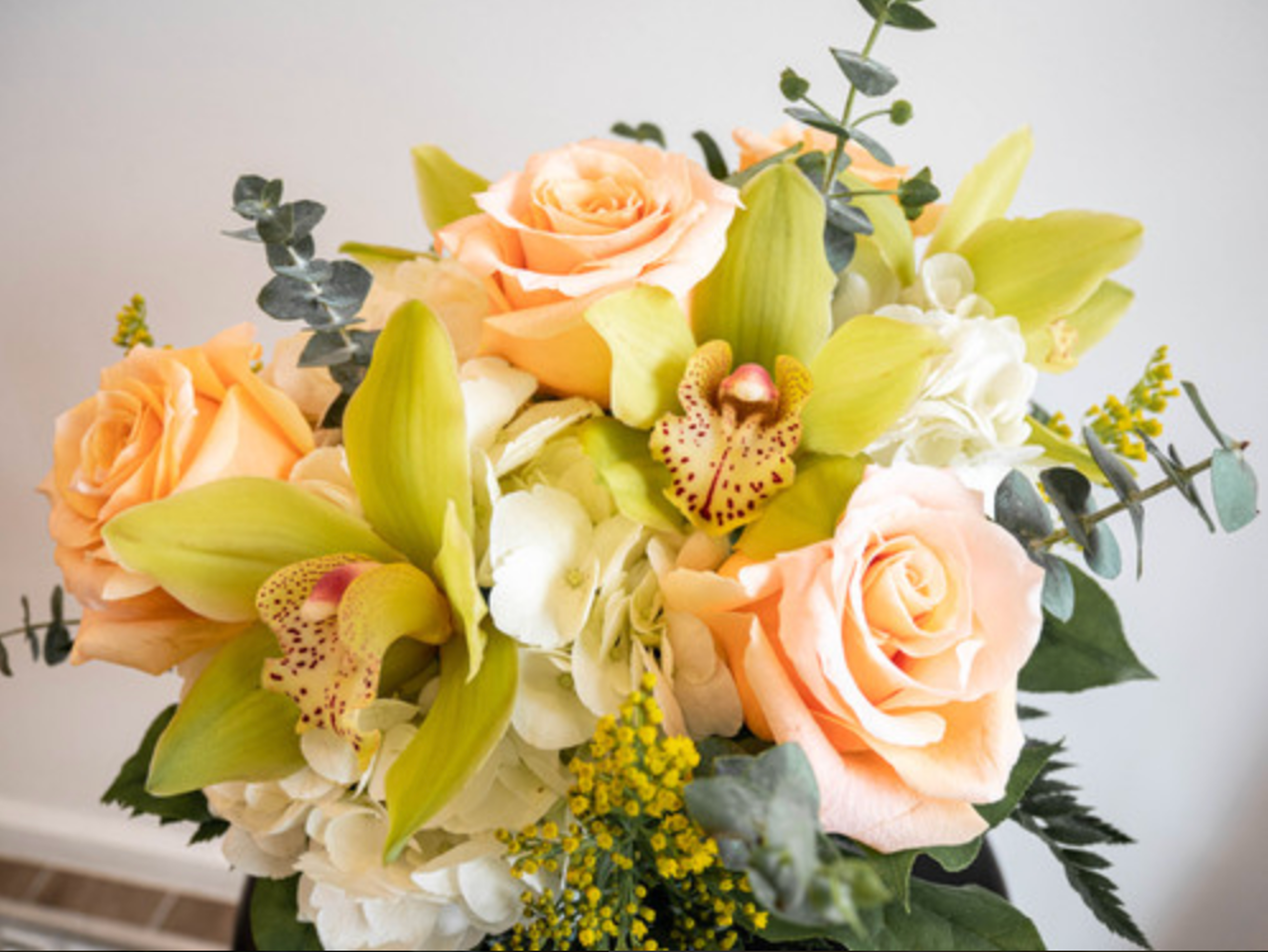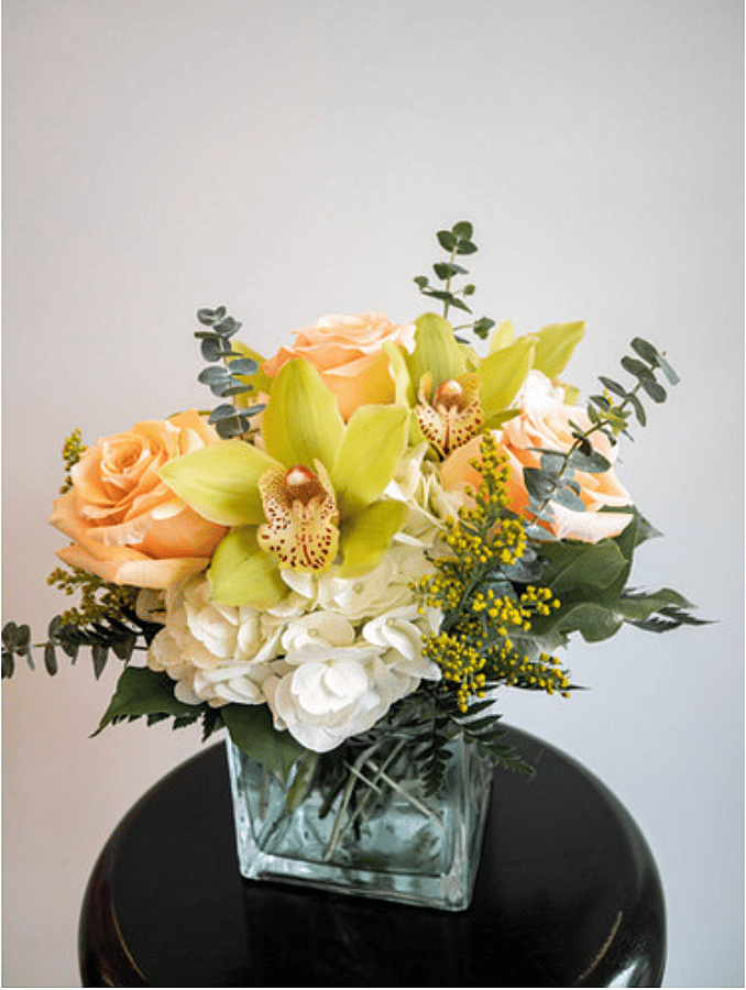 A bright and elegant birthday arrangement featuring green cymbidium orchids, peach roses, and white hydrangeas beautifully arranged in a glass vase. Accented with fresh greenery for a lush finish, this cheerful design radiates joy and sophistication - a perfect way to celebrate someone special on their big day.