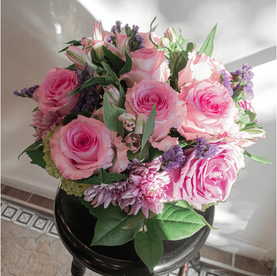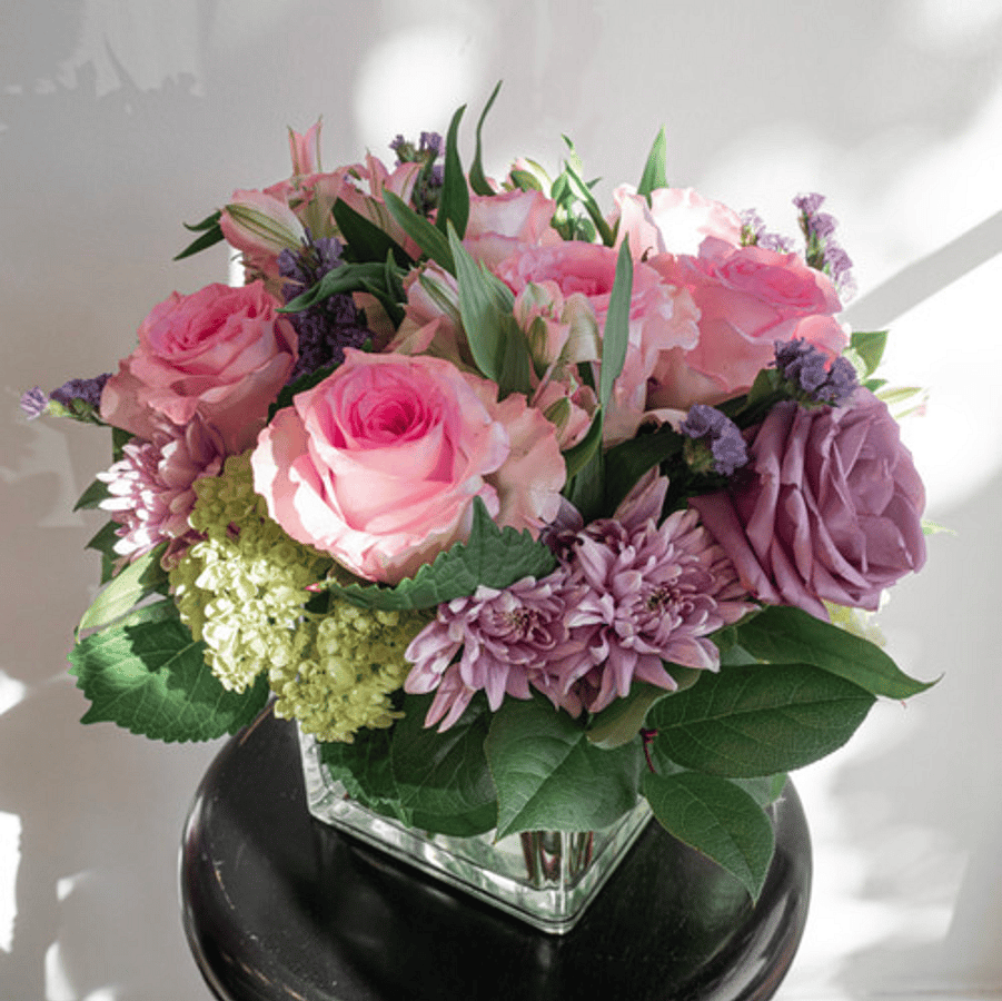 A charming mix of pink roses, lavender accents, and lush seasonal blooms beautifully arranged in a clear glass vase. This romantic design exudes warmth and elegance, making it perfect for birthdays, Mother's Day, or to express love and appreciation in the most graceful way.