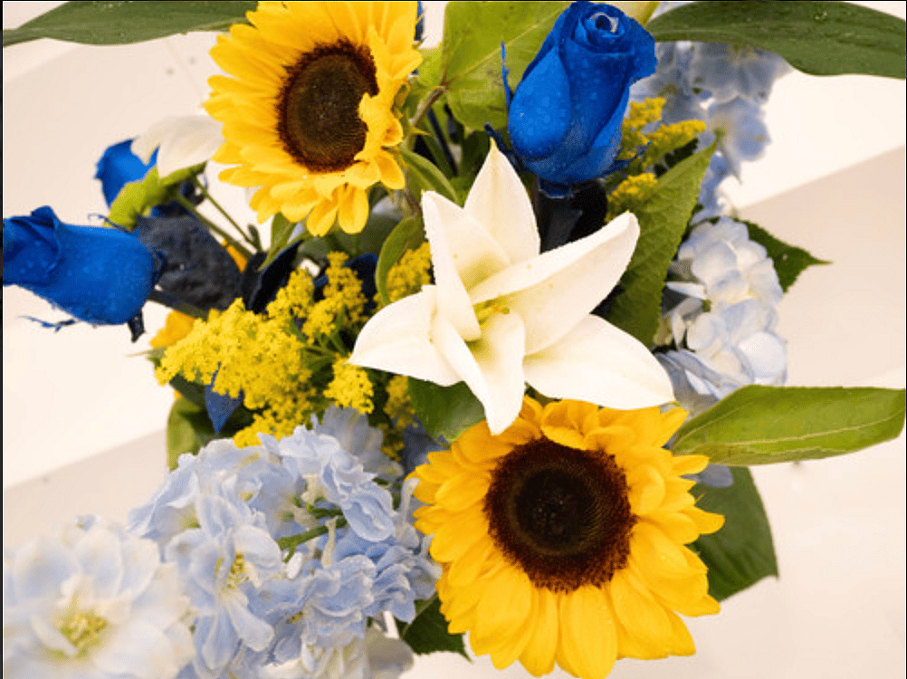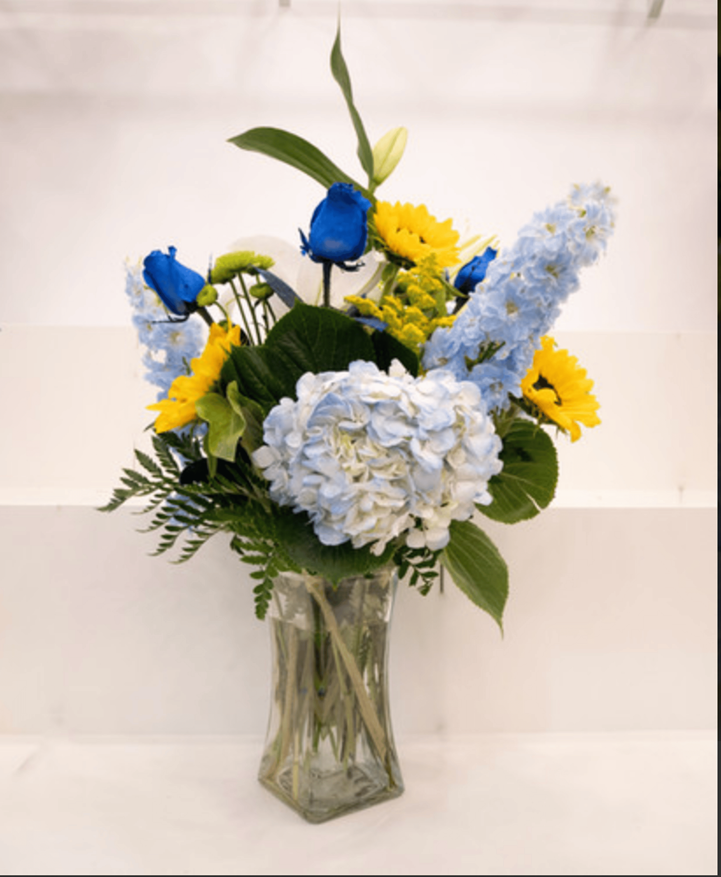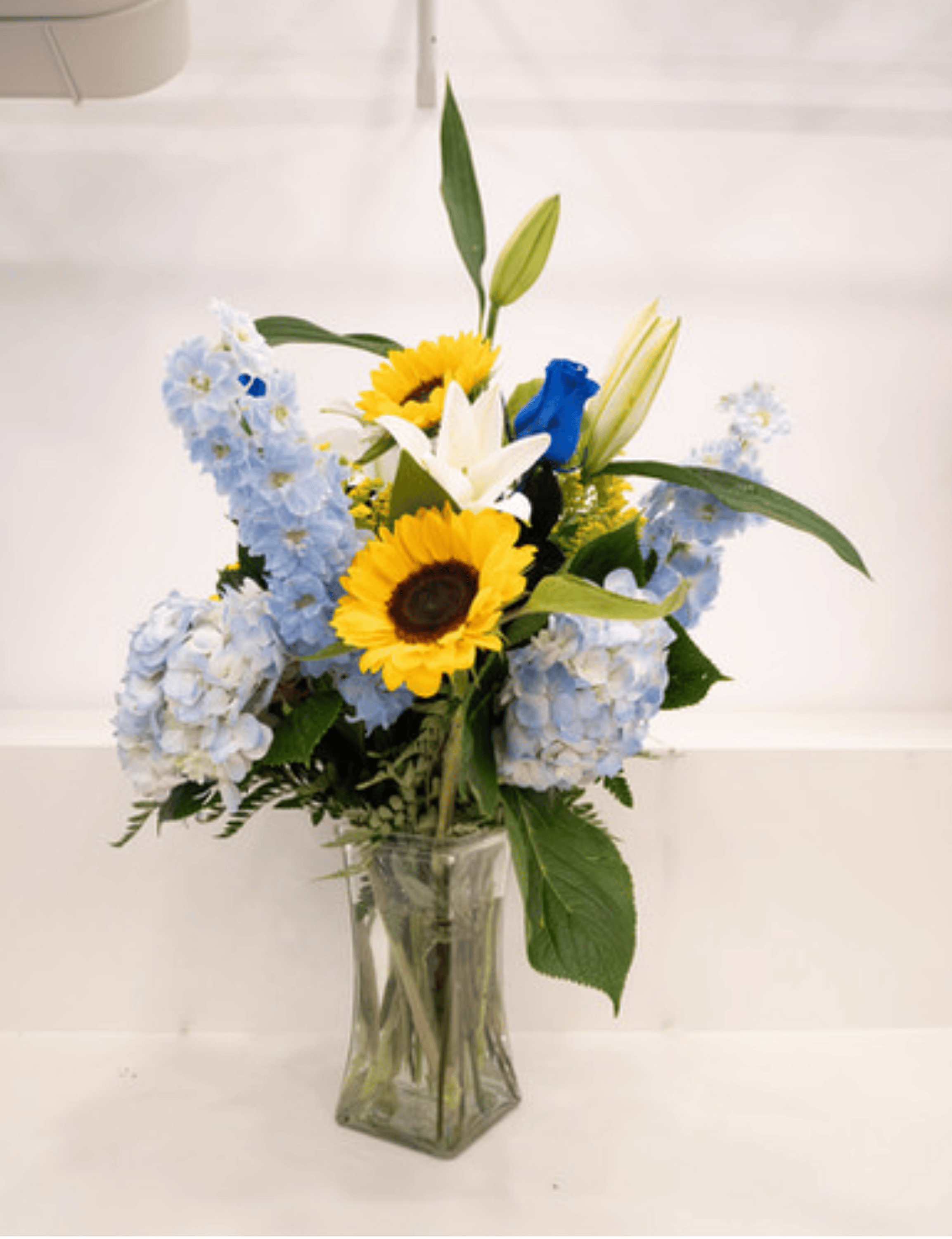 A bright and cheerful arrangement featuring sunflowers, blue hydrangeas, and white lilies beautifully arranged in a clear glass vase. This sunny mix of blooms radiated warmth and happiness - perfect for birthdays, congratulations, or simply bringing a tough of joy and positivity to any space.