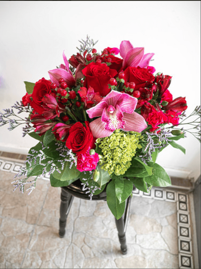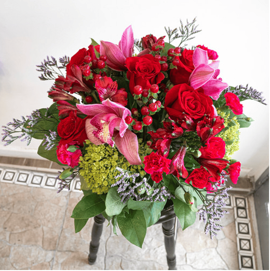 Bold and romantic, this love arrangement overflows with passion and elegance. Featuring lush red roses, pink lilies, lisianthus, and hydrangeas, it's artfully designed in a modern glass vase for a luxurious finish. The rich mix of textures and colors make it the perfect gift for anniversaries, Valentine's Day, or any romantic occasion.