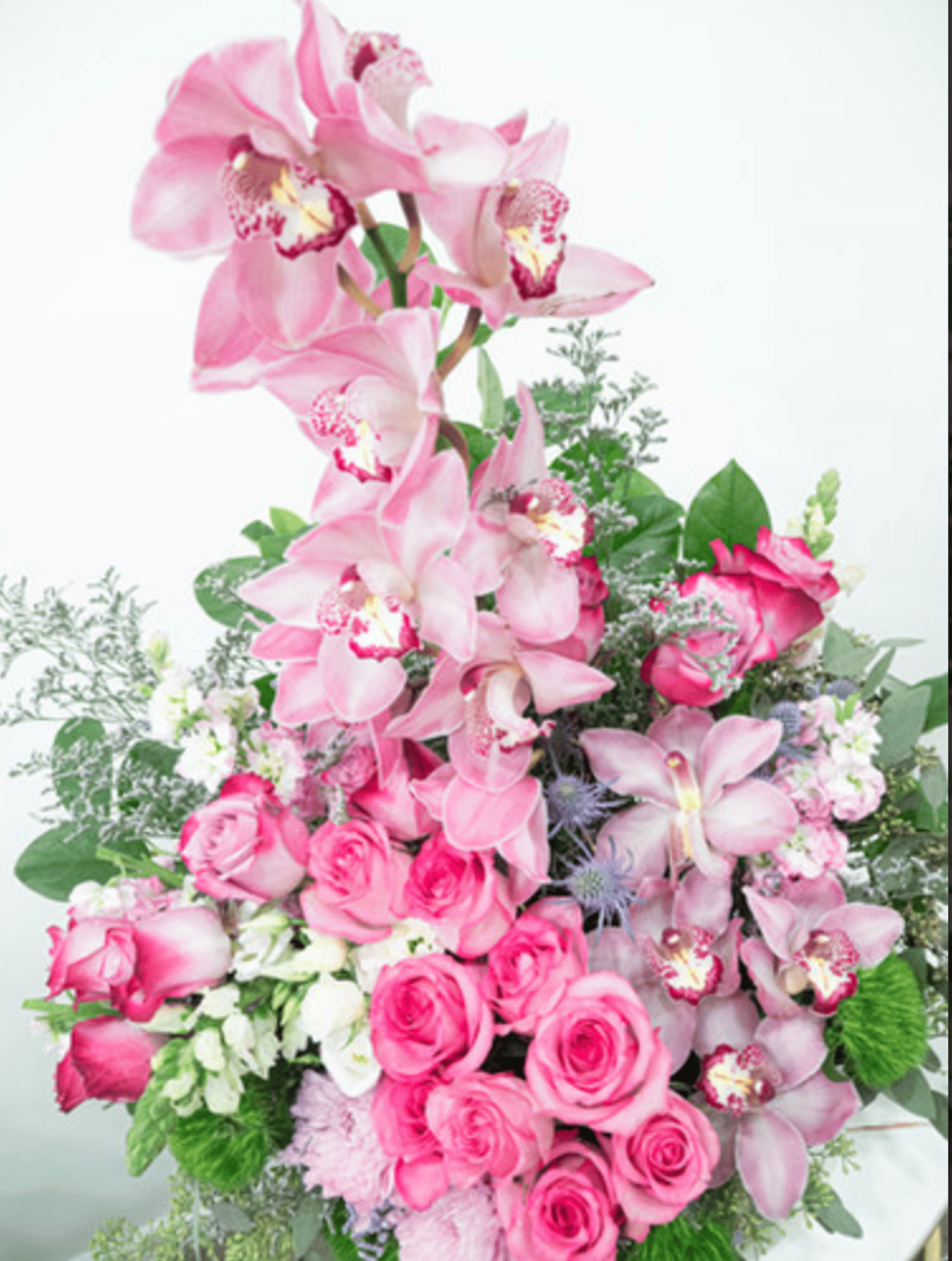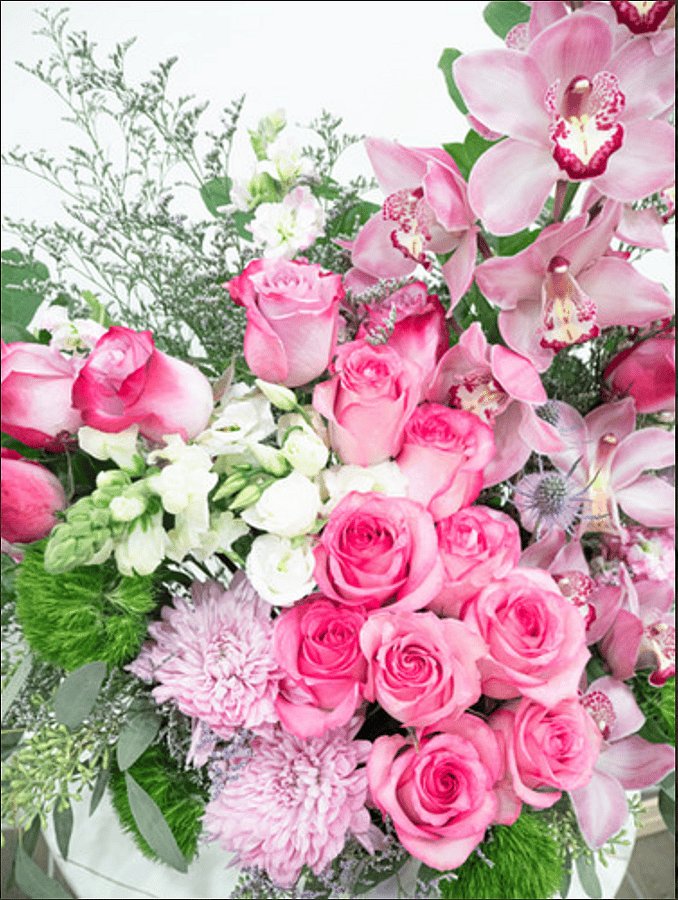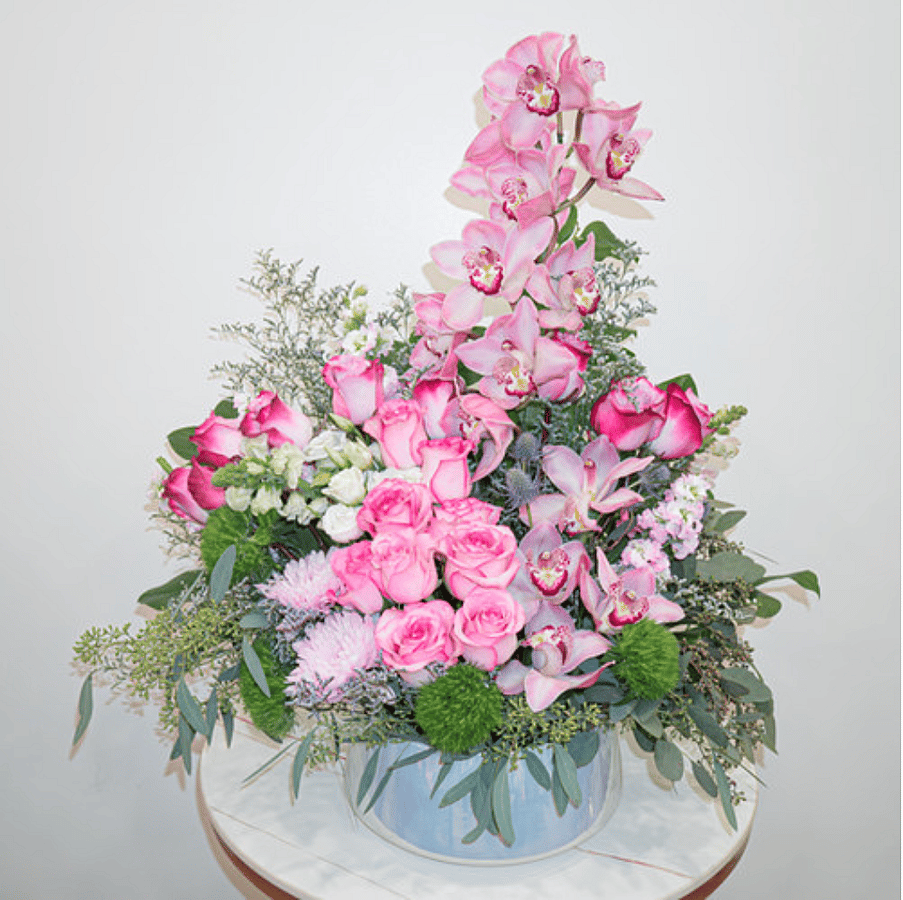 Graceful and romantic, this love arrangement showcases stunning cascade of pink cymbidium orchids, roses, and lilies, accented with lush greenery and delicate textures. Arranged in a modern glass vase, it's a beautiful expression of love, admiration, or appreciation. Perfect for anniversaries, Valentine's Day, or any heartfelt occasion.