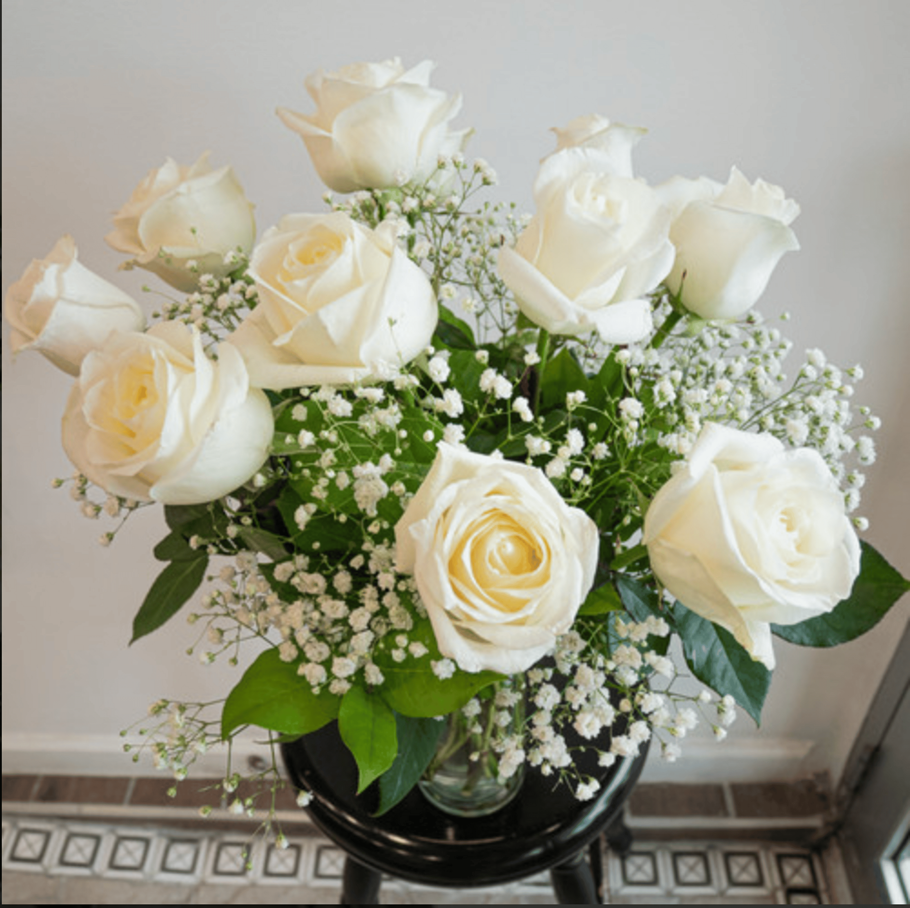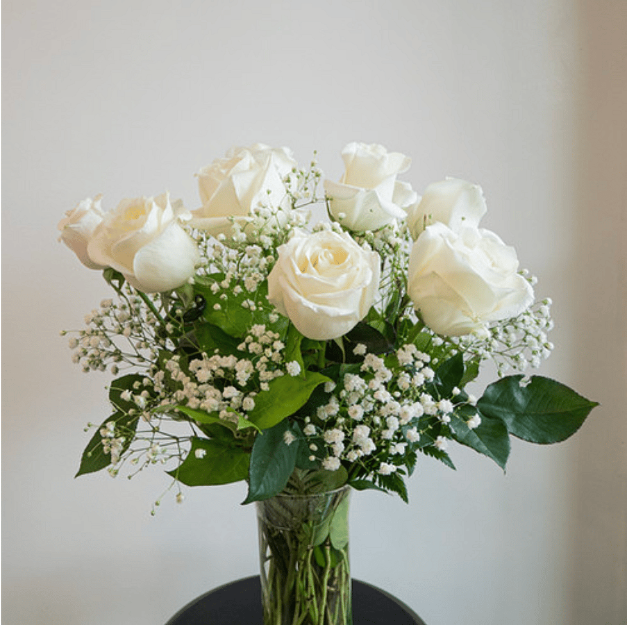 Beautiful and classic 12 white roses are carefully arranged with baby's breath in a glass vase. This elegant piece exudes calm and sophistication, making it a thoughtful choice for anniversaries, sympathy, or simply bring peaceful beauty into any space. The vase is included in our arrangement collection.