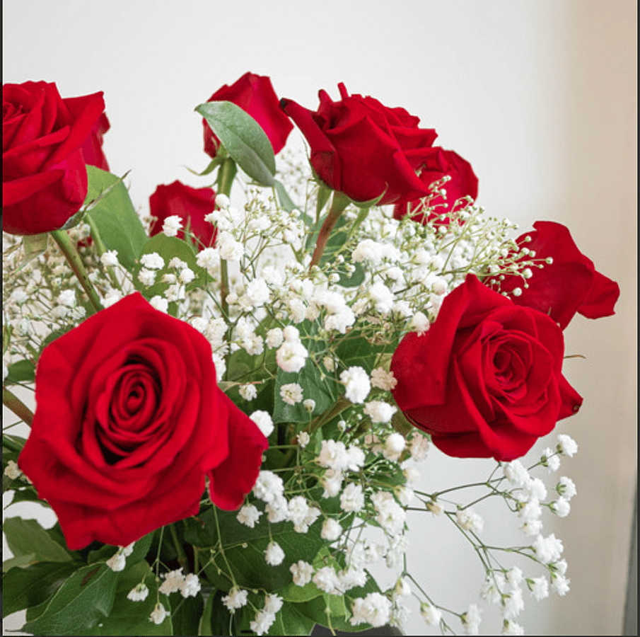 Beautiful and classic 12 Red Roses are carefully arranged with baby's breath. This elegant piece makes a perfect gift on any occasion. The vase is included in our arrangement collection. #vday26
