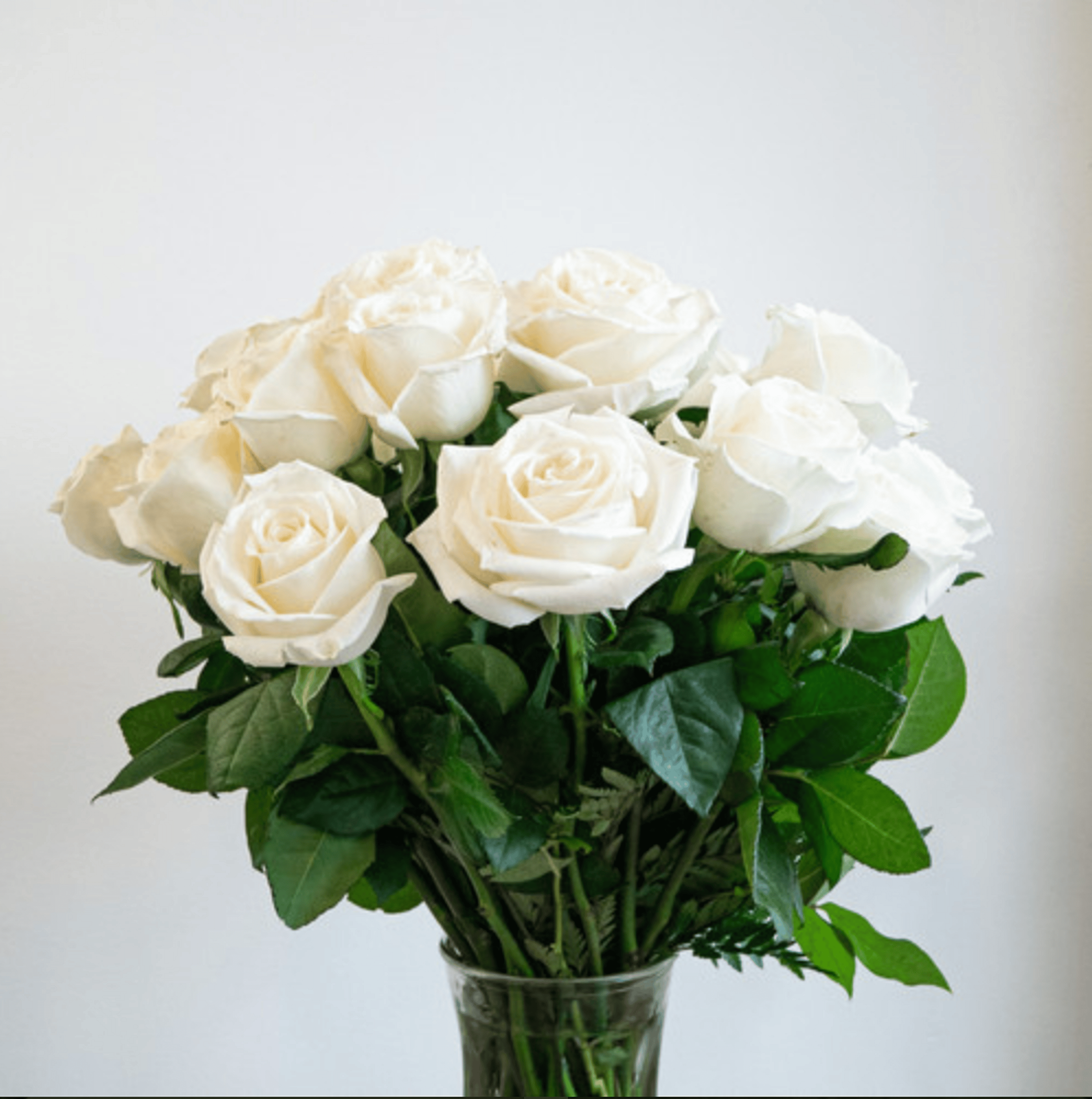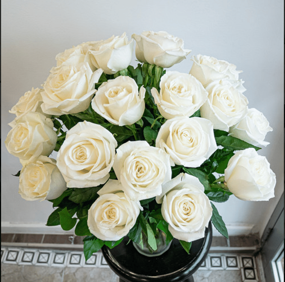 Twenty-four prestine white roses beautifully arranged in a glass vase. Classic and sophisticated, this arrangement symbolizes purity, grace, and new beginnings. Perfect for weddings, anniversaries, sympathy gestures, or simply to brighten someone's day. Vase is included.