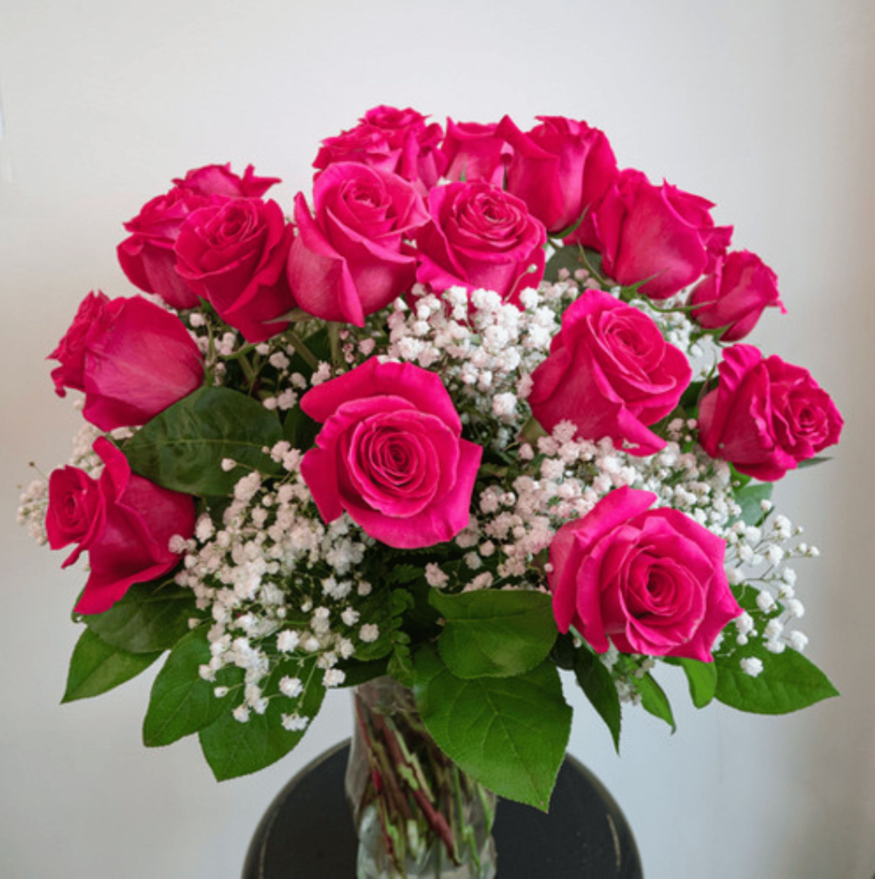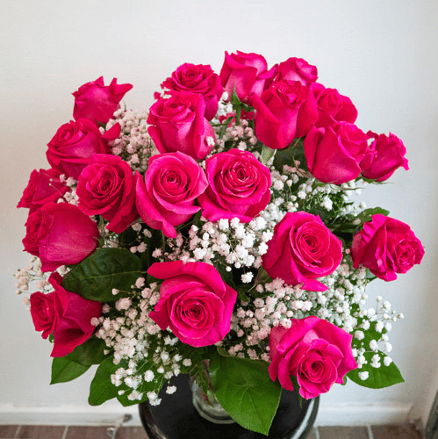 Twenty-four beautiful Hot pink roses carefully arranged in a vase with baby's-breath. This arrangement is perfect for anniversaries, birthdays, or simply to brighten up someone's day!