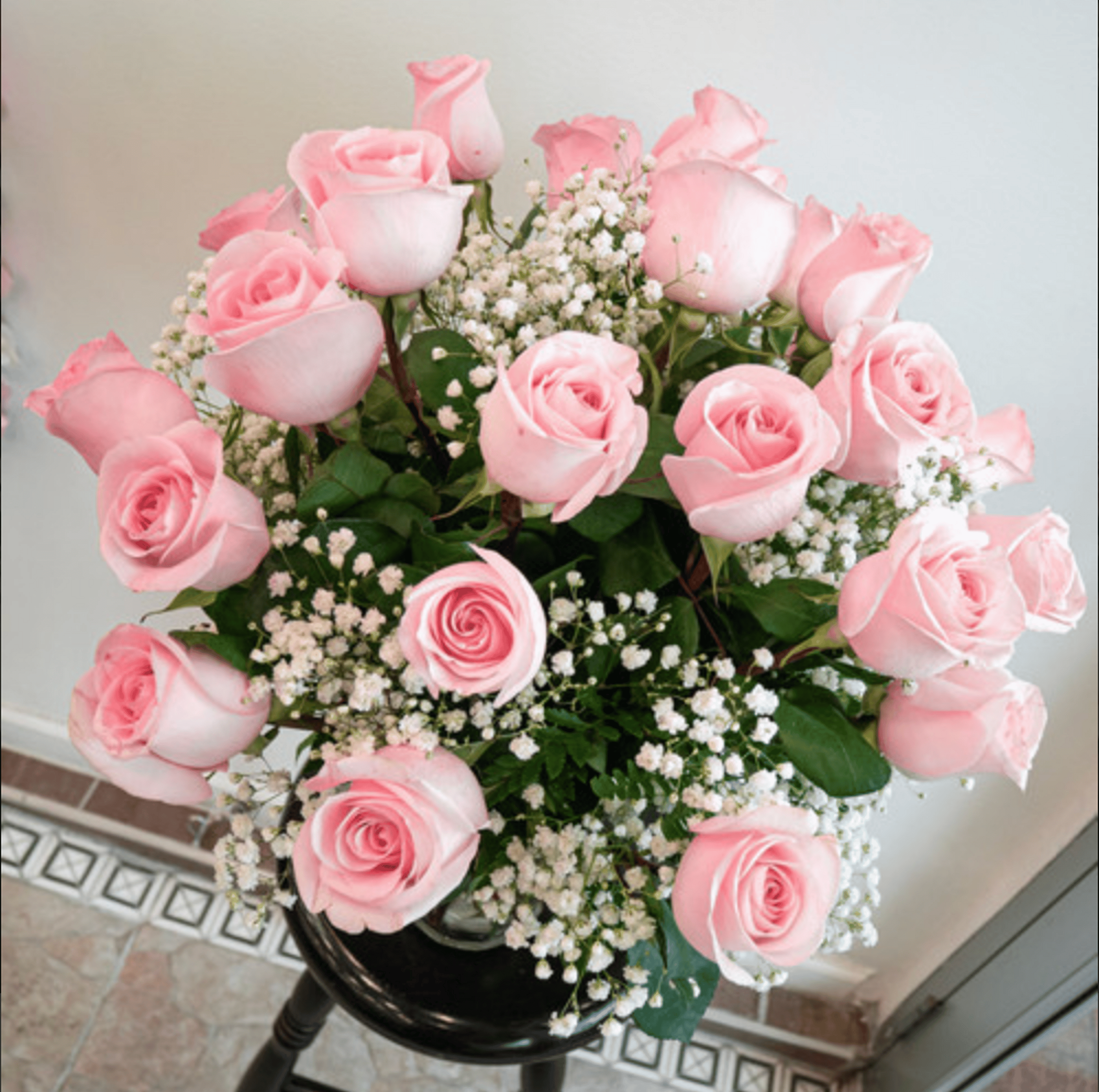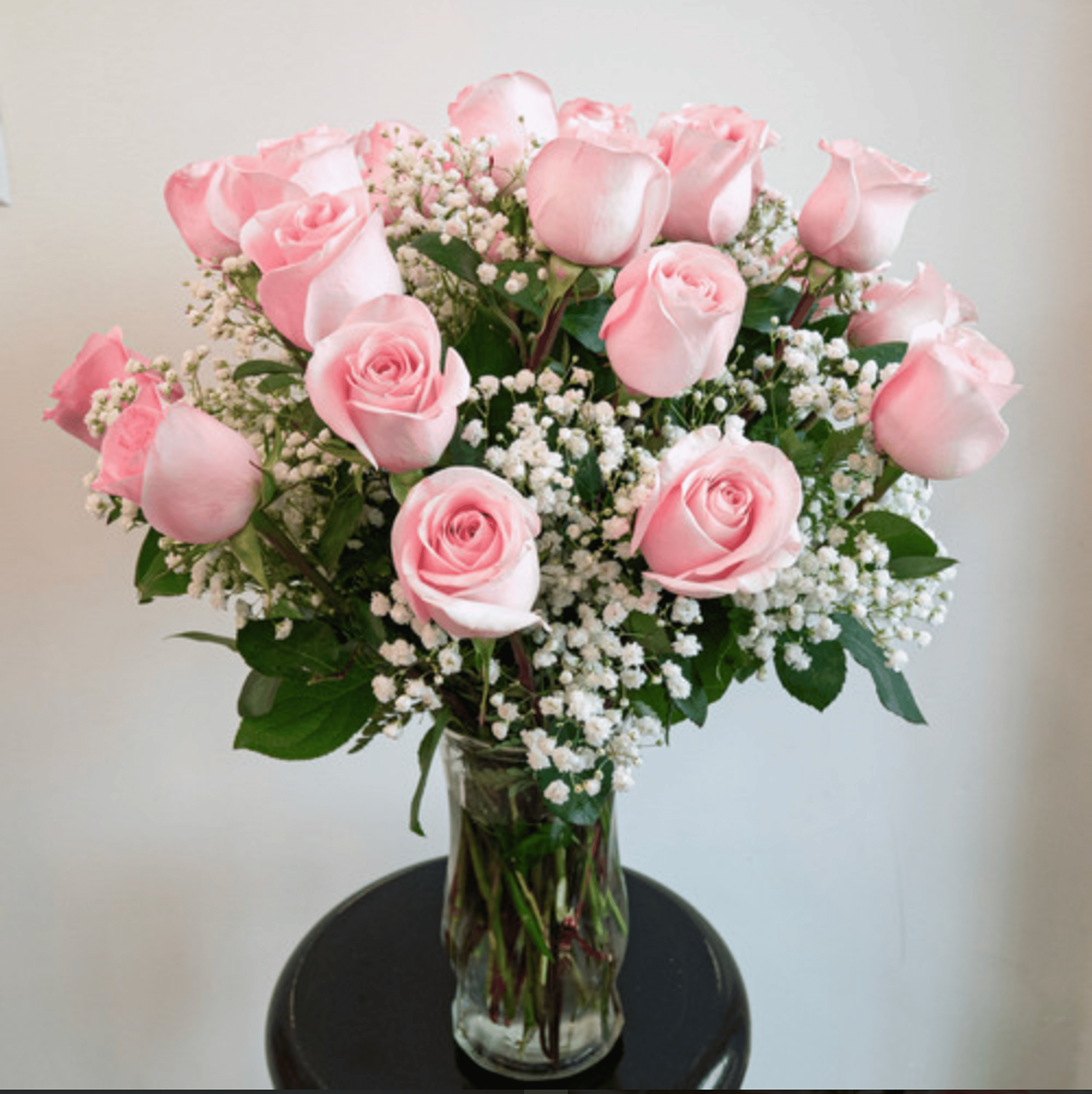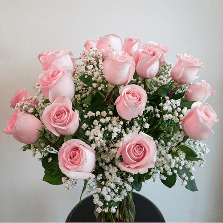Twenty-four pink roses carefully arranged in a glass vase with delicate baby's-breath, making this perfect for anniversaries, birthdays, or just because. The vase is included in our arrangement collection.