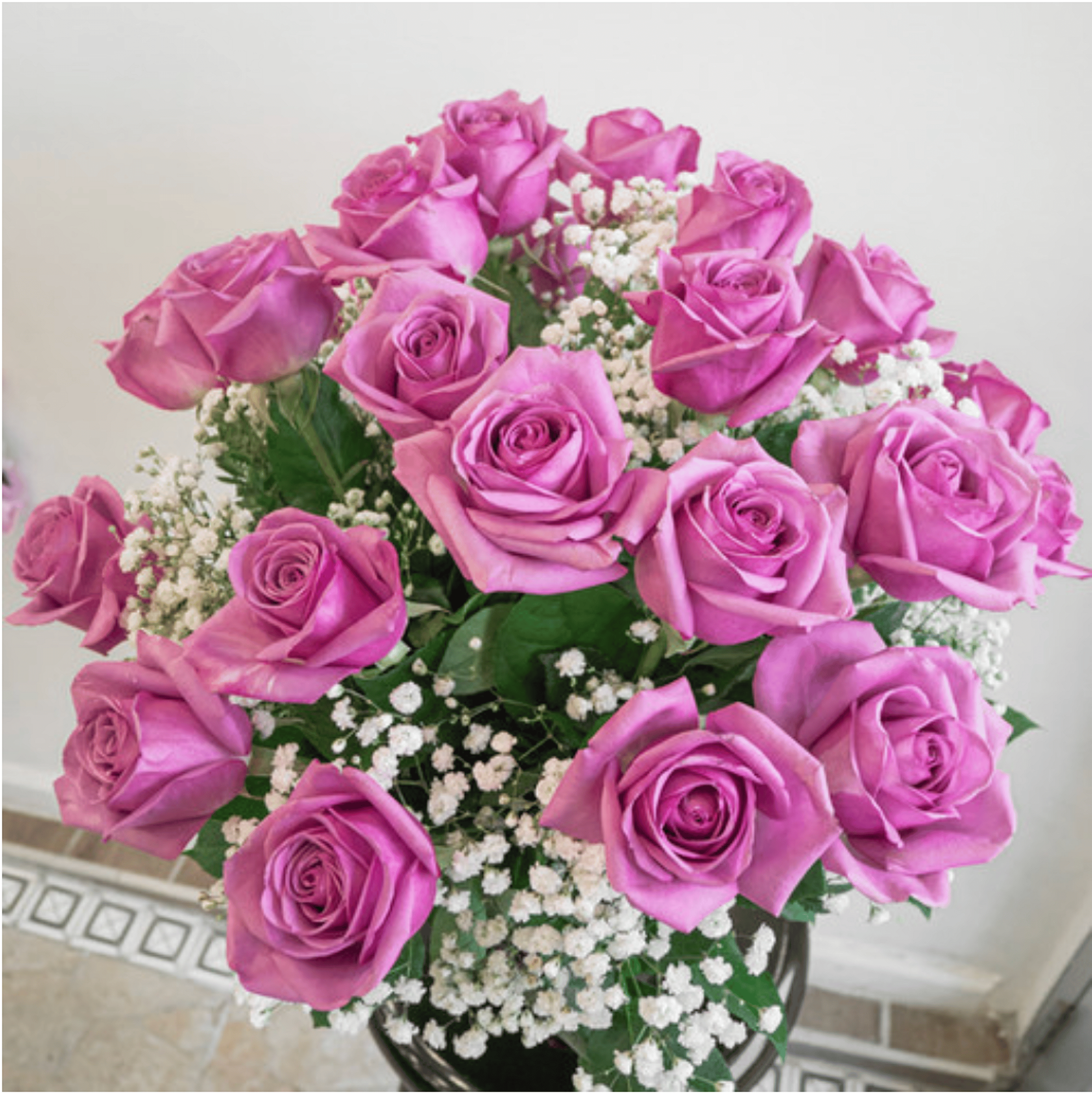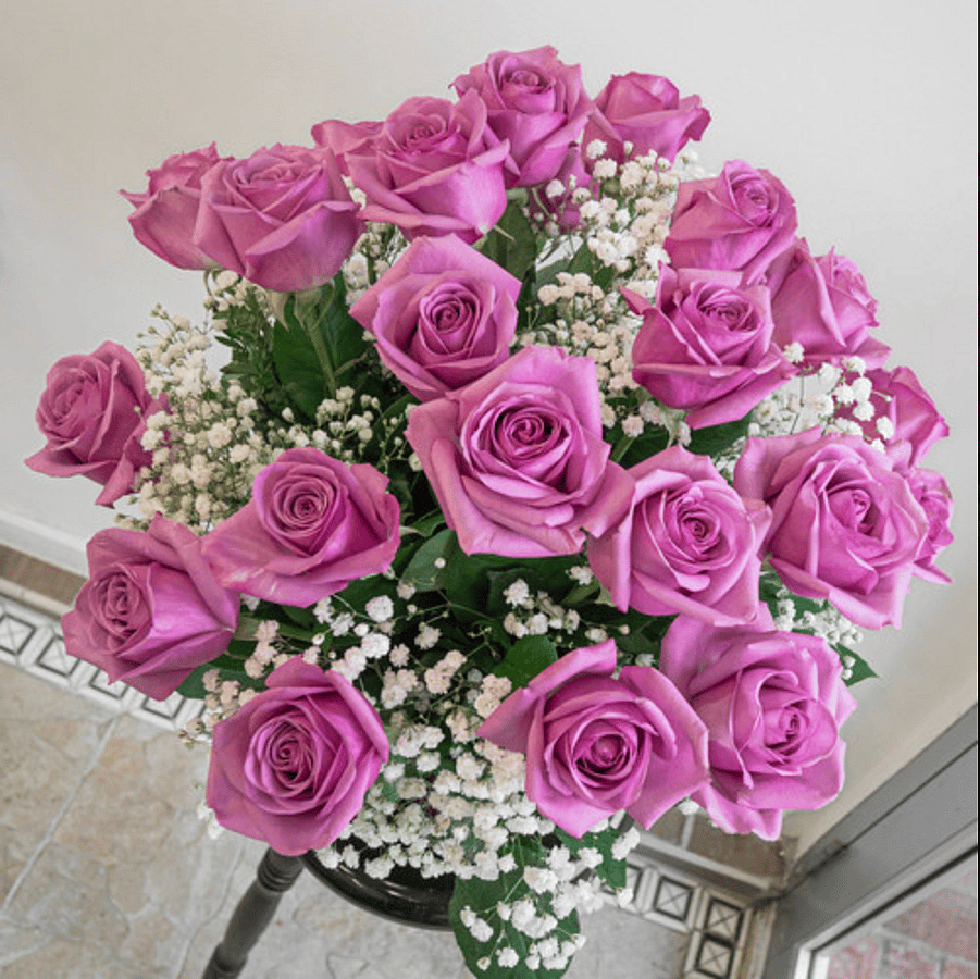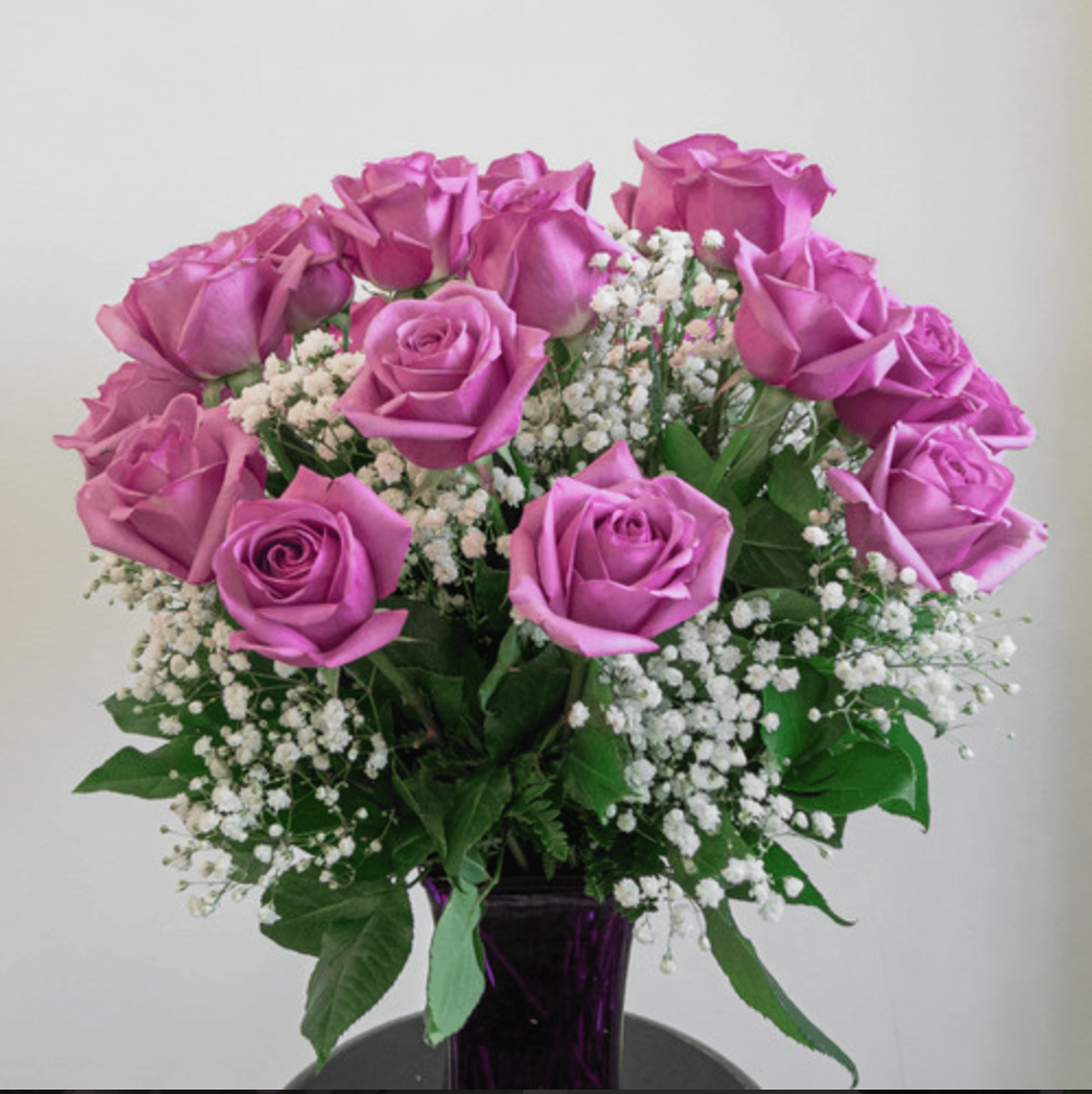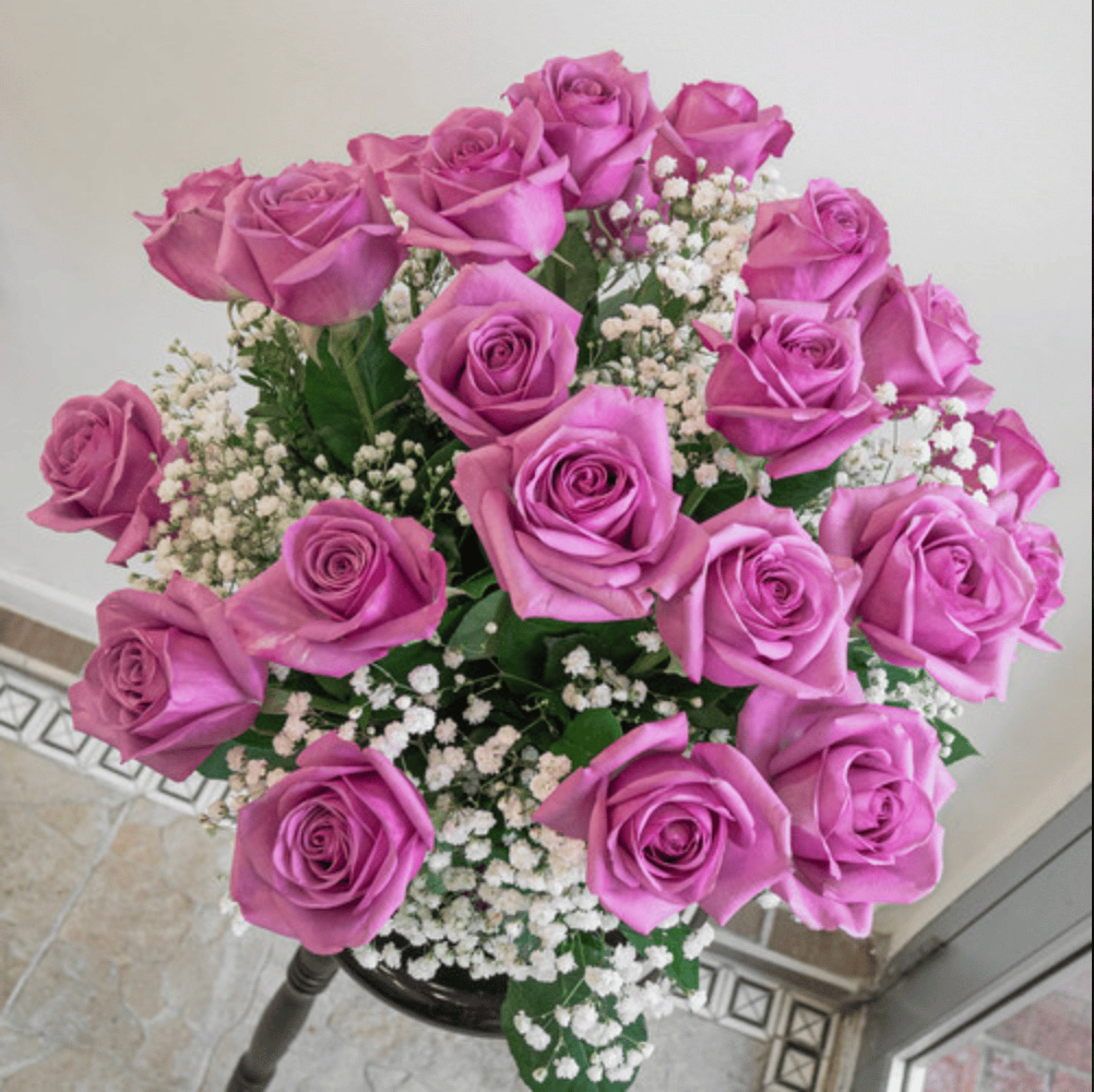 Twenty-four purple roses carefully arranged in a glass vase with baby's-breath. This timeless arrangement conveys admiration, enchantment, and love. Perfect for anniversaries, birthdays, or any occasion where you want to make a lasting impression. The vase is included in our arrangement collection.