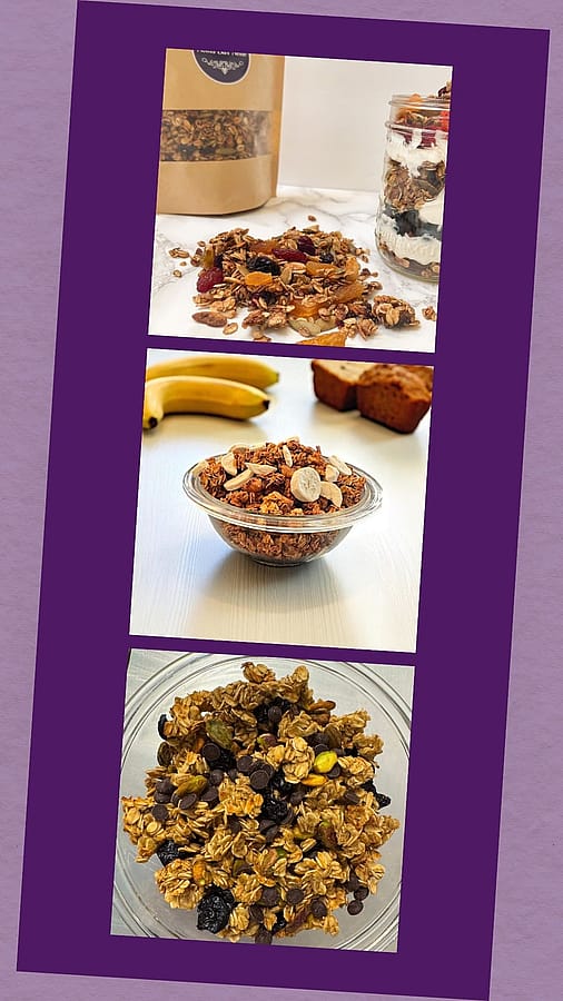One 6 oz. bag of each of our 3 hearty granola flavors offered as a bundled discount: Harvest Granola, Banana Bread Granola, and Chocolate Cherry Pistachio Granola. #forthefoodieli