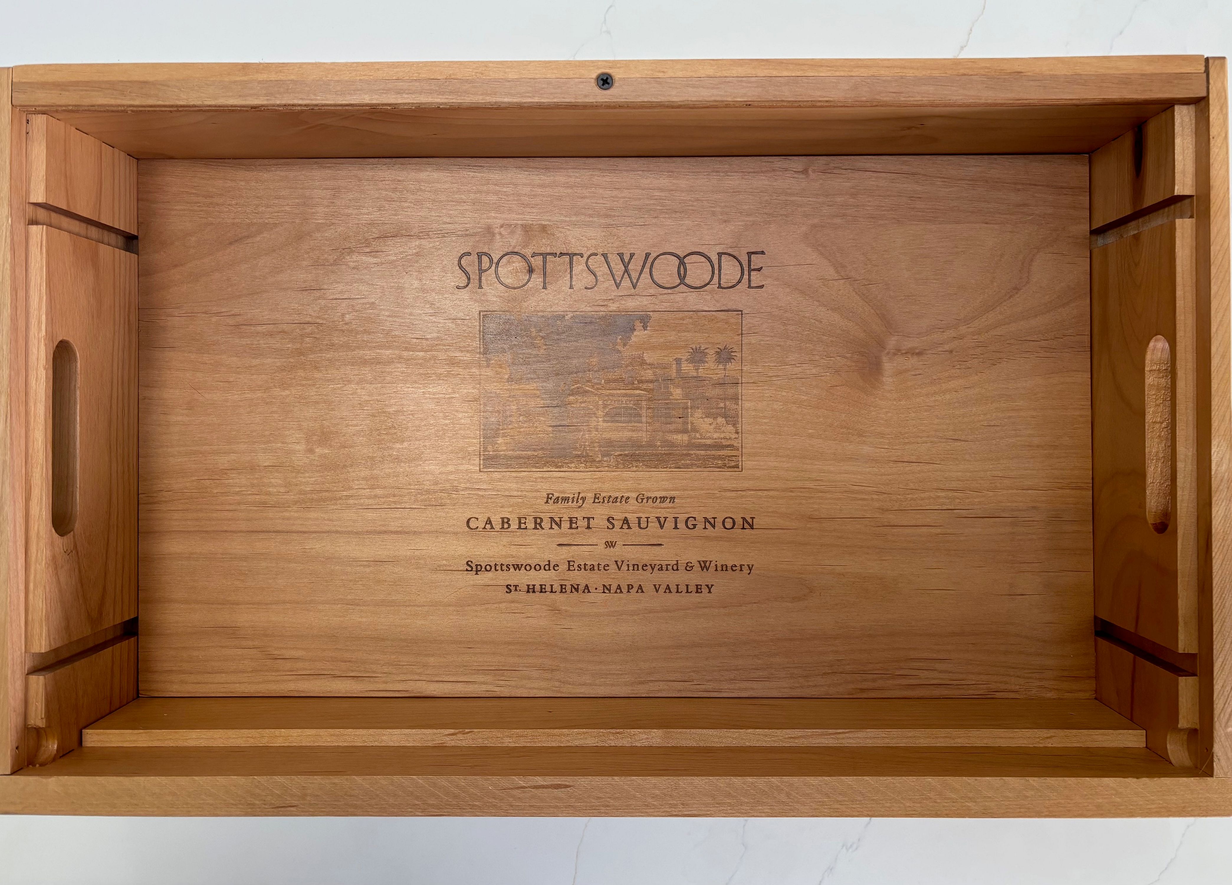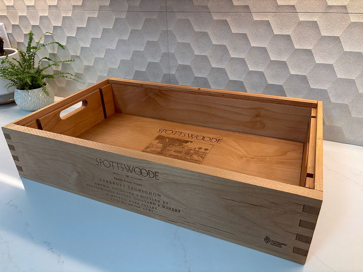 This tray is made from a repurposed Spottswoode wooden wine box that measures 23w x 14dx 4.75h. Spottswoode Family Winery is located in St. Helena in Napa Valley specializing in organic farming. The tray has printing on all sides and the handles are cut through on each end.