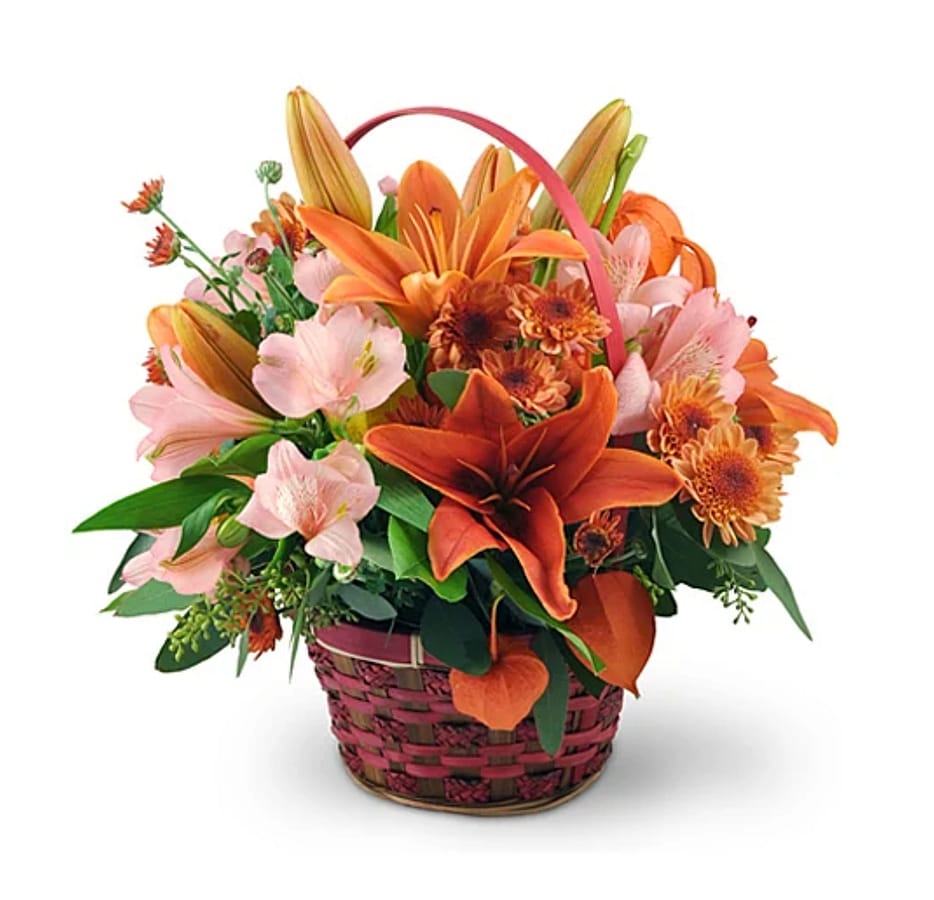 Capture their hearts with pink alstroemeria and orange Asiatic lilies arranged with chrysanthemums, Chinese lanterns, seeded eucalyptus, and salal.