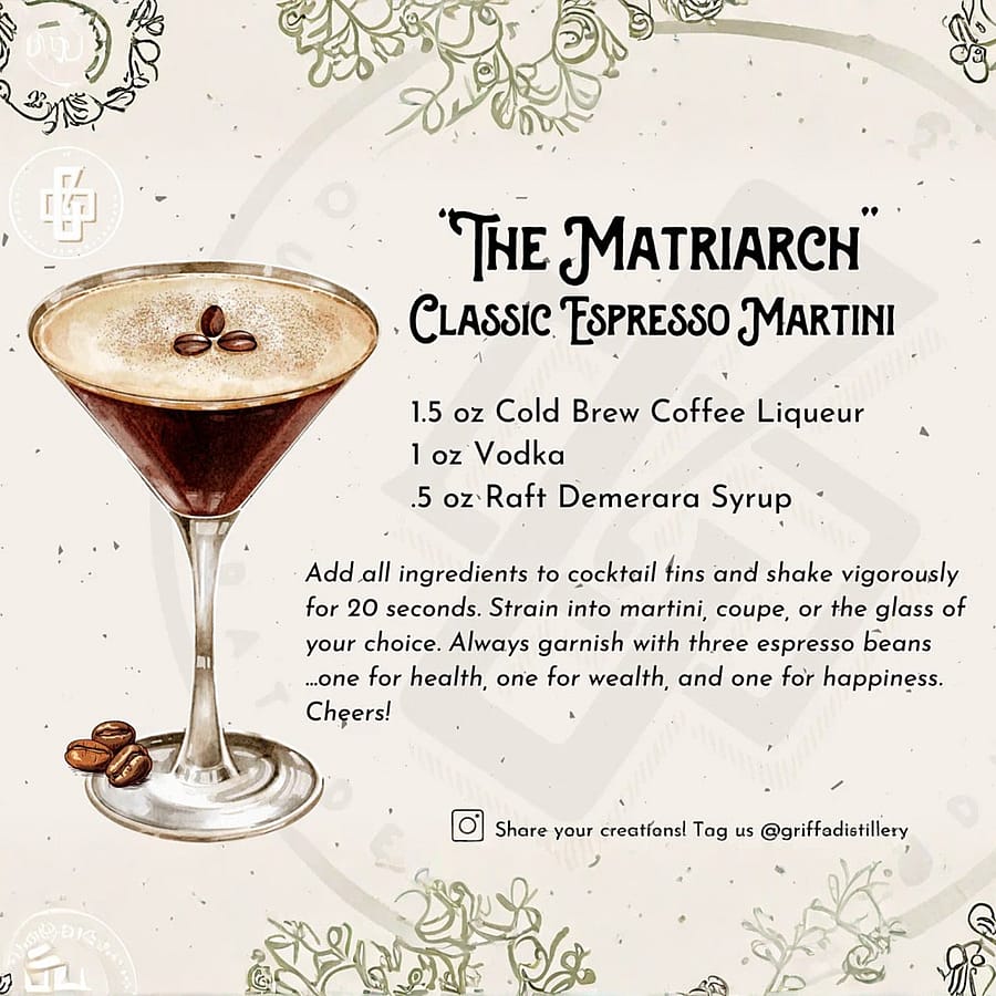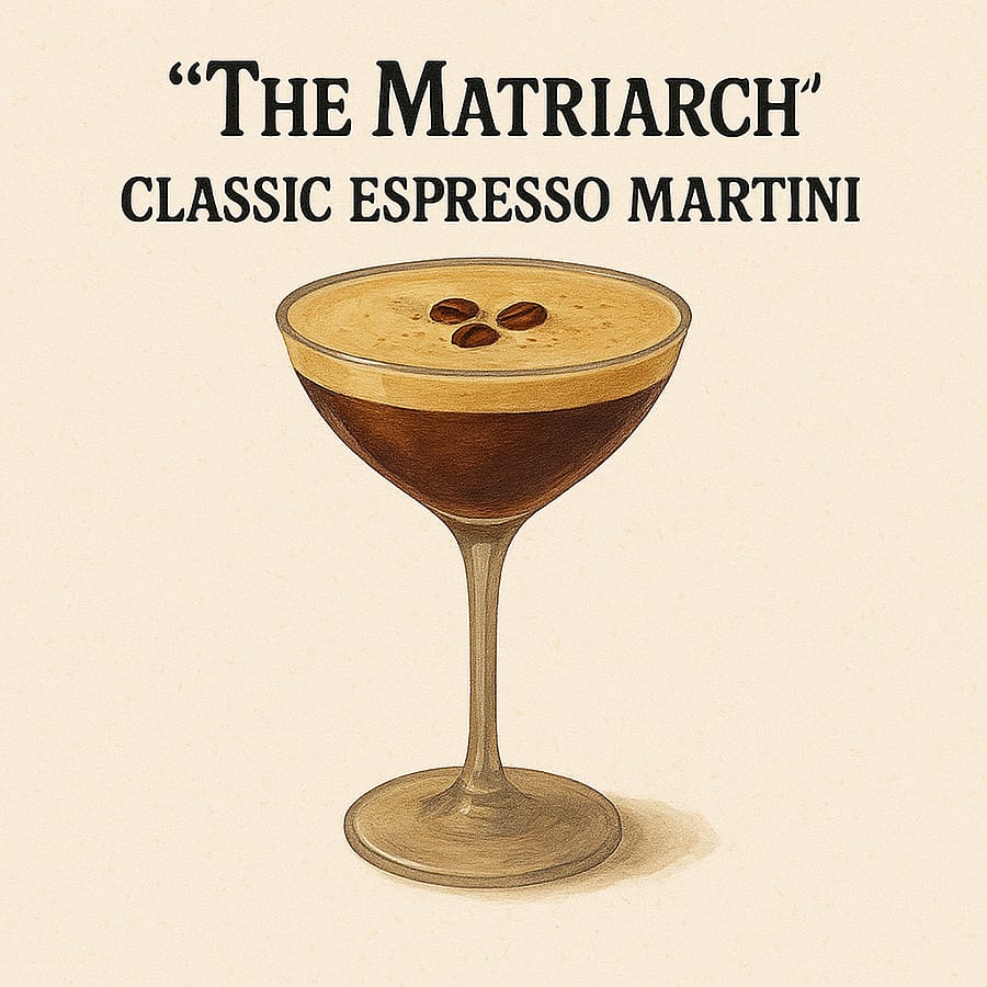 Our signature Espresso Martini, "The Matriarch." Indulge in the rich flavors of our take on this classic, a perfect blend of cold brew coffee liqueur, vodka, and demerara.