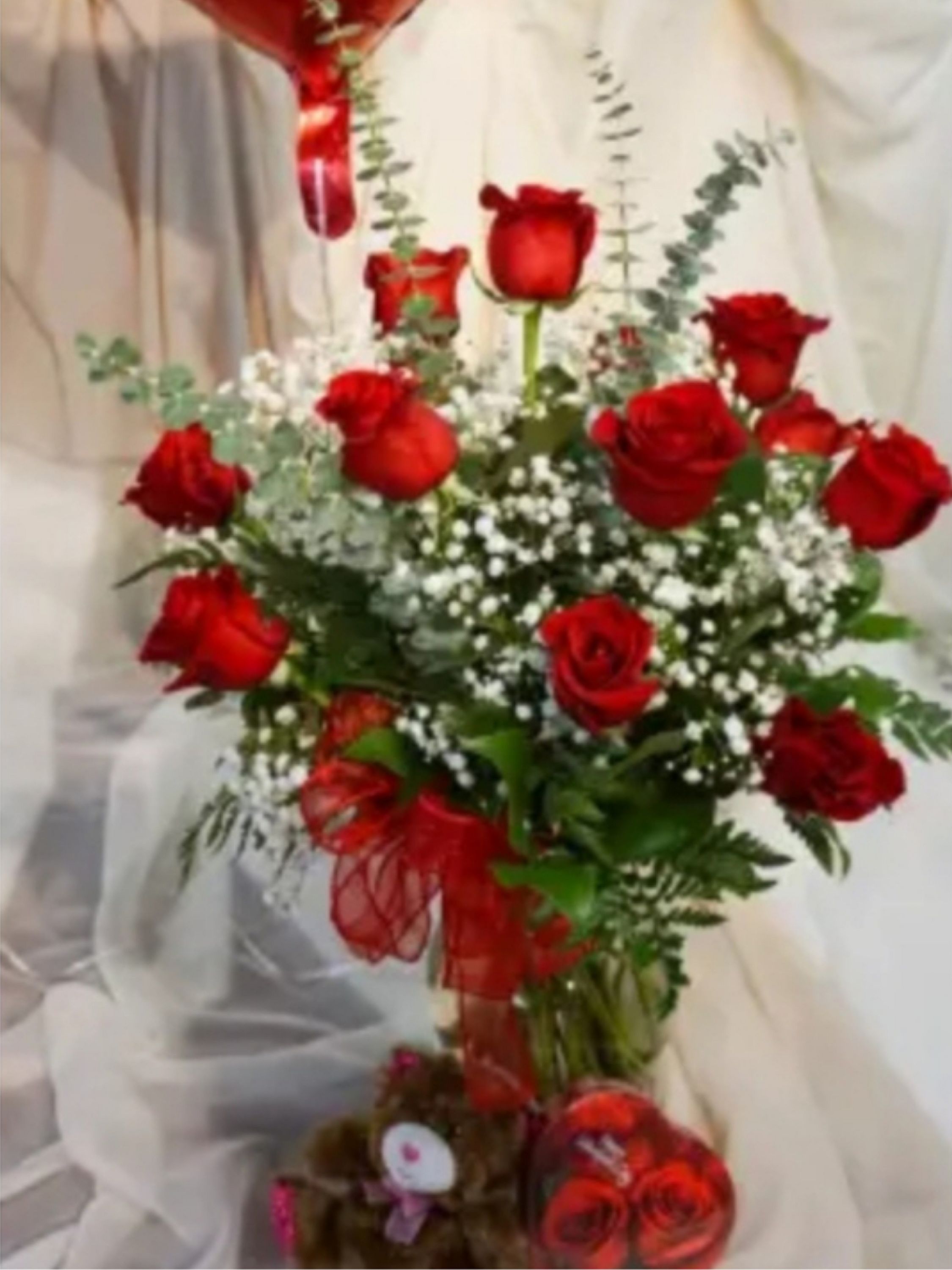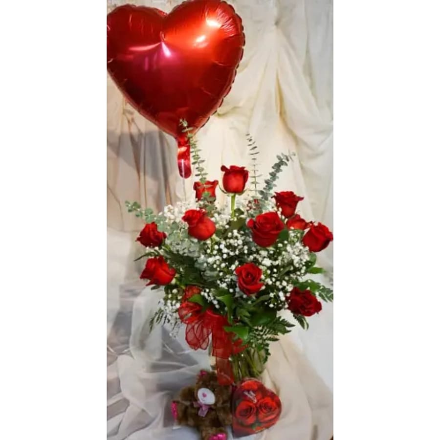 This combo includes 1 dozen roses, box of chocolate, teddy bear and balloon. #vday26