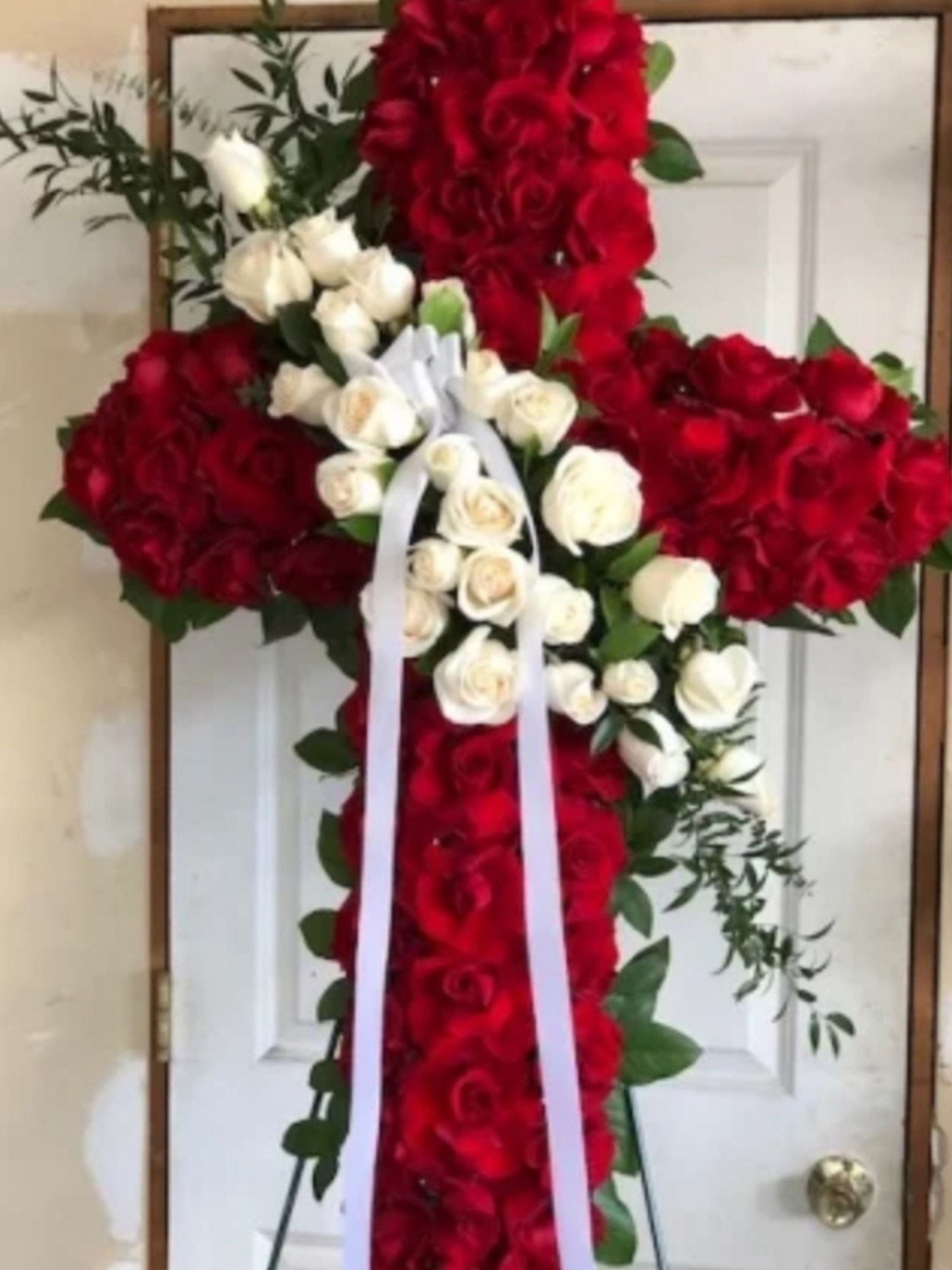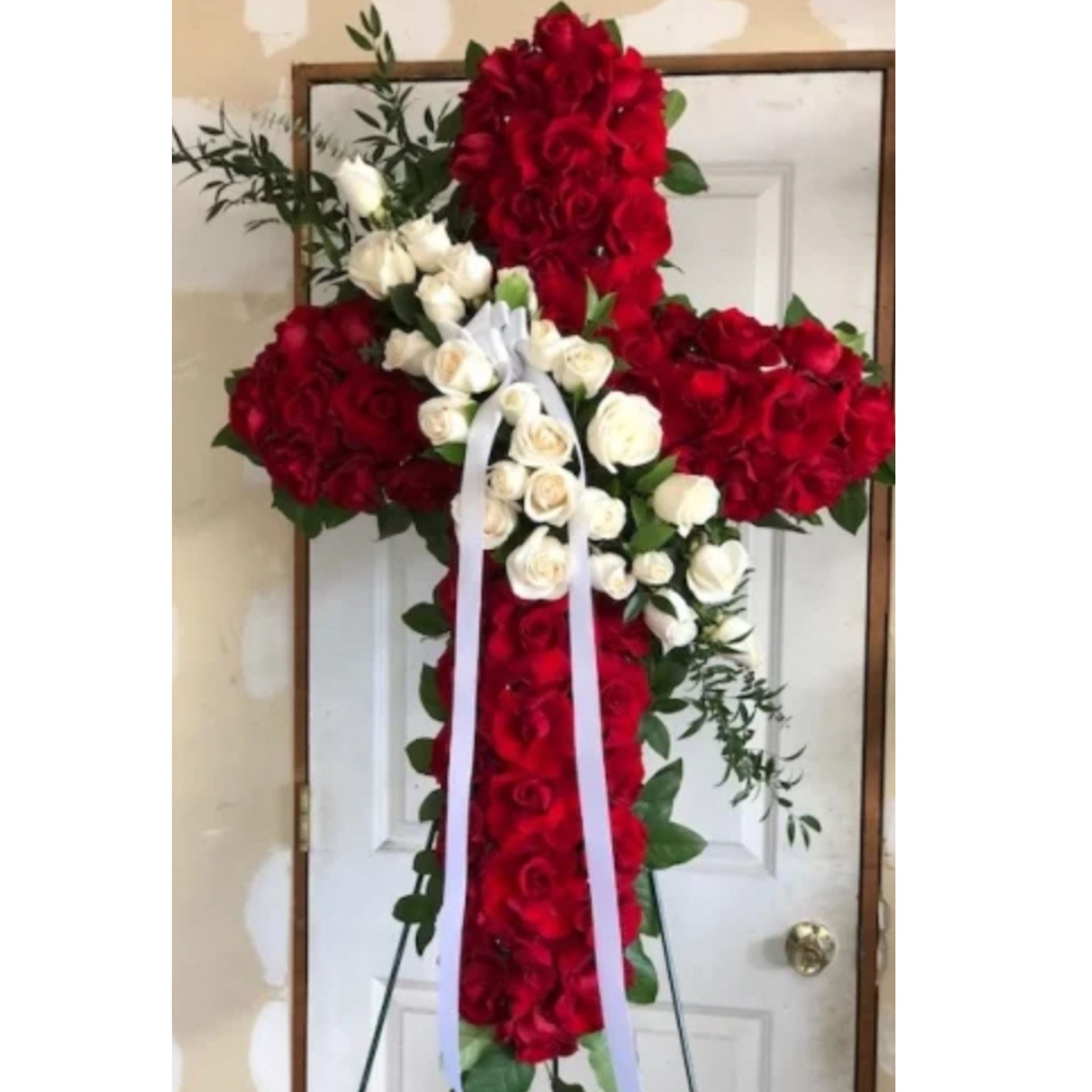 A beautiful all red custom cross with a hint if white roses by Creations De Bellle