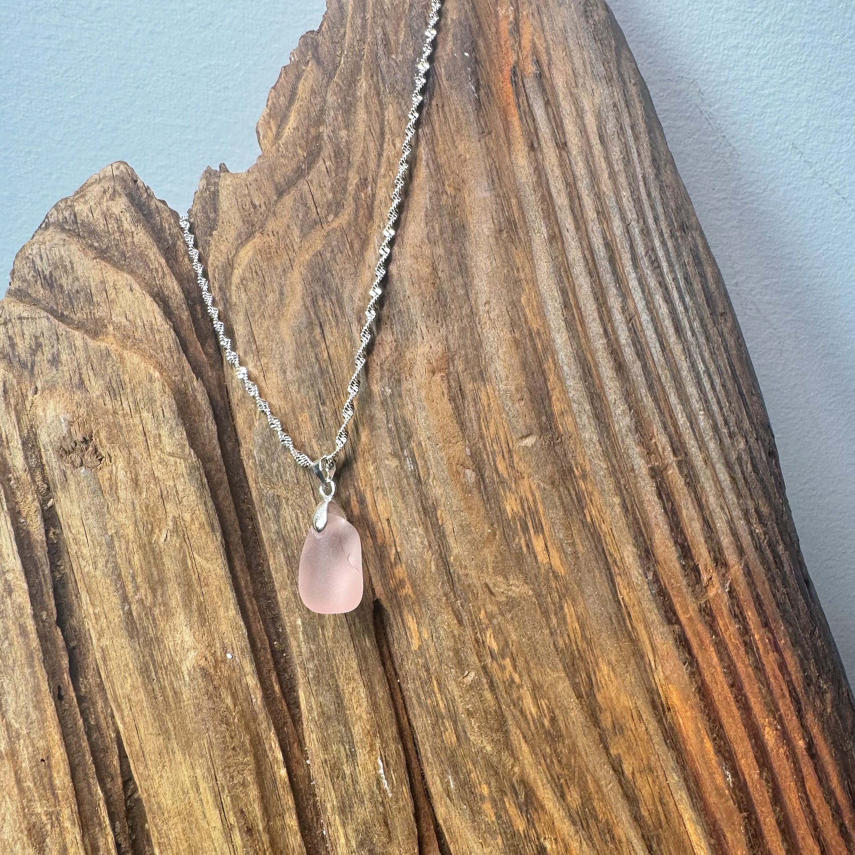 Embrace coastal elegance with this rare Pink Sea Glass Necklace, featuring a genuine piece of ocean-tumbled glass beautifully suspended from a 22-inch sterling silver–plated chain (925). Each piece of pink sea glass is naturally unique, making your necklace truly one of a kind. Its soft blush hue catches the light with a subtle shimmer, adding a touch of seaside serenity to any outfit.