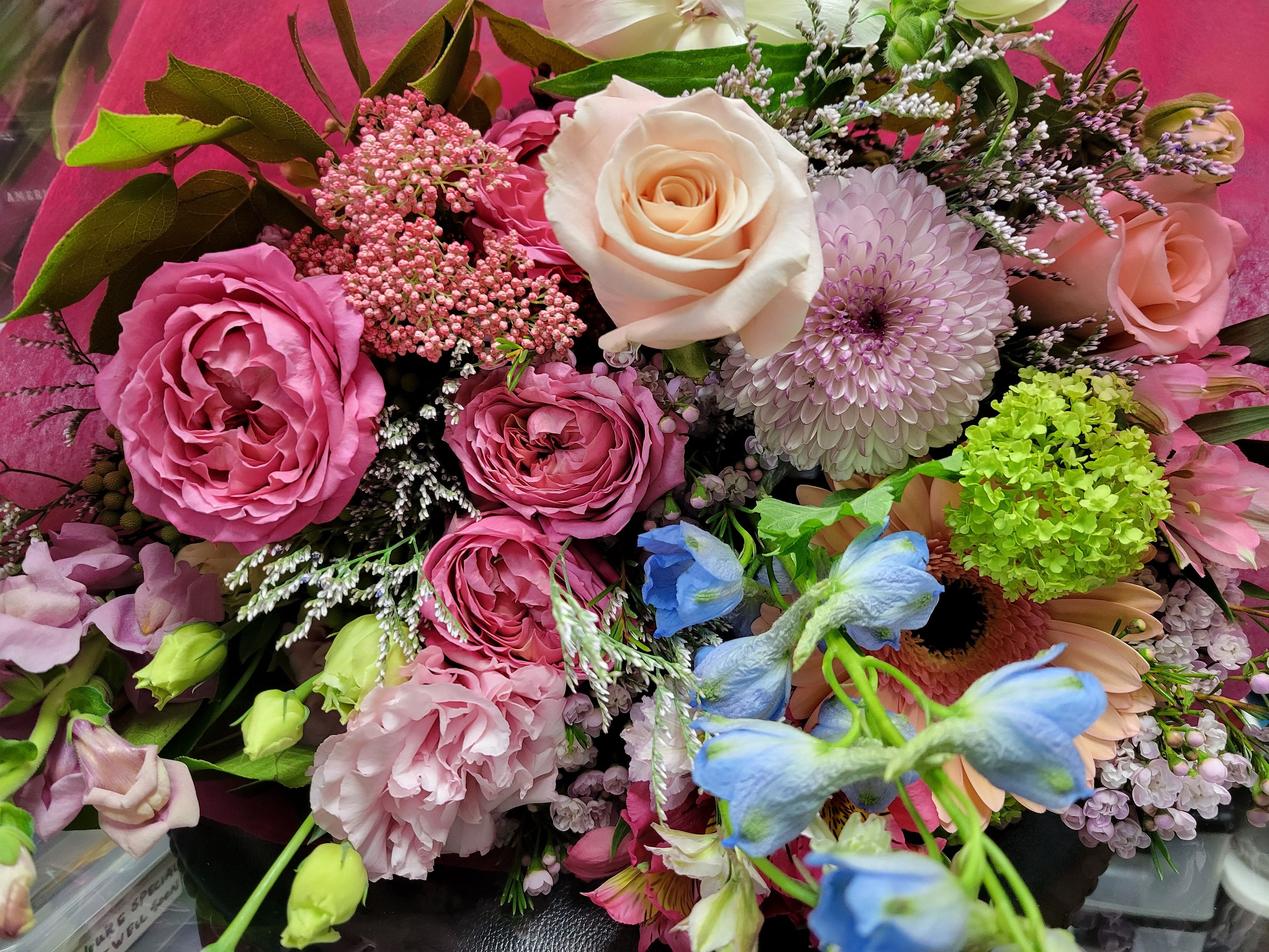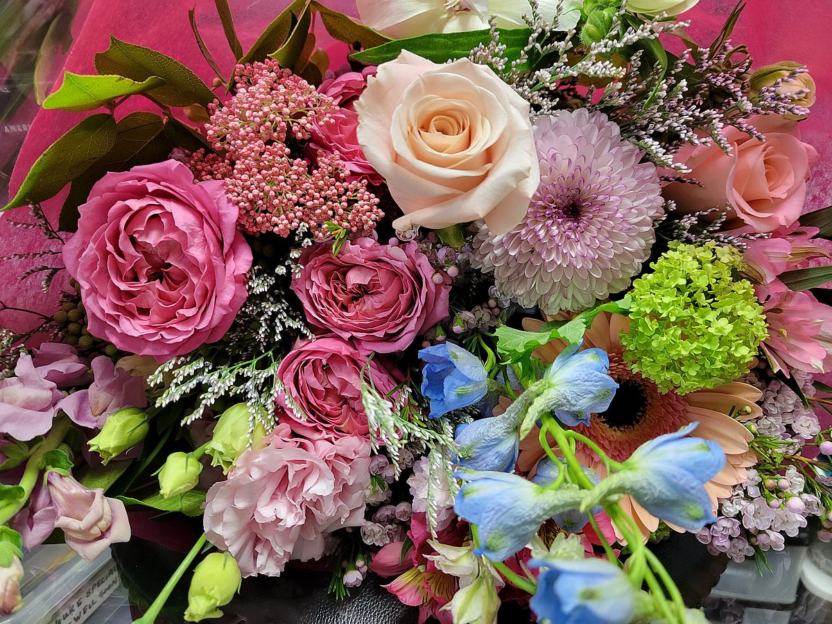 A beautiful display of our freshest and prettiest flowers and greens in vibrant hues, artfully arranged, wrapped, and ready to be put into a vase.