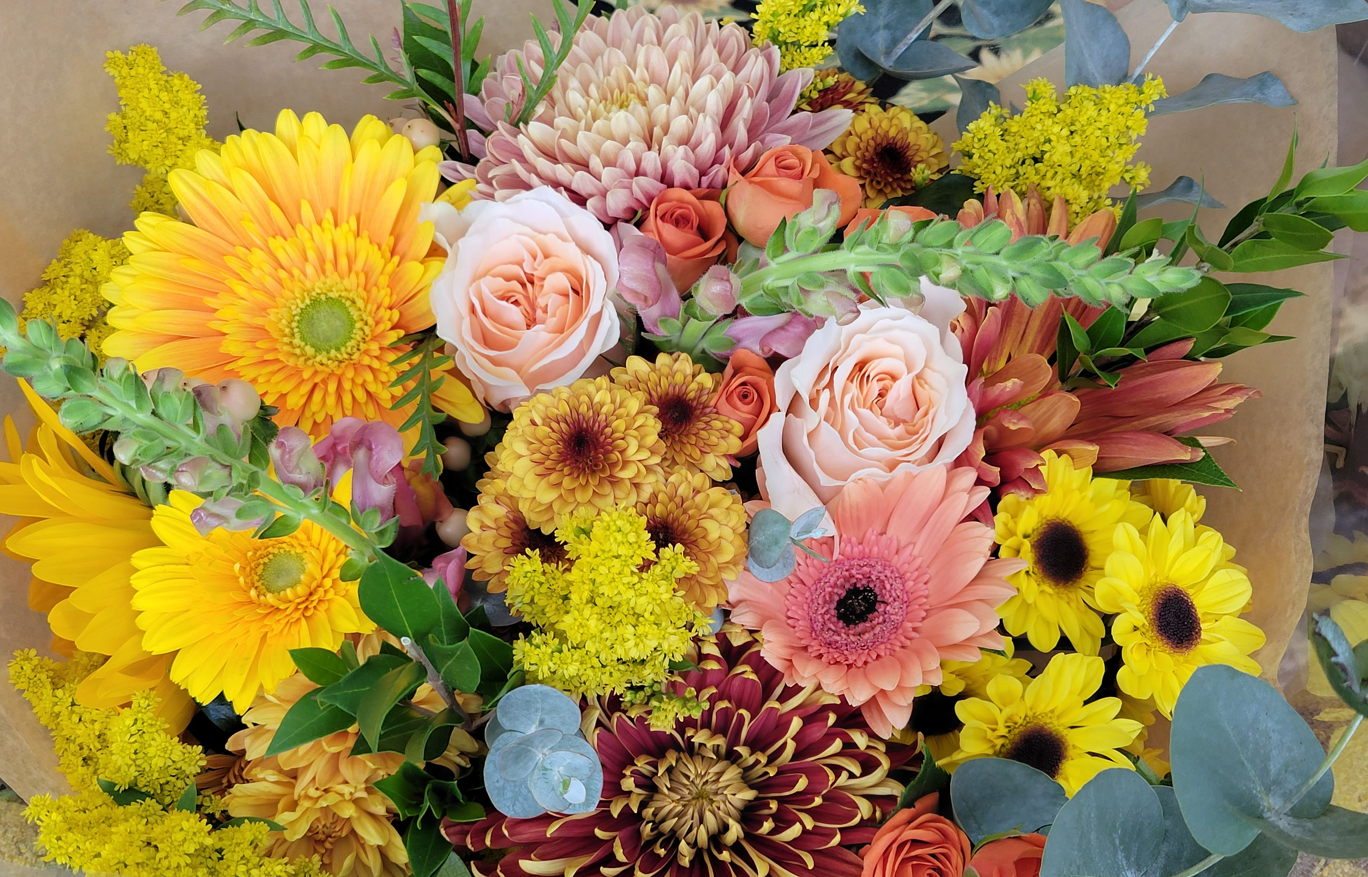 A beautiful display of our freshest and prettiest flowers and greens in vibrant hues, artfully arranged, wrapped, and ready to be put into a vase.