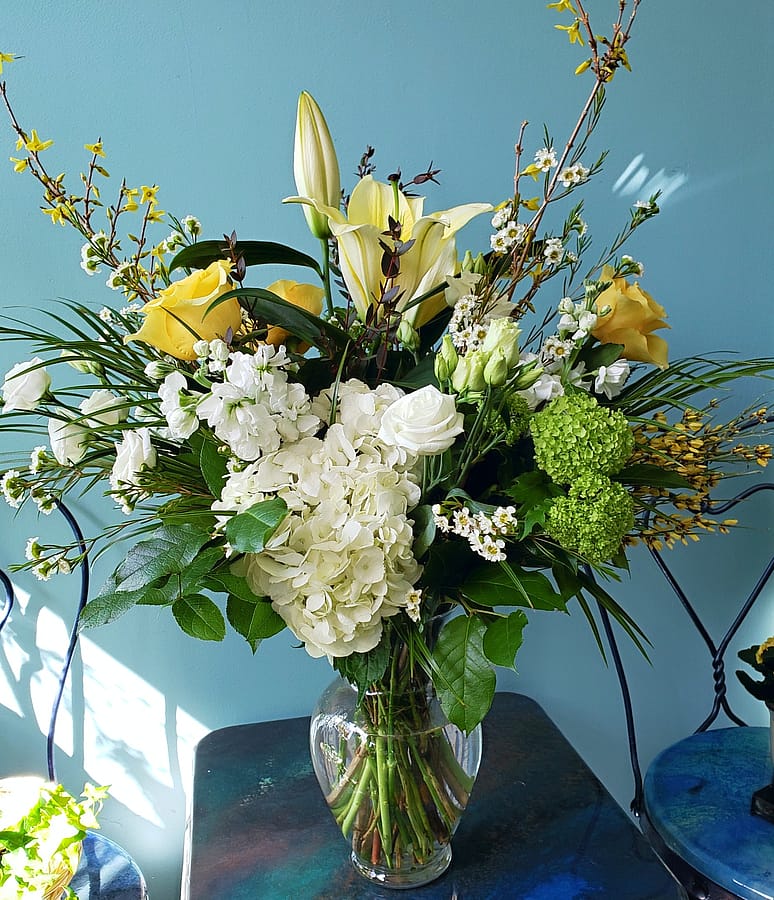 *Image shown reflects our Deluxe size arrangement. Flowers and colors are Designer's Choice and are usually reflective of the current season. Our selection of flowers can change weekly based on market availability. Please call ahead at least 24-48 hours if you are looking to order specific varieties.