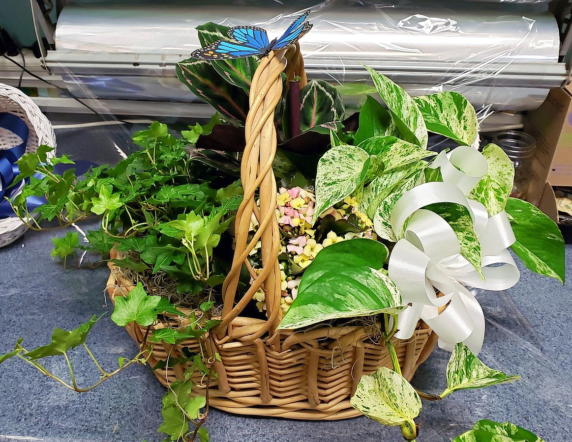 A wicker basket filled with an assortment of potted green and houseplants. Plants remain in their plastic pots and are arranged in a lined basket and finished with Spanish moss.