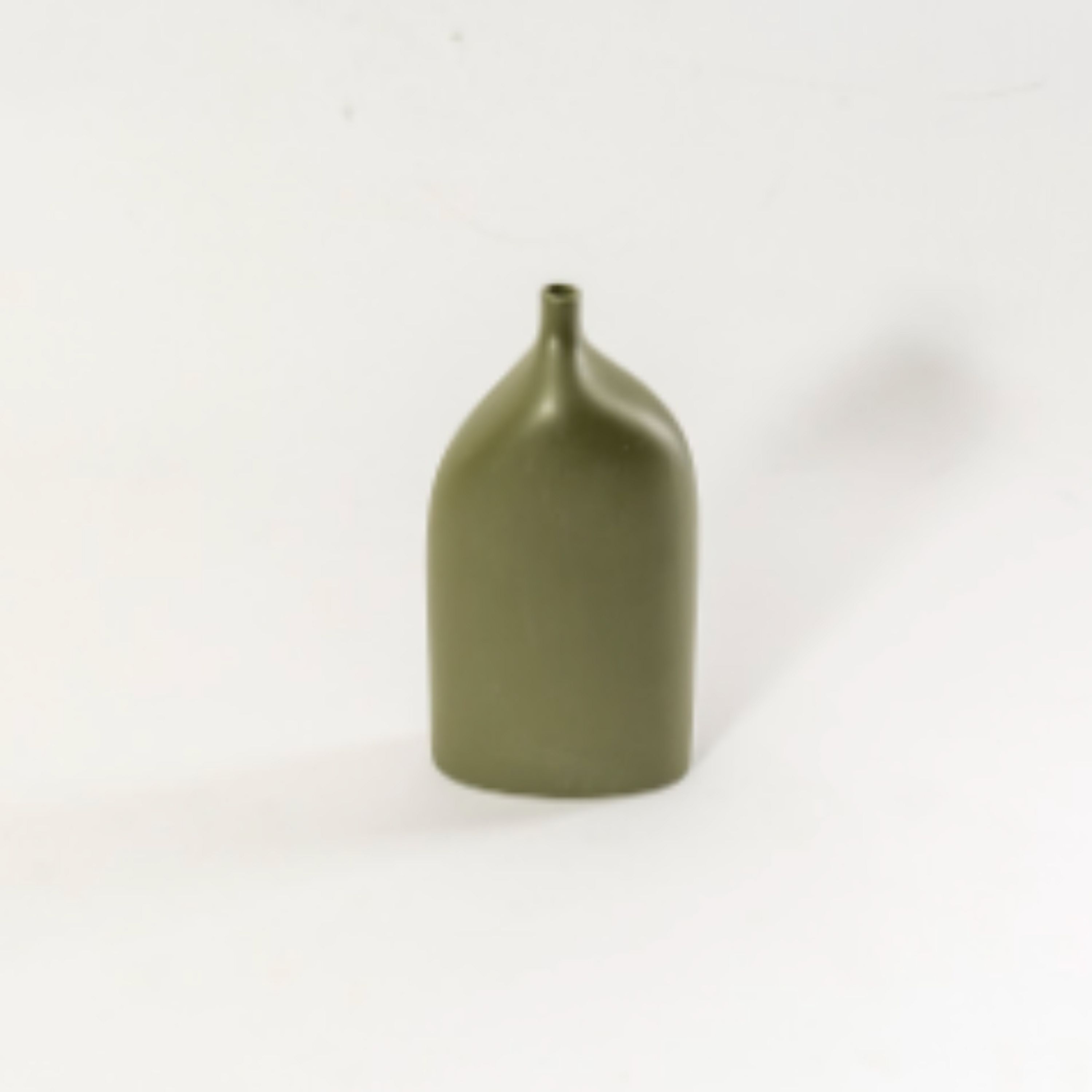 This handmade vase stands out with its simple and elegant form. The soft olive green tone adds a calming touch to modern and natural interiors. Its slim neck design makes it perfect for displaying a single stem or delicate floral arrangements.