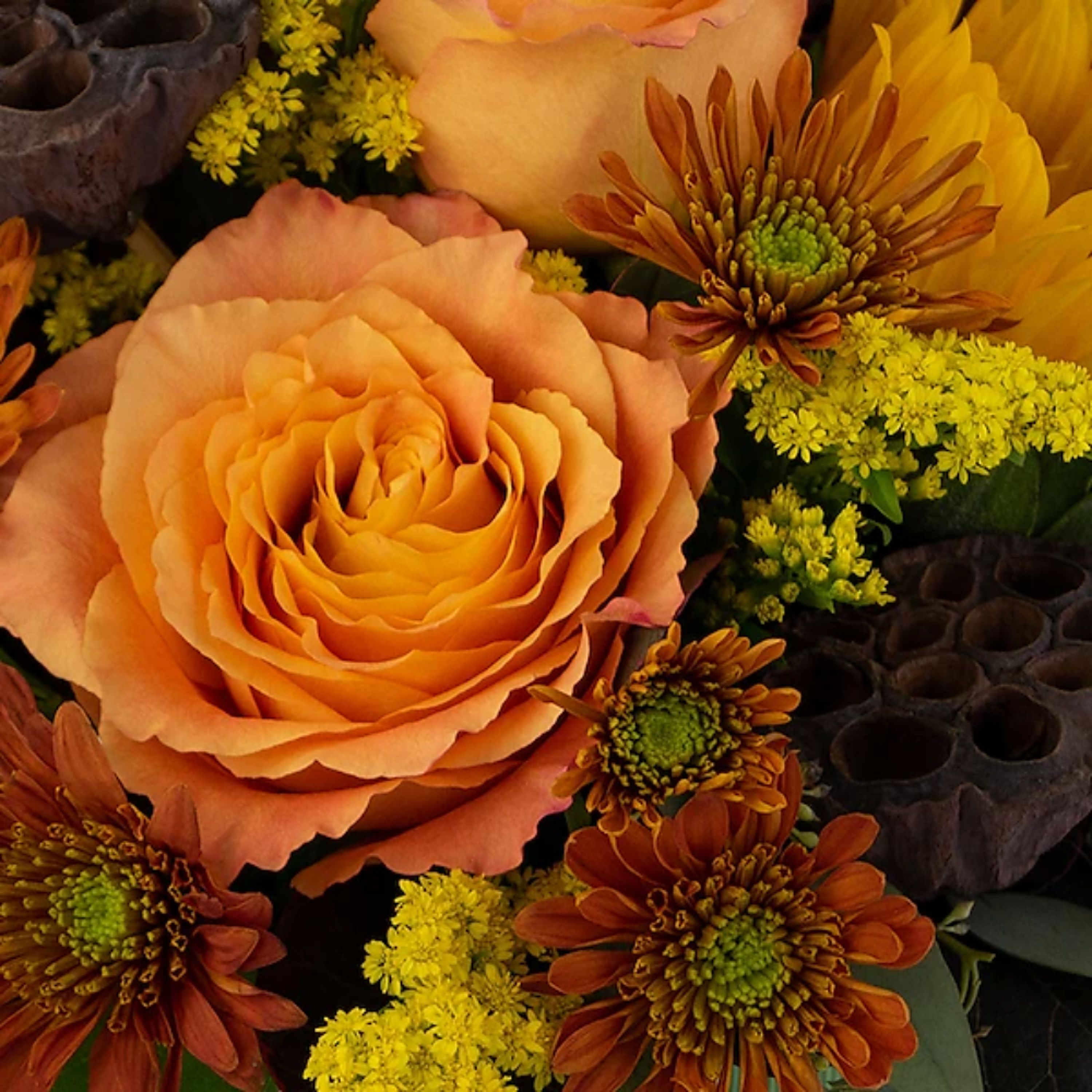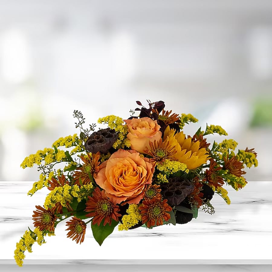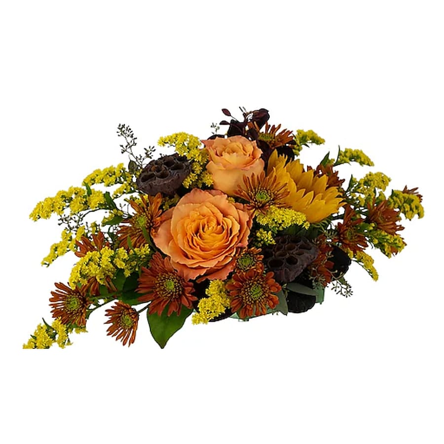 Sit back, relax and make a few Woodsy Wishes for the fall days that are quickly approaching. A blend of flowers like Roses, Sunflowers, Solidago, Mums and Lotus Pods are arranged in a low dish. * Approximately 12"W X 8"H * Container may vary.