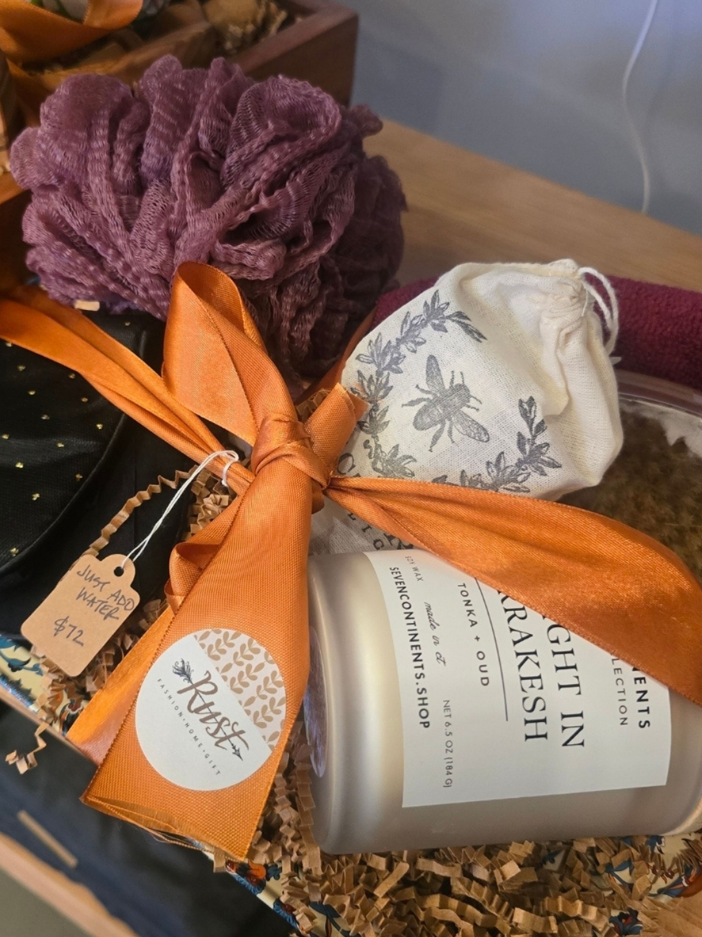 Presented on a stylish, Turkish-inspired tray, this set includes everything you need to unwind after a long day. Soft, fragrant soap and bath salts, soothing scrubbing mitts and towels, a calming candle, and a silky eye mask set the scene for relaxation. Delivered right to your door, all that's left to do is to run the bath!