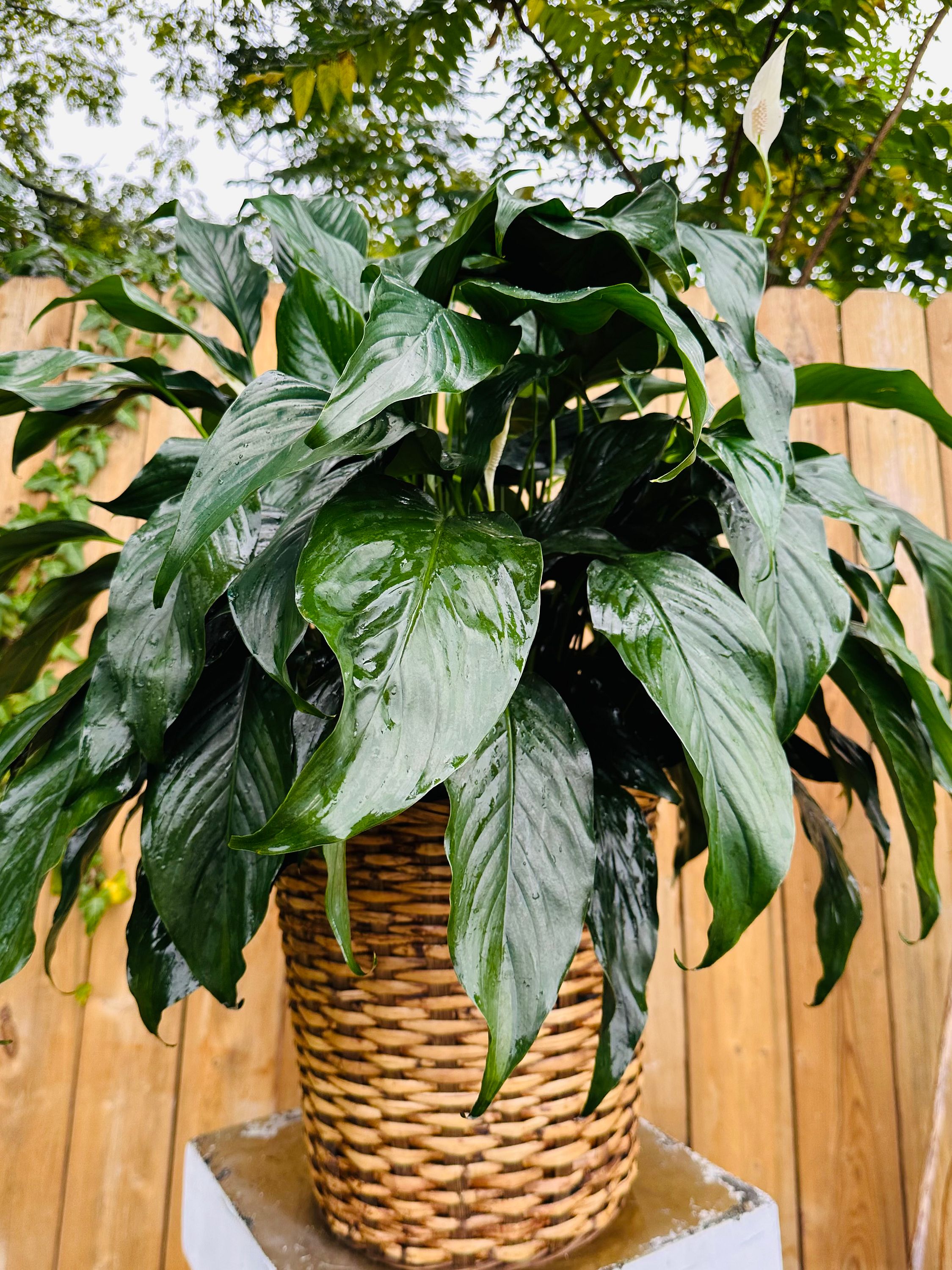 A lush and vibrant plant presented in a woven basket. Known for its glossy green leaves and elegant white blooms, this plant is easy to care for and ideal for any home or office, it's a thoughtful gift that brings natural beauty and tranquility to any space.