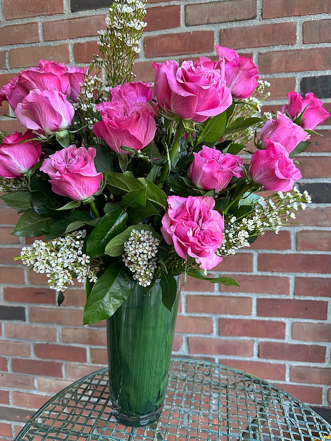 A dozen Beautiful Pink roses with chamelaucium flowers displayed in a tall green glass vase. Accented with lush greenery and delicate white filler blooms, this bouquet radiates beauty and sophistication.