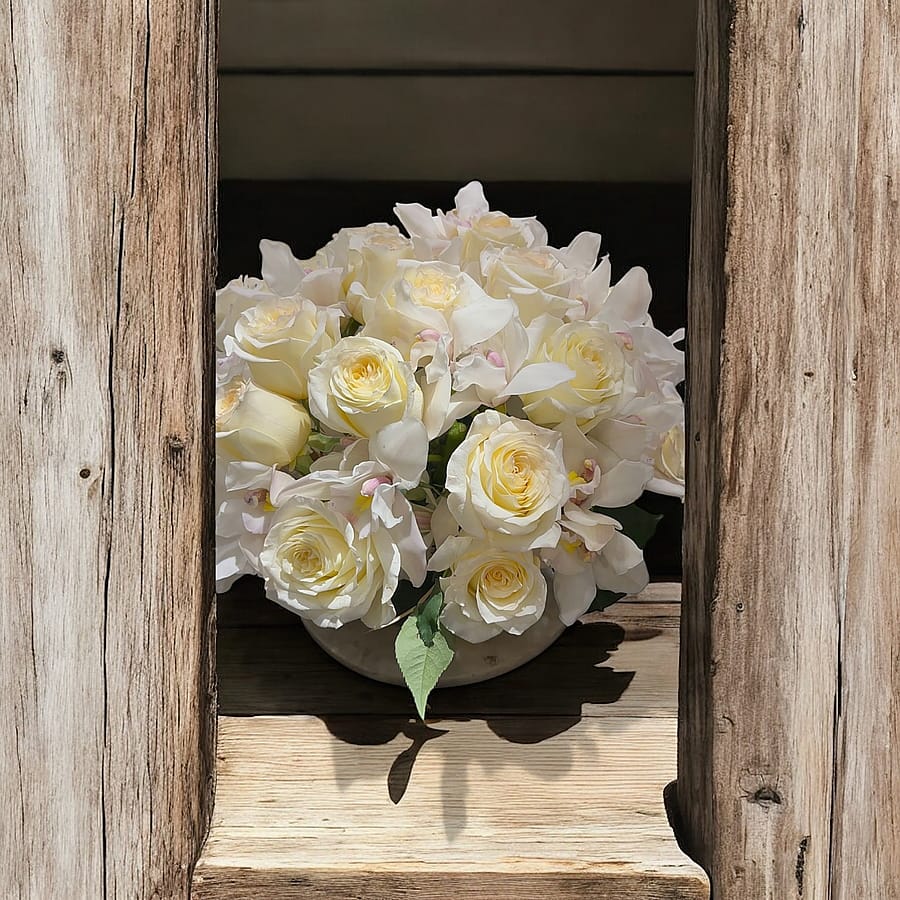 A timeless arrangement of creamy white and soft yellow roses, artfully clustered in a classic round design. Elegant and understated, this piece exudes sophistication and warmth. Perfect for weddings, home decor, or gifting. Its neutral tones and full blooms bring a touch of refined beauty to any space.