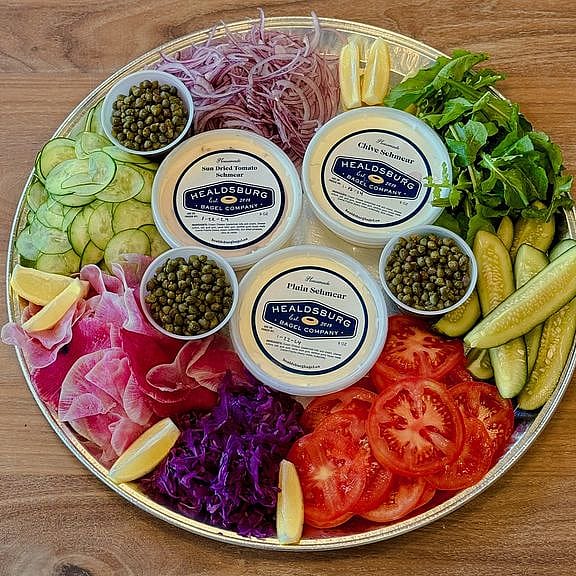 A fresh veggie topping platter with assorted veggies, capers, and schmears