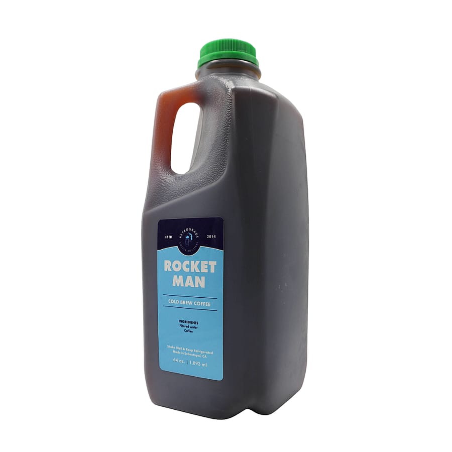 Half-gallon (64 oz) of our Rocket Man Cold Brew, brewed fresh! About 4-5 servings. Keep refrigerated and serve over ice, or heat it up and enjoy it hot. Ingredients: Rocket Man Cold Brew: Cold brewed coffee concentrate, water