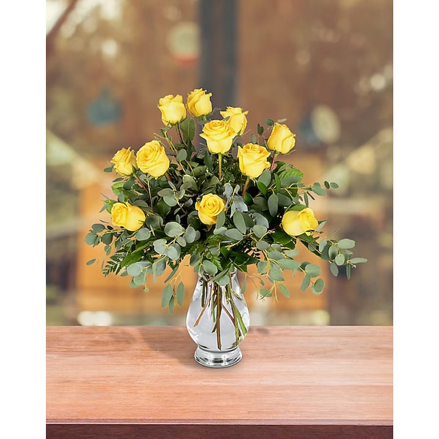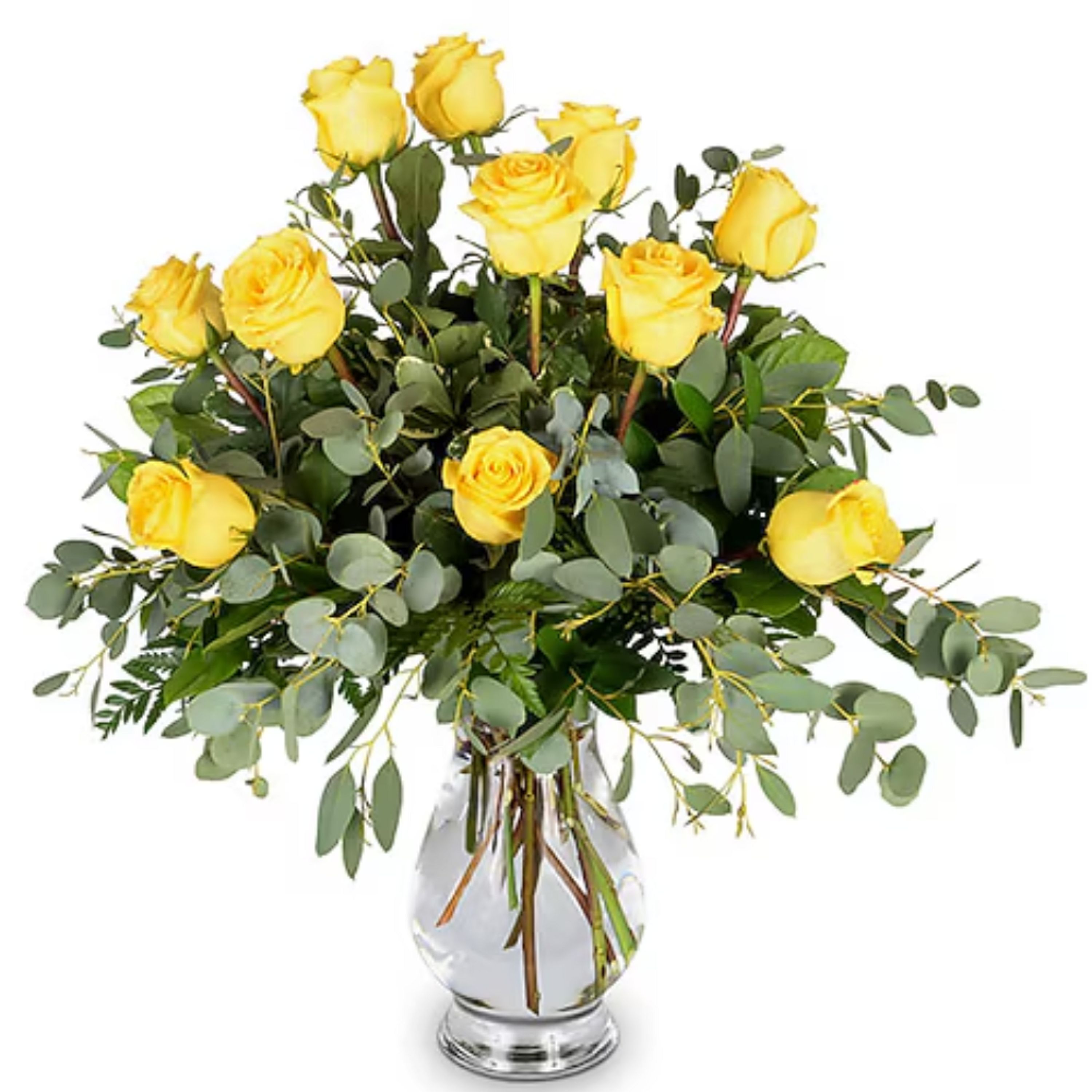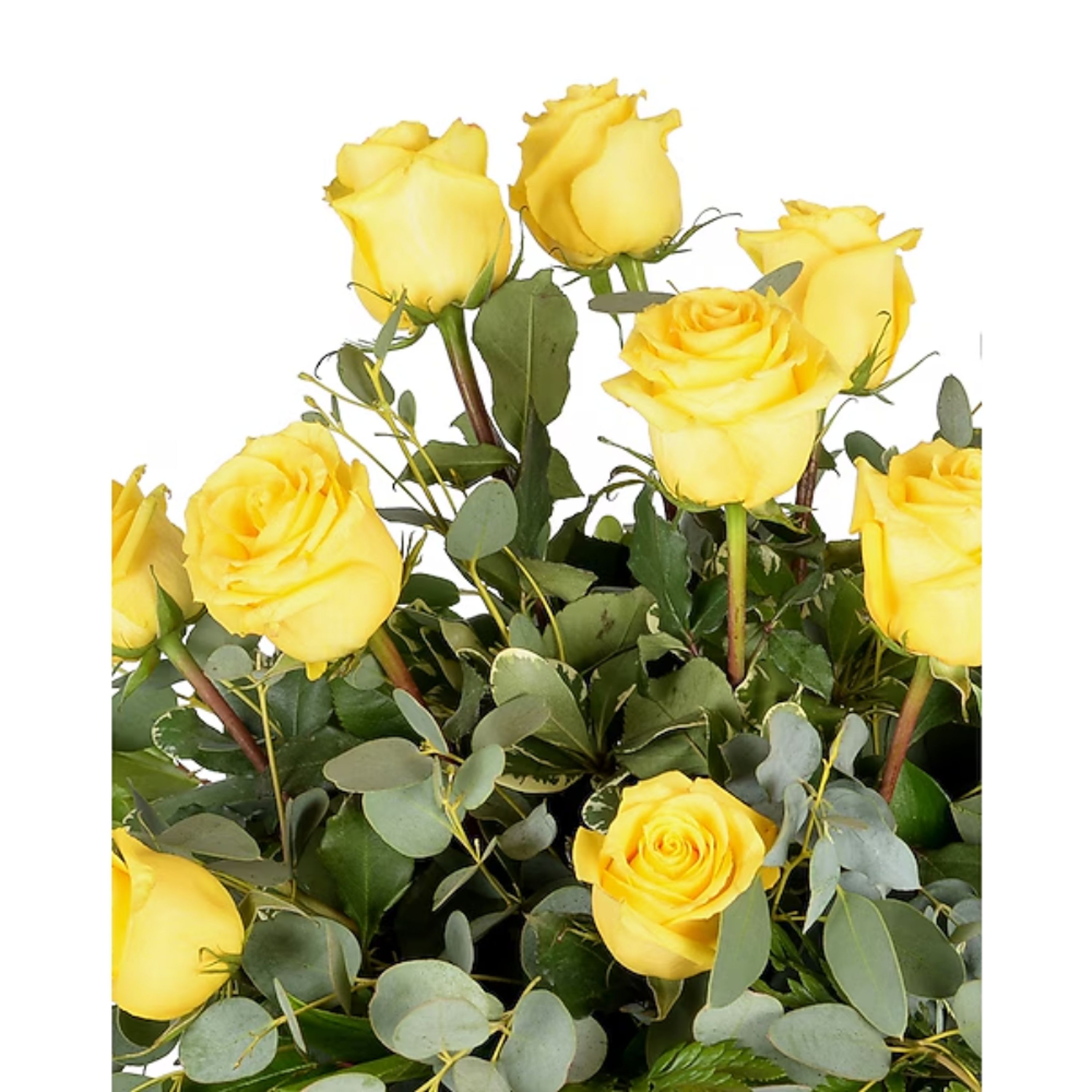 A kiss is on your list. Pucker Up sets the stage for that magic moment. Yellow Roses and Eucalyptus grace our Bella vase in this romantic expression of love. *Approximately 25" W X 29" H