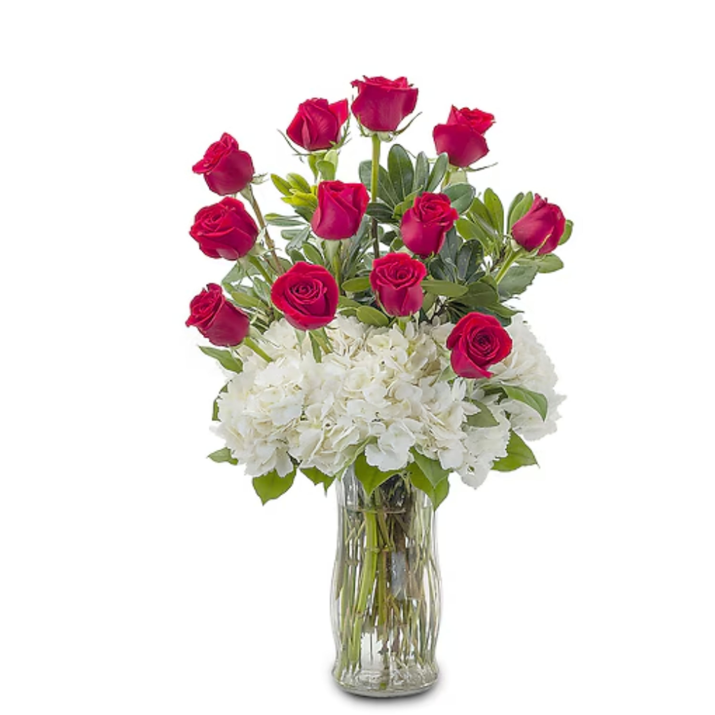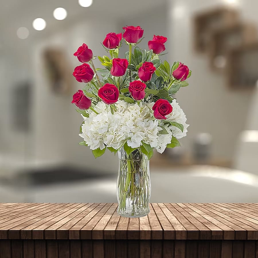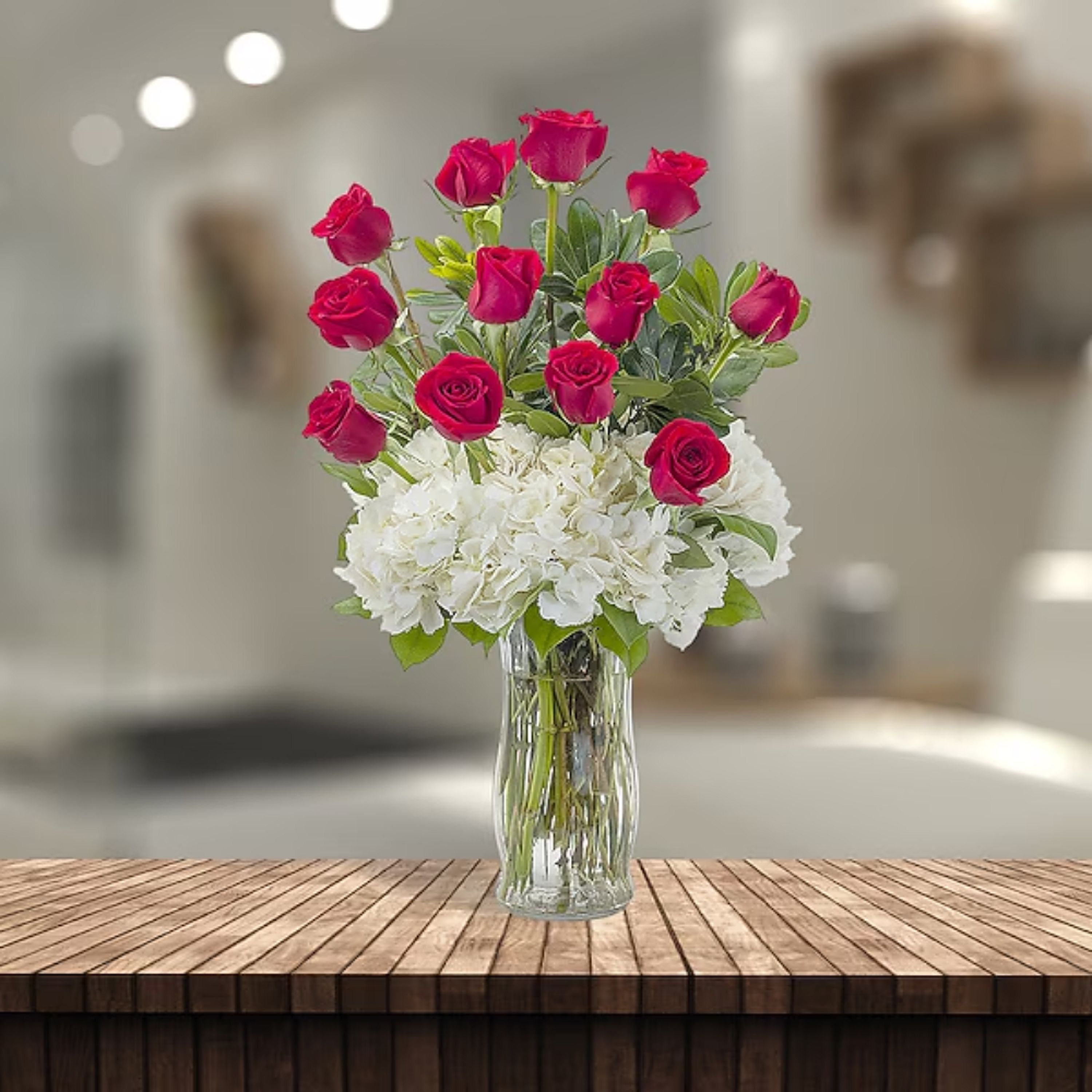 A classically gorgeous arrangement of a dozen red roses, accented with Hydrangea to really make an impression.