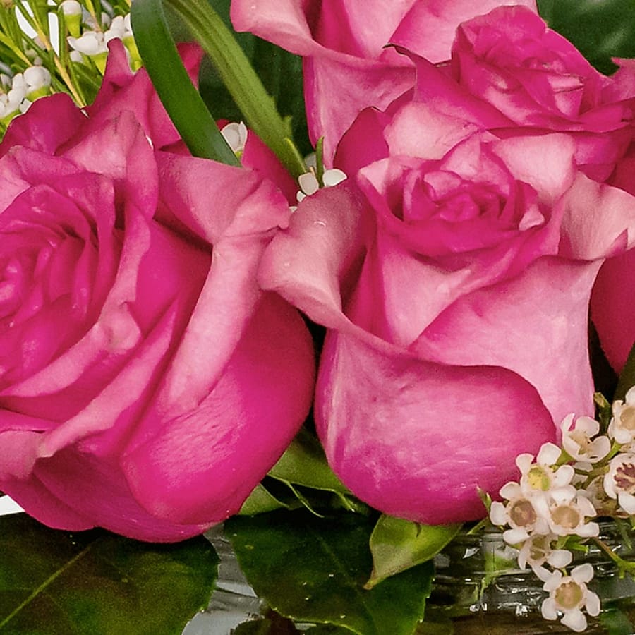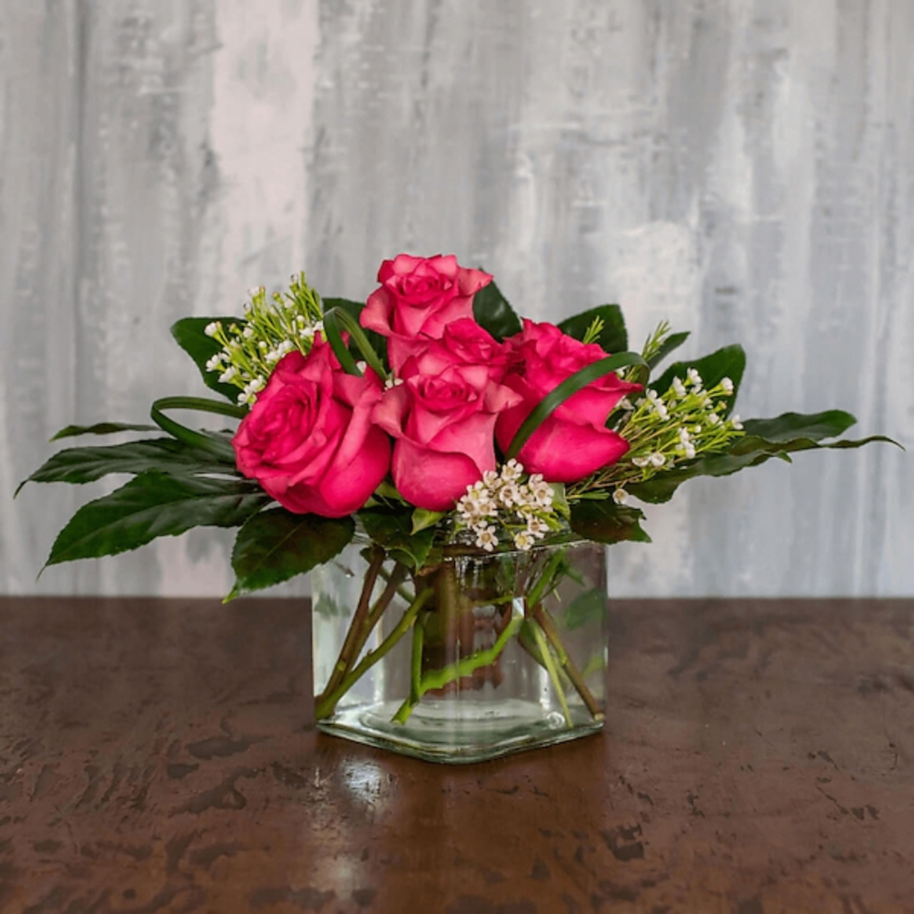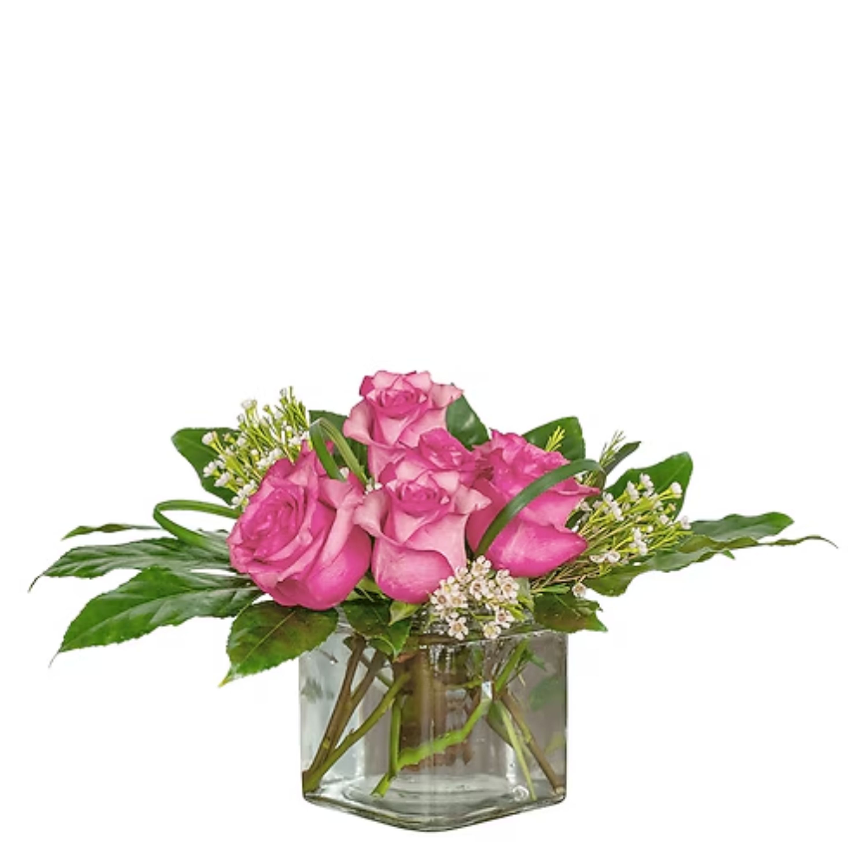 Sleek and stylish. Passionate Pink sends a special message of affection. Flowers like hot pink roses are tastefully arranged in this cube and will accent any space. * Container may vary based upon availability. * Approximately 12"W X 9.5"H