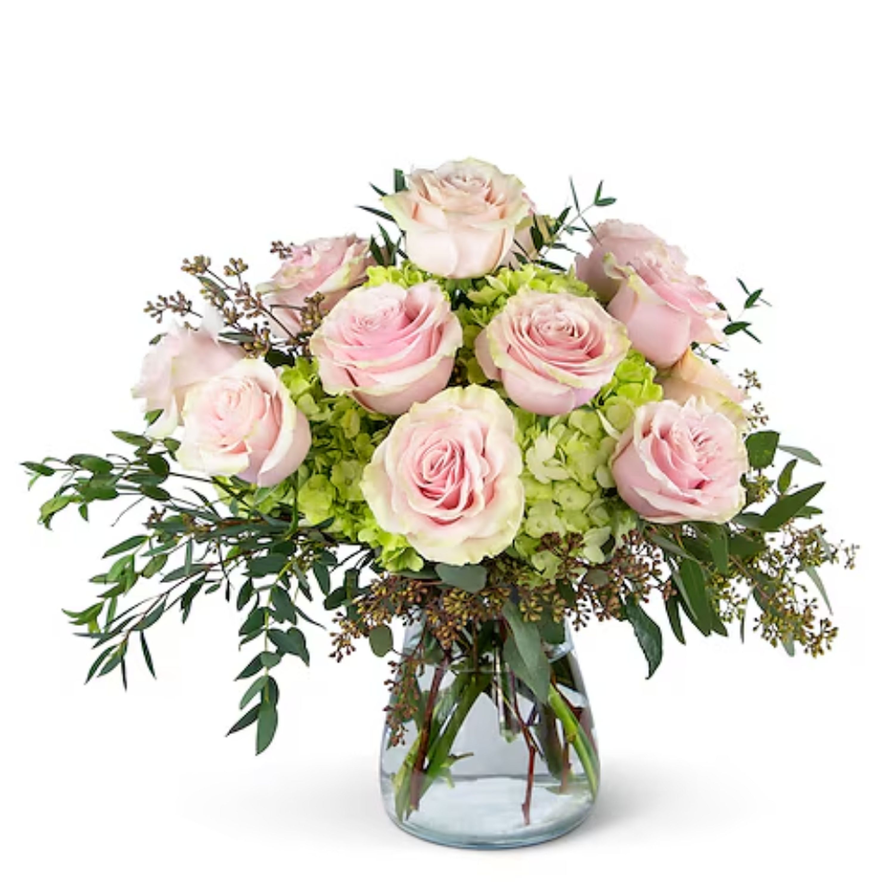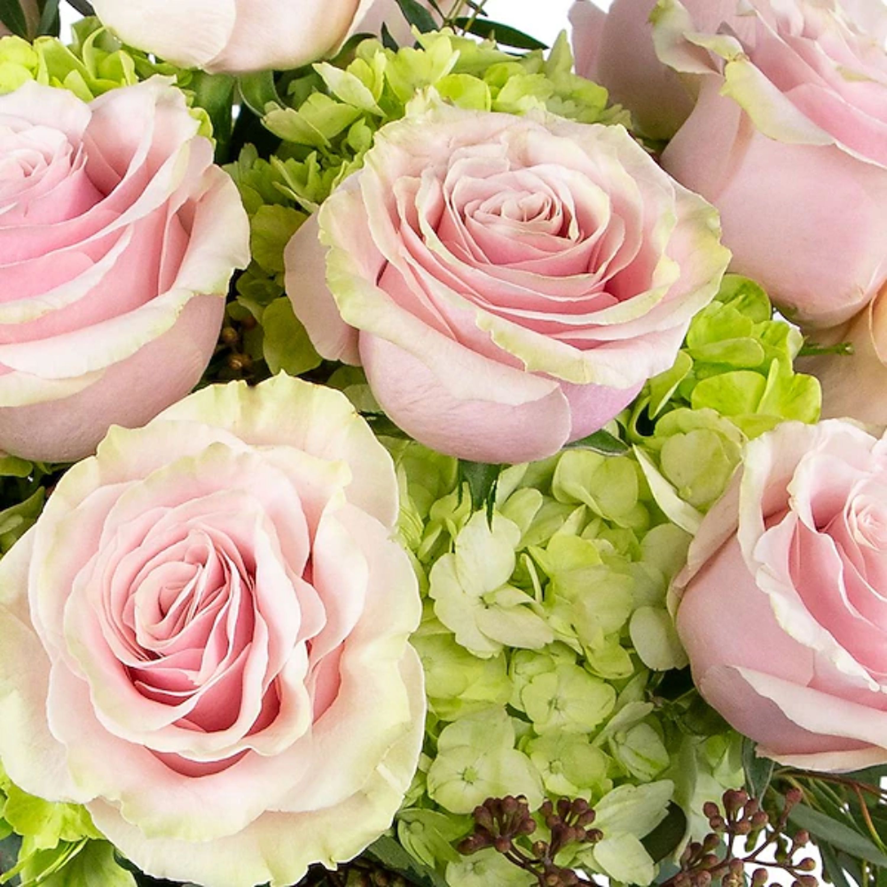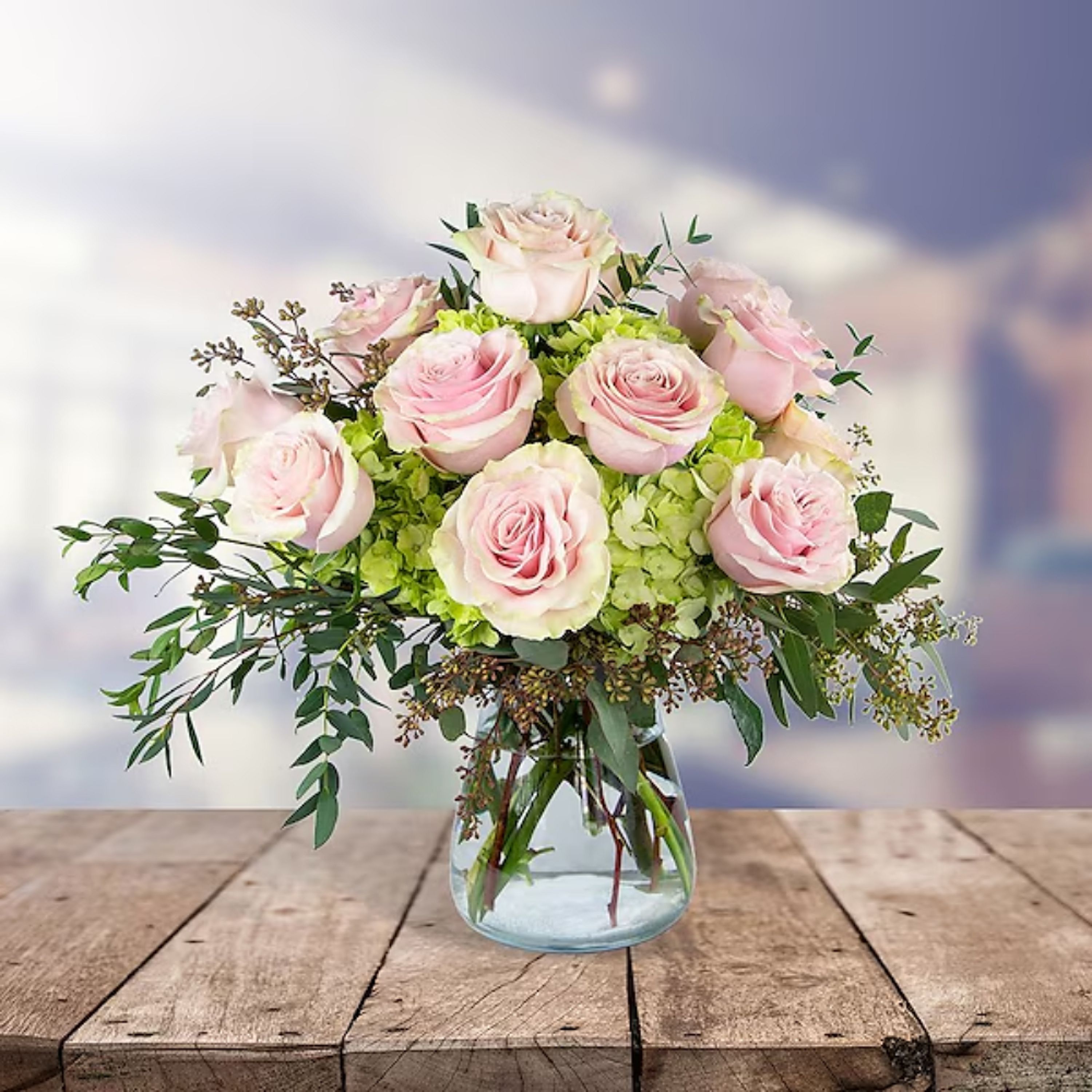 What a pleasant escape from reality! When you send the Dreamy Roses arrangement she will be swept away into a world that is filled with beautiful Soft Pink Roses that sit atop Green Hydrangea and Premium Greenery.