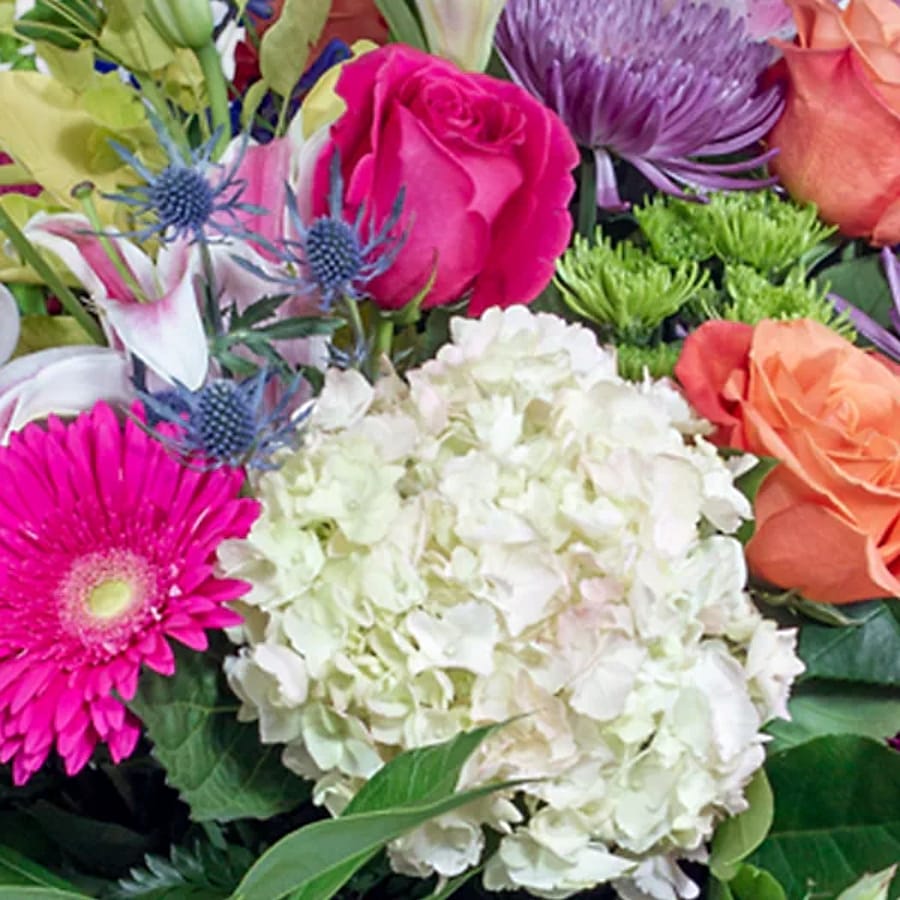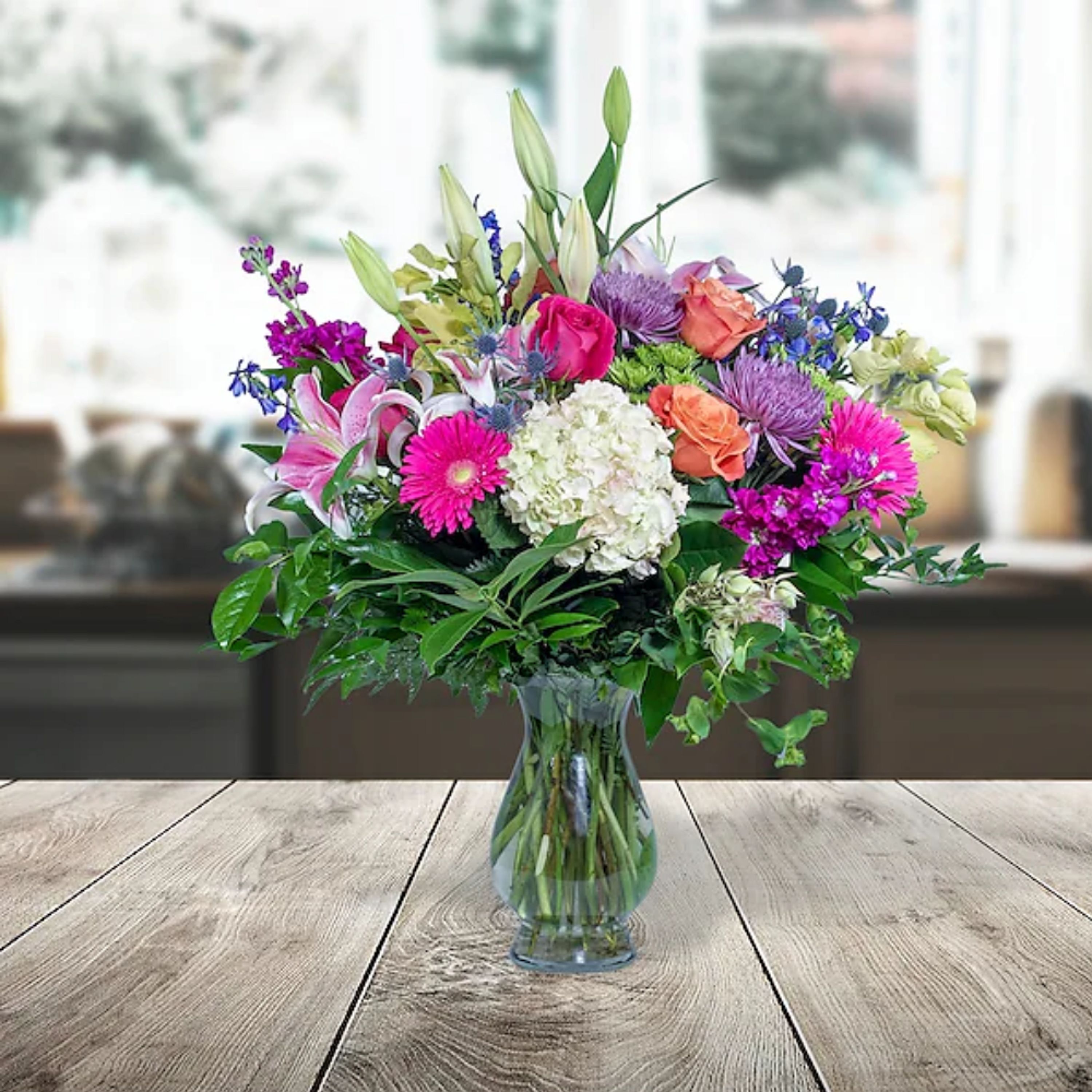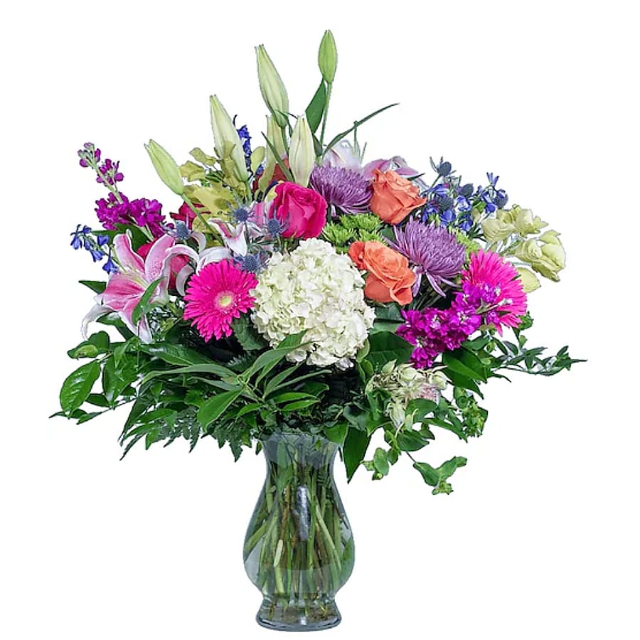 They rock your world. Love You to the Moon will express your devotion. A white hydrangea takes center "space" among stargazers, roses, and other flowers in our Bella vase. *Approximately 27"W X 32"H