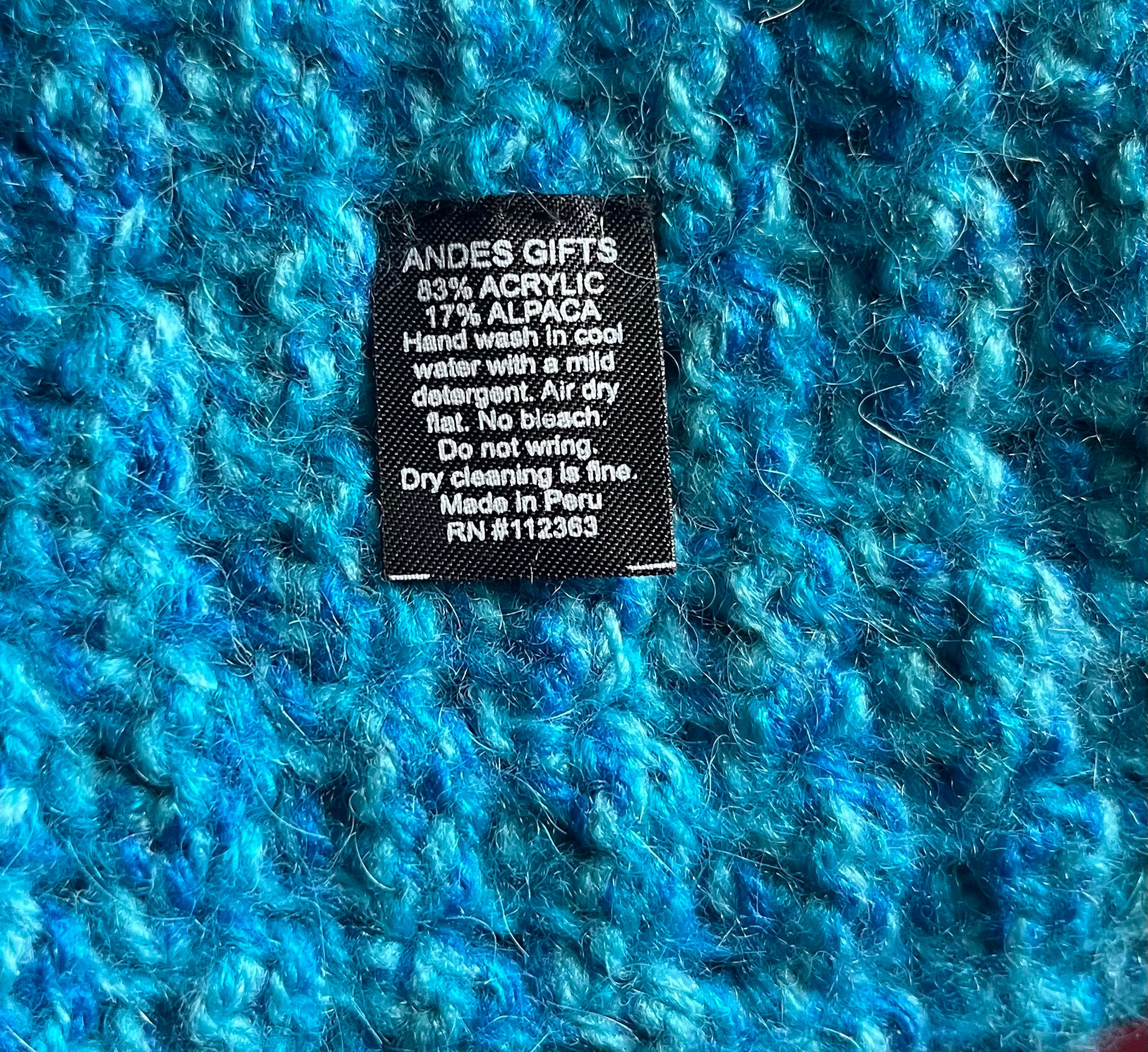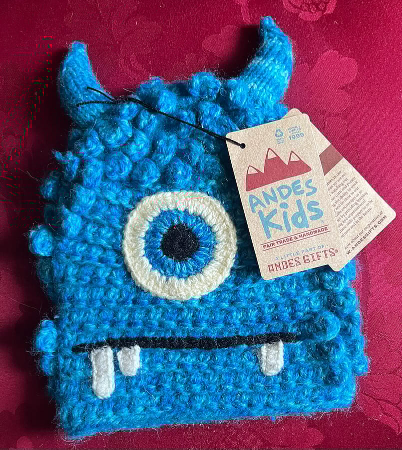 Hand-knitted by local artisans. Each item includes a card that tells you a little about who handcrafted the item. Fair trade from Peru.